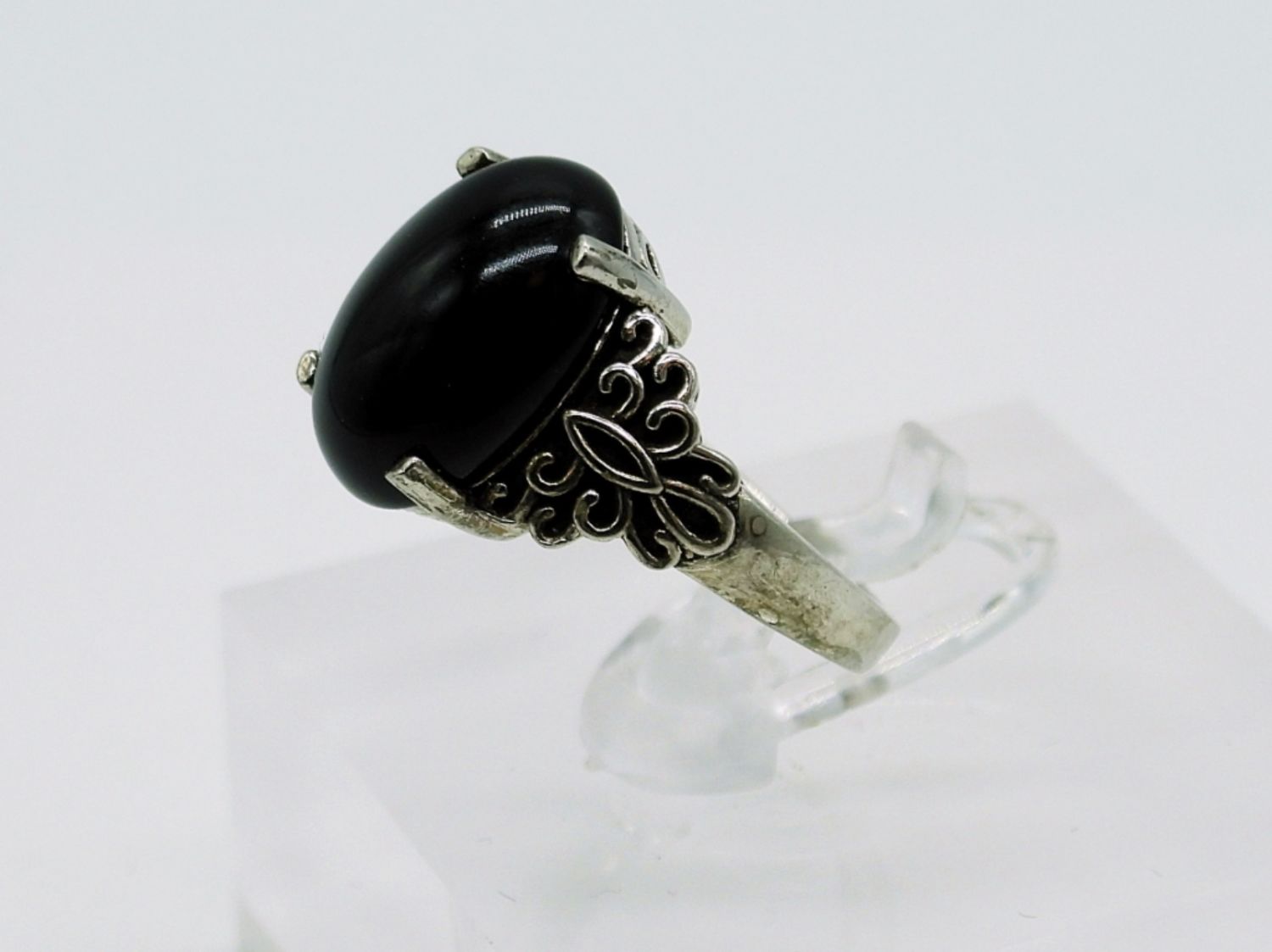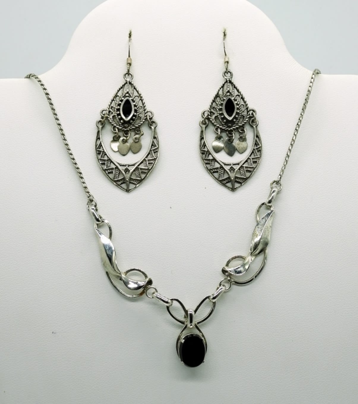 Sterling Silver Onyx Colored Gemstone Necklace 14 inch, Pierced Earrings and Sterling Onyx Ring size 6. 11.1DWT