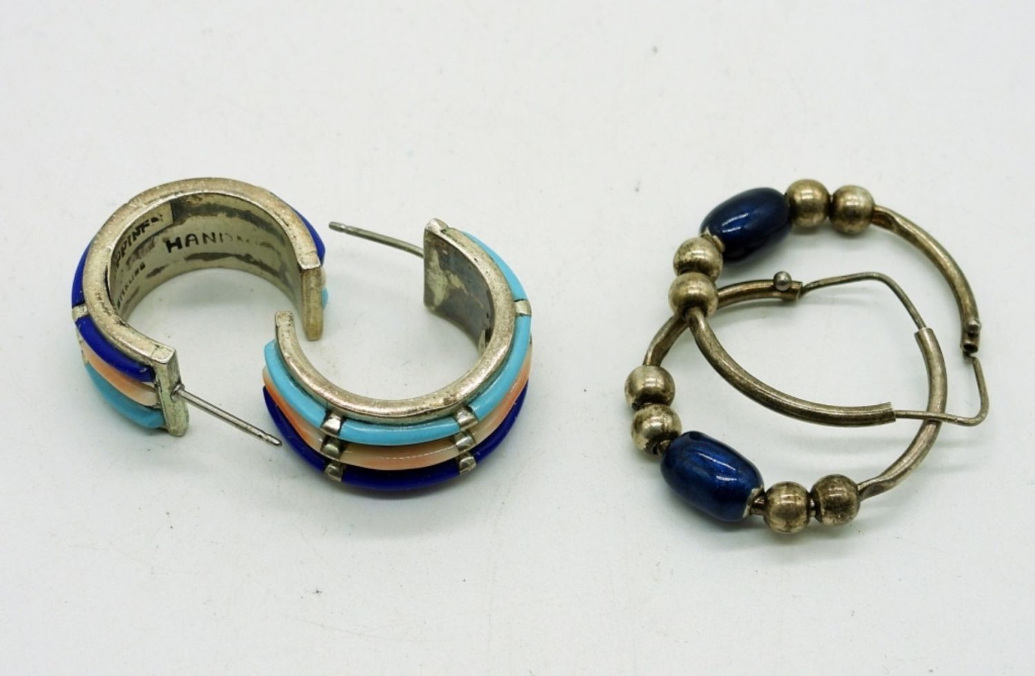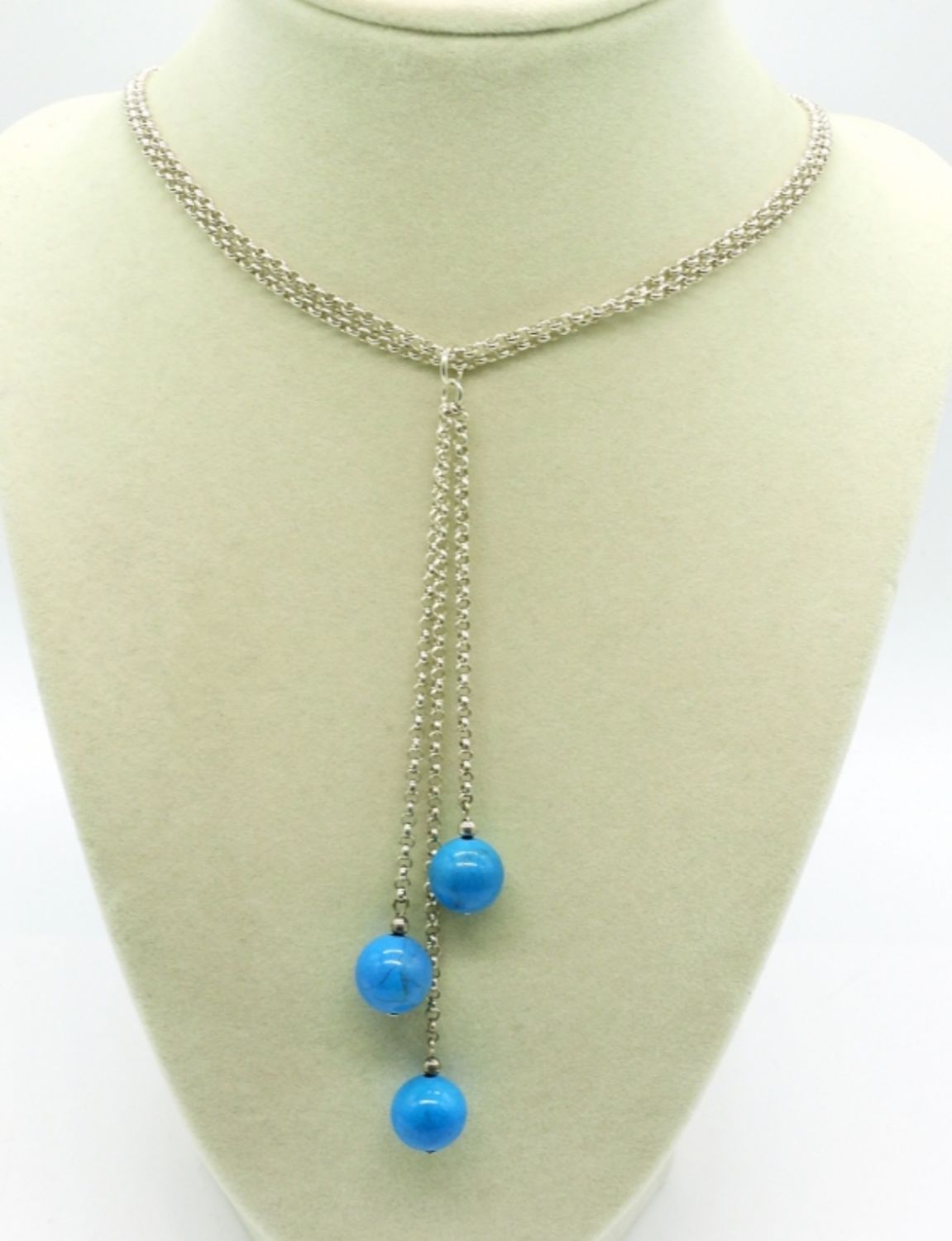 19 inch Sterling Necklace with 3 Blue Beads. Two Sterling Pierced Earrings with Blue and Silver Accent Beads. 26.1DWT