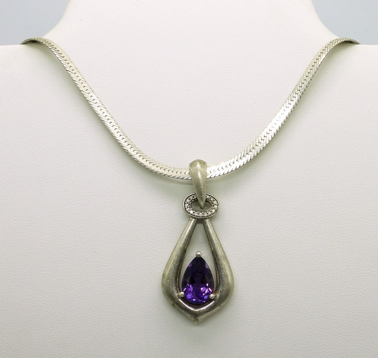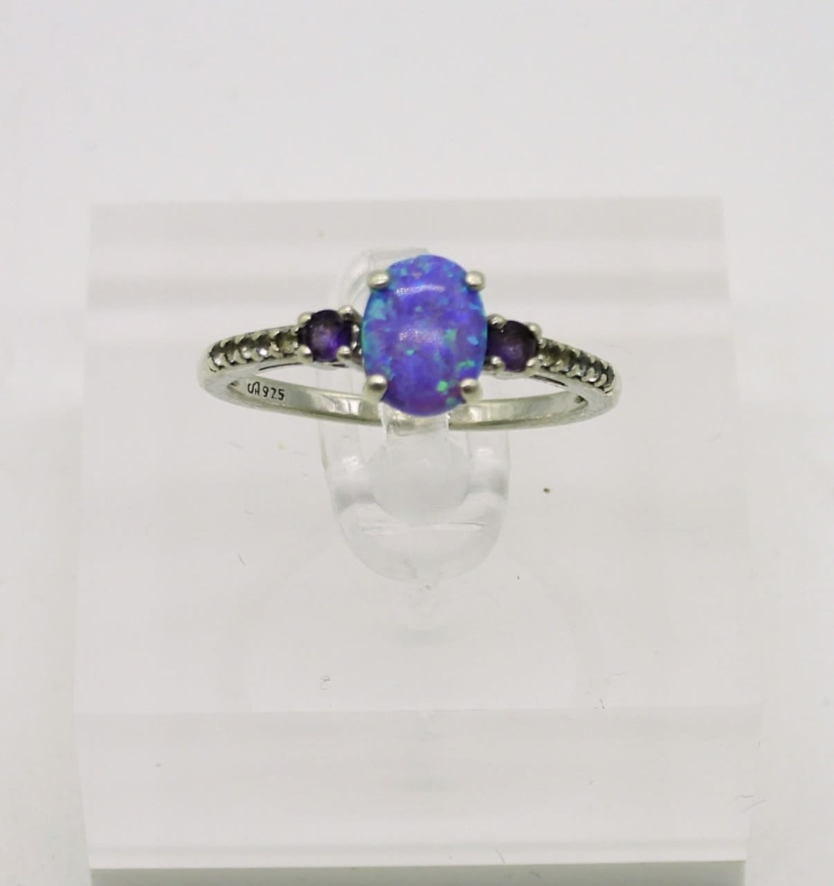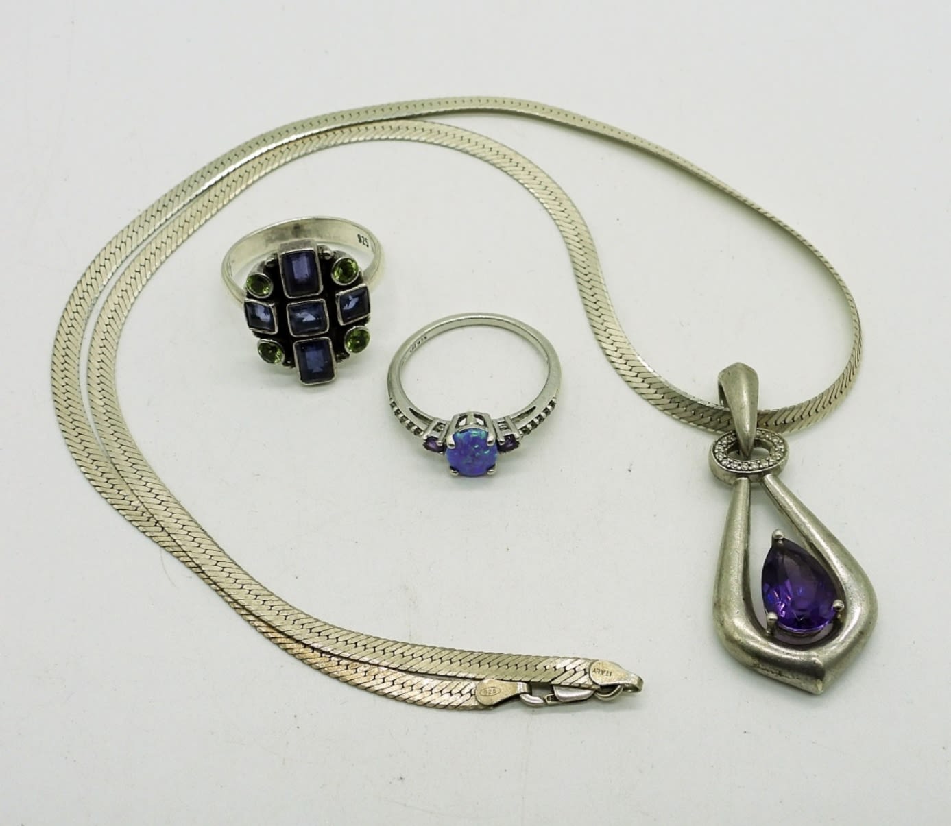 Sterling Silver 18 inch Chain with Amethyst Colored Gemstone Pendant. Two Purple Gemstone Rings Sizes 6.5 & 8. 13.3DWT