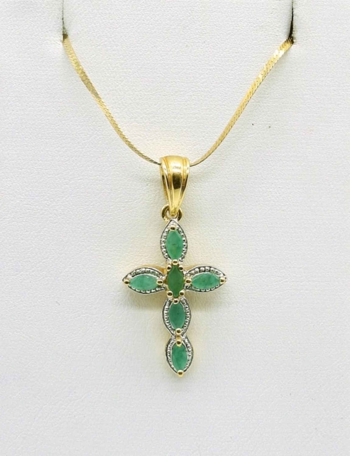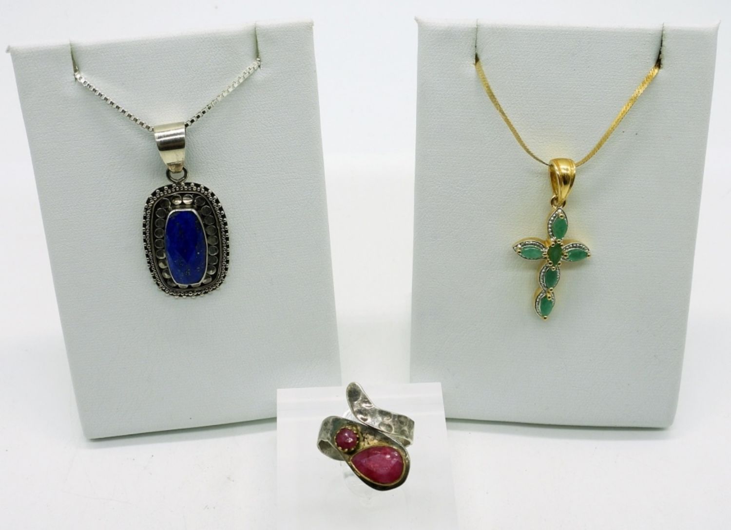 Natural Sapphire Sterling Necklace, 22 inch chain. Natural Emerald Stones in a Gold Tone Sterling Cross Necklace, 16 inch chain. Natural Ruby Sterling Silver & Gold Tone Ring Size 9-10. 10.6DWT