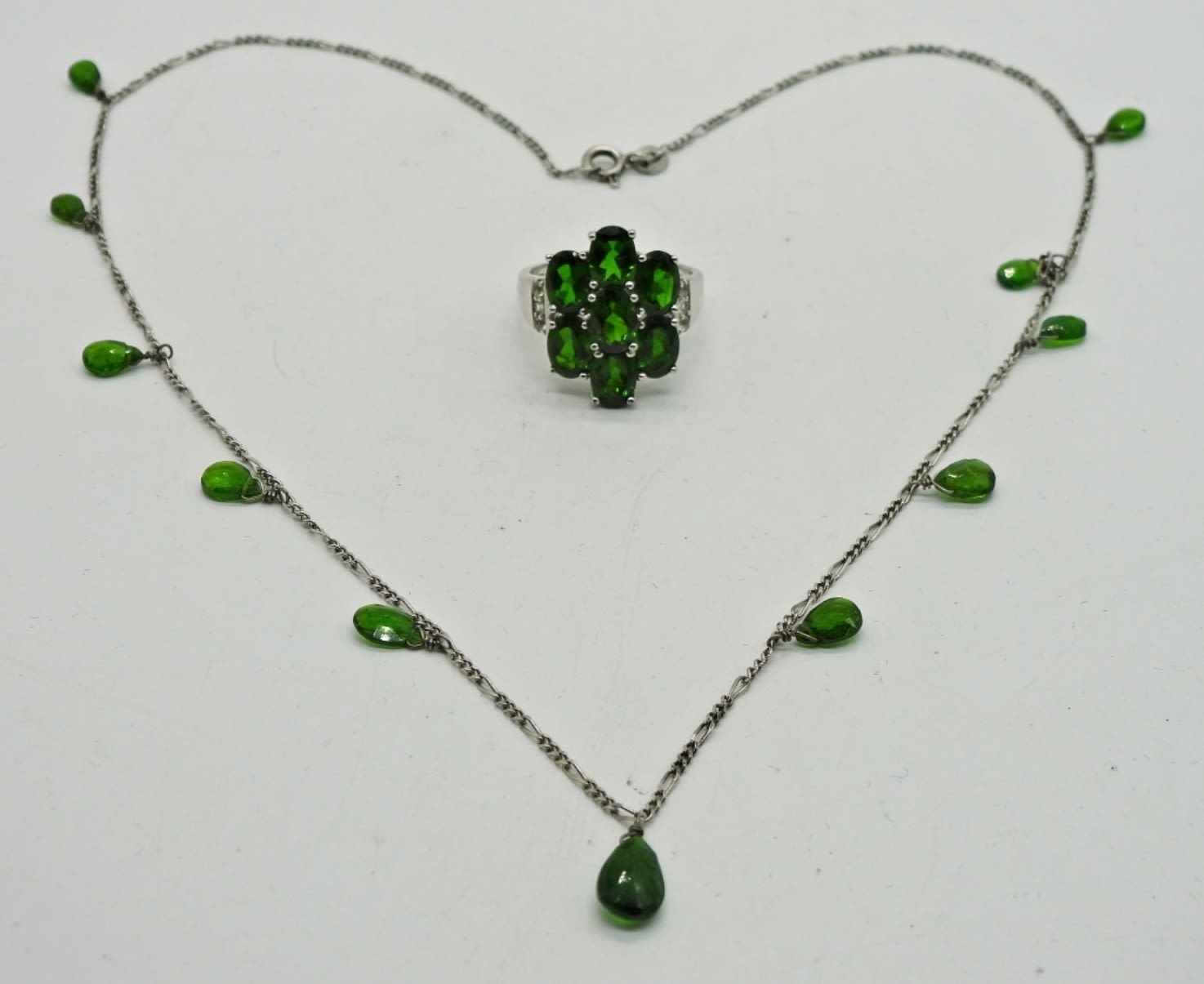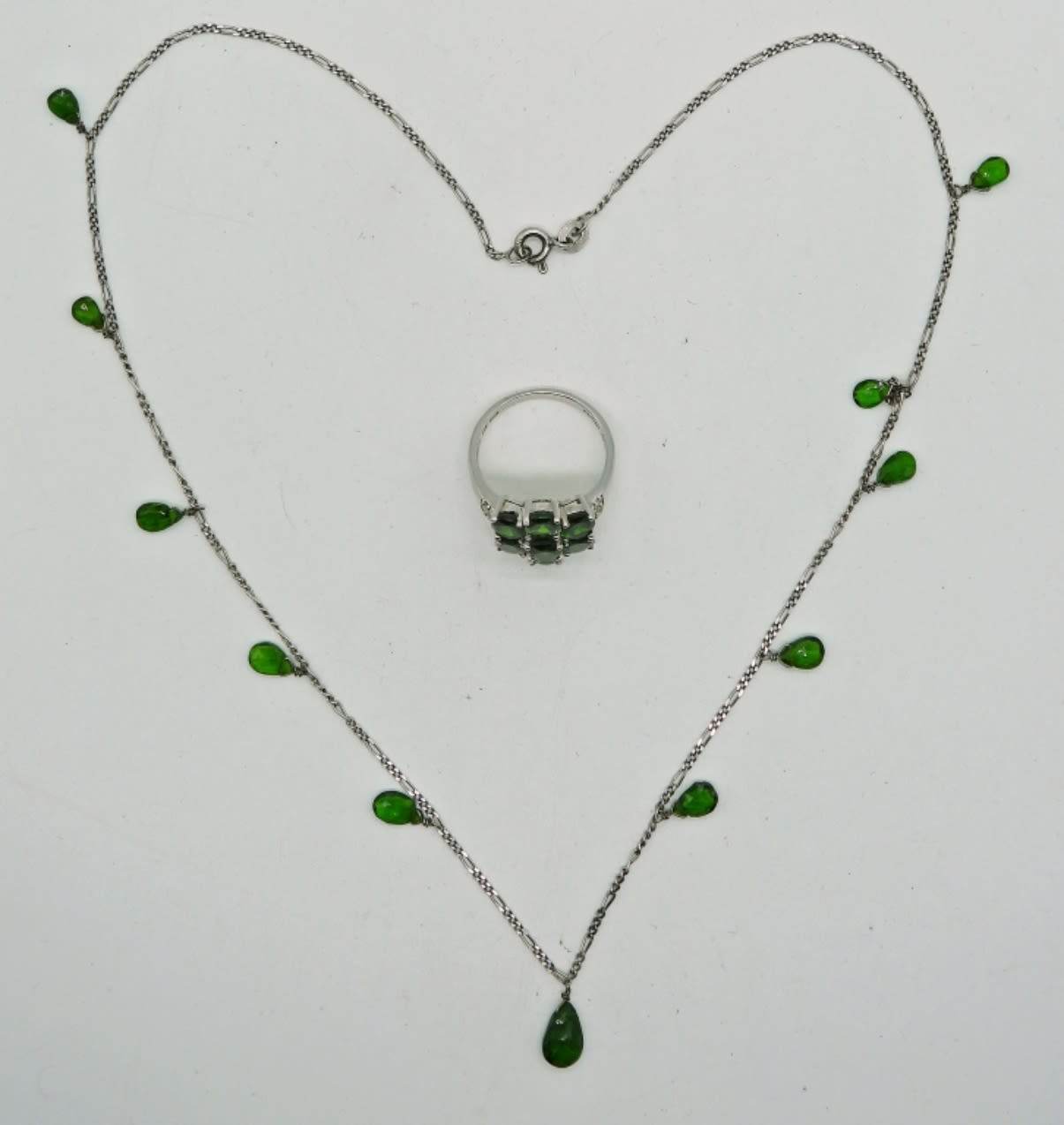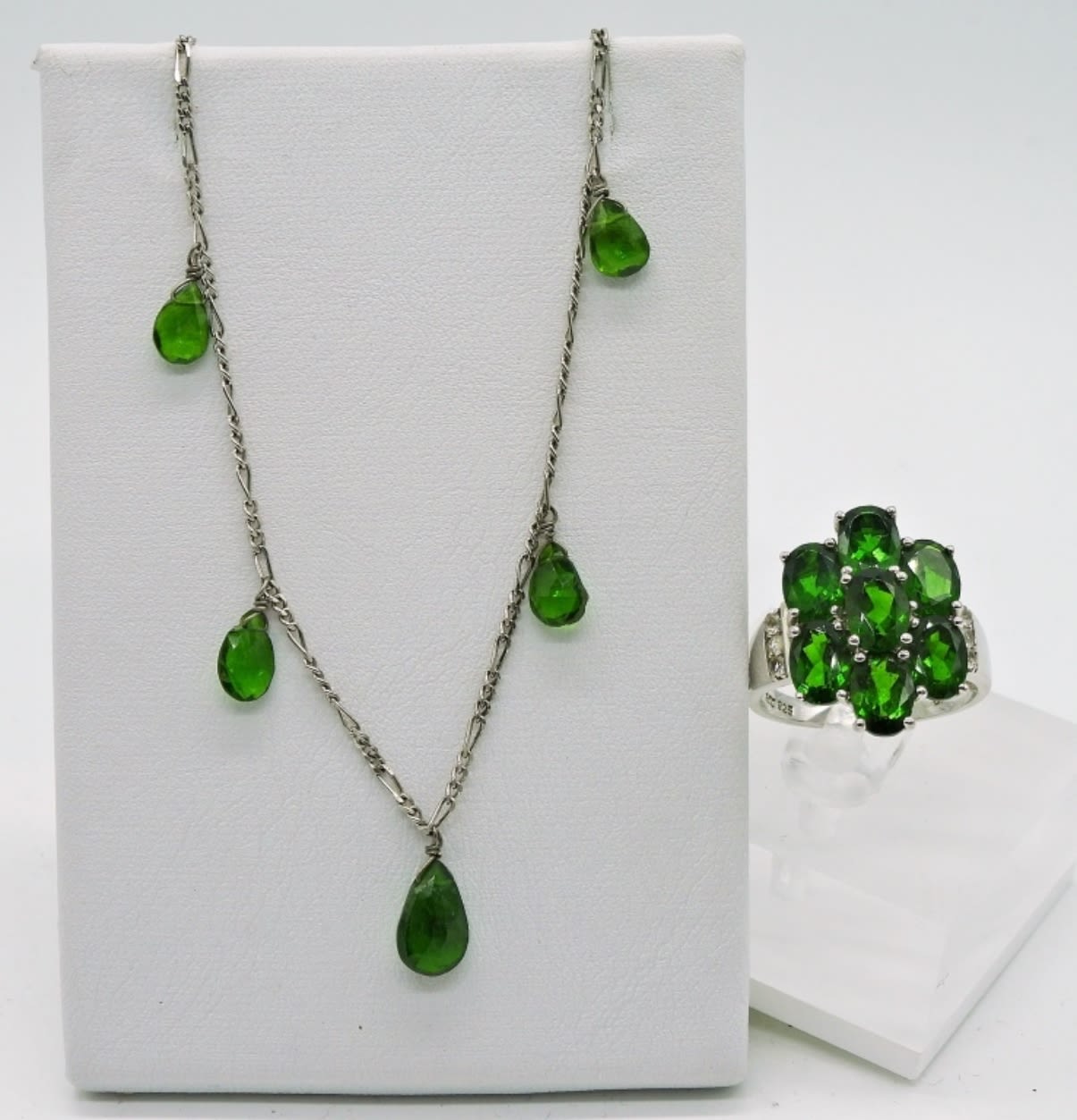 Sterling Necklace with Green Droplet Gemstones, 17 inches. Sterling Ring size 8 with Beautifully Green Gemstones. 5.6DWT