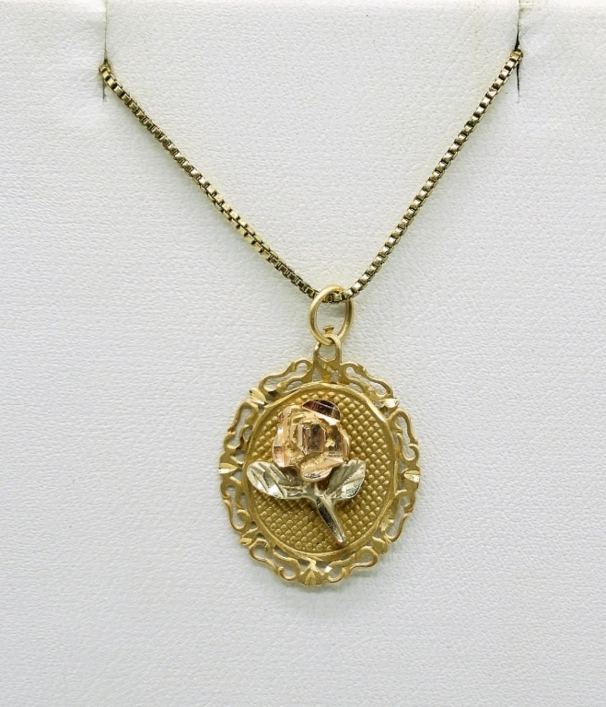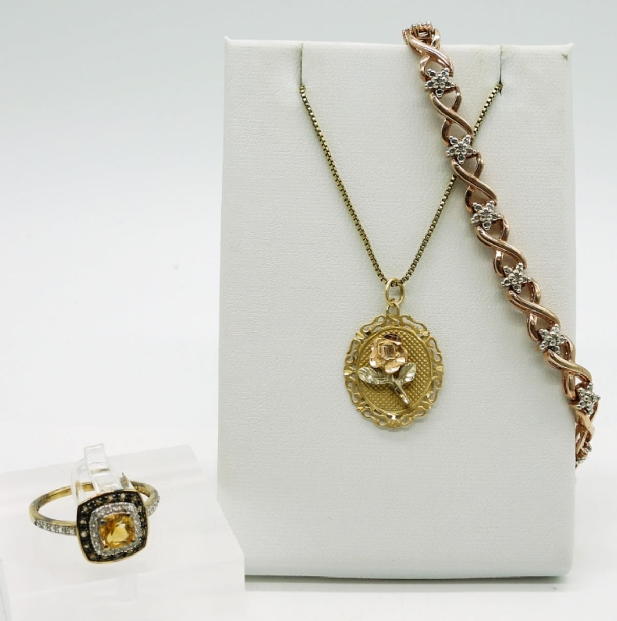 Sterling/14KGP, 16 inch Gold Tone Necklace with Gold Tone Rose Pendant. Sterling 7 inch Rose Gold Tone Bracelet. Sterling Gold Tone Size 7 Ring with Yellow Center Stone. 11.3DWT