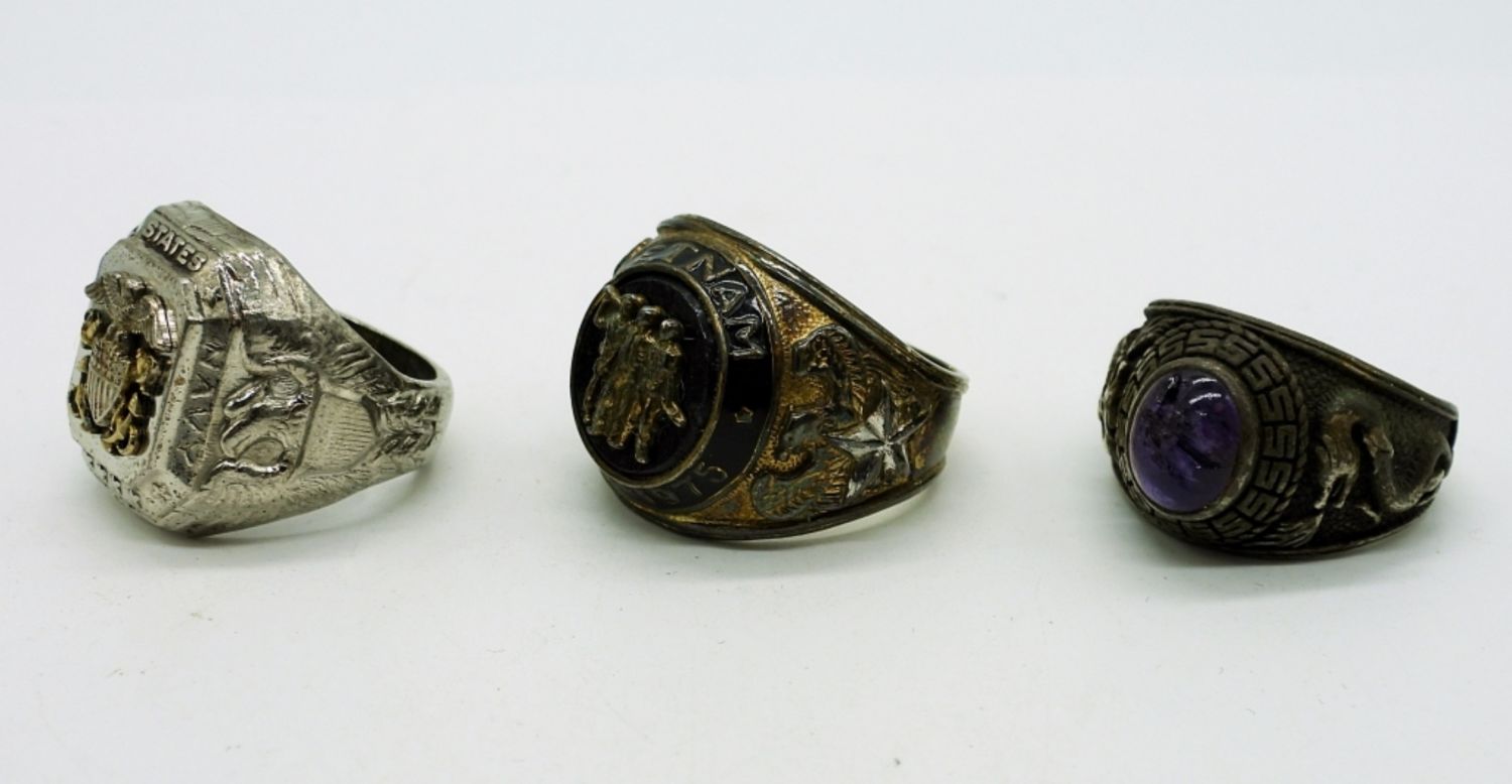 Sterling Vietnam Black Enamel Ring, Size 11. Sterling U.S. Navy Ring Size 9. Sterling Dragon Ring with Broken Purple Stone Size 9 3/4. 25.7DWT