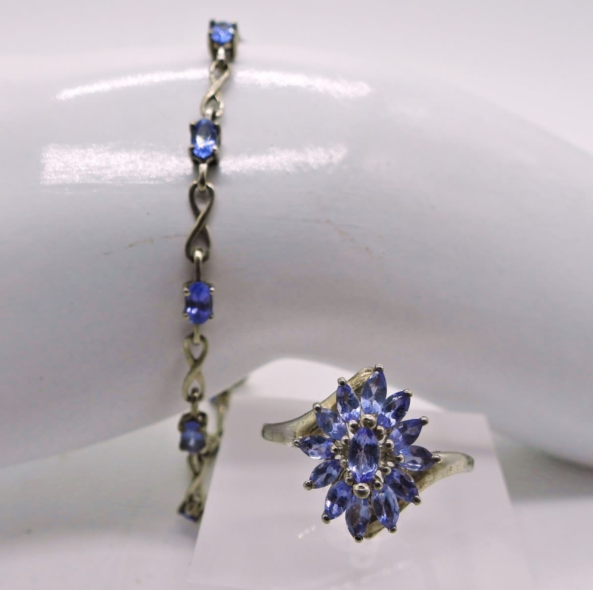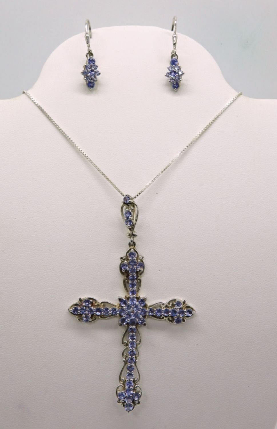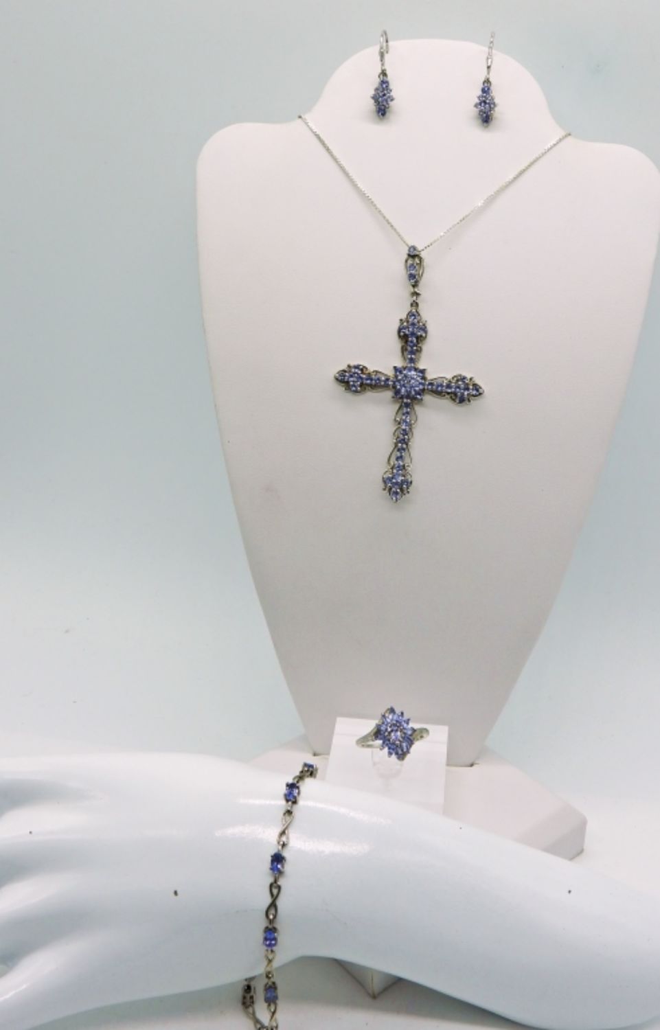 Sterling Amethyst Cross Necklace, 19 inch. Sterling 7 inch Amethyst Bracelet. Size 8 Sterling Amethyst Ring with Matching Drop Earrings. 11.9DWT