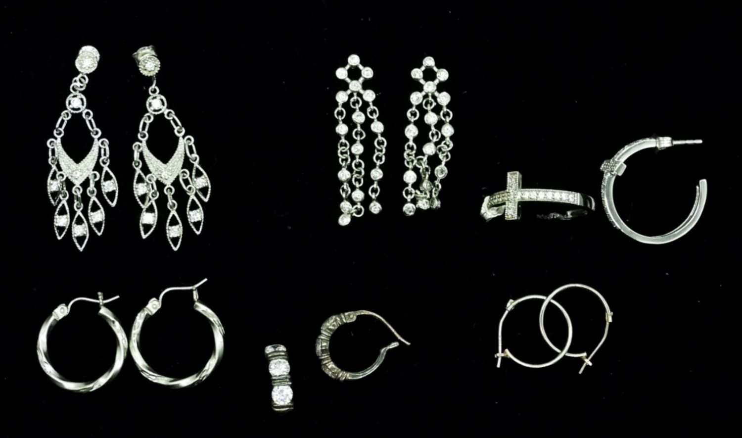 Six Pair of Sterling Silver Pierced Stud and Hoop Earrings with Clear Gemstone Accents. 10.2DWT