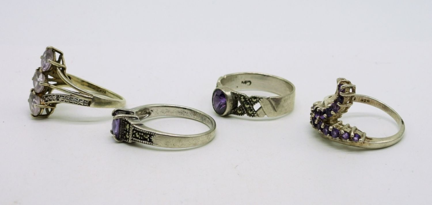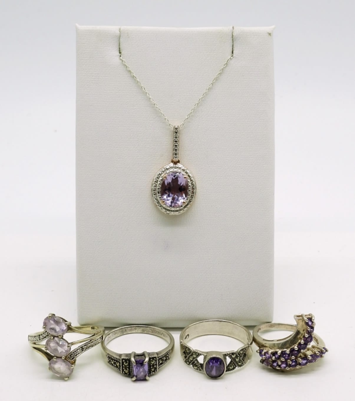 Four Sterling Silver Rings with Pink & Purple Gemstones. Purple Gemstone, Sterling Necklace, 16 inch chain. 11.3 DWT