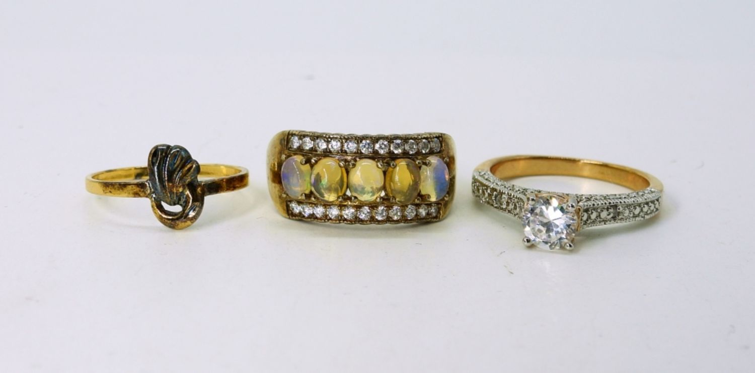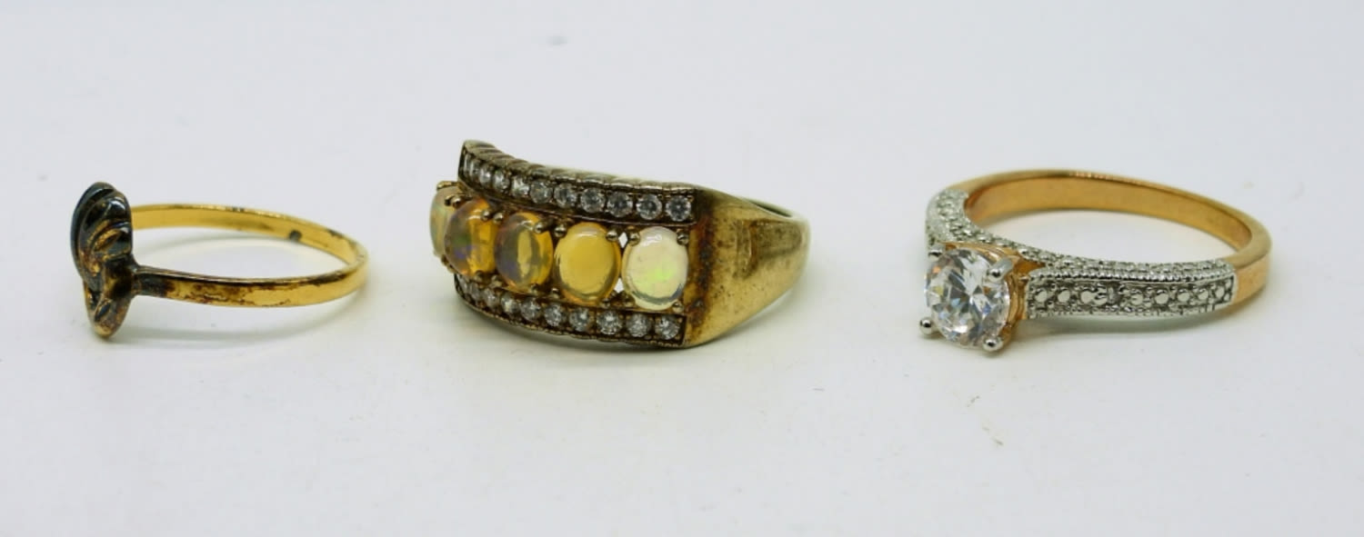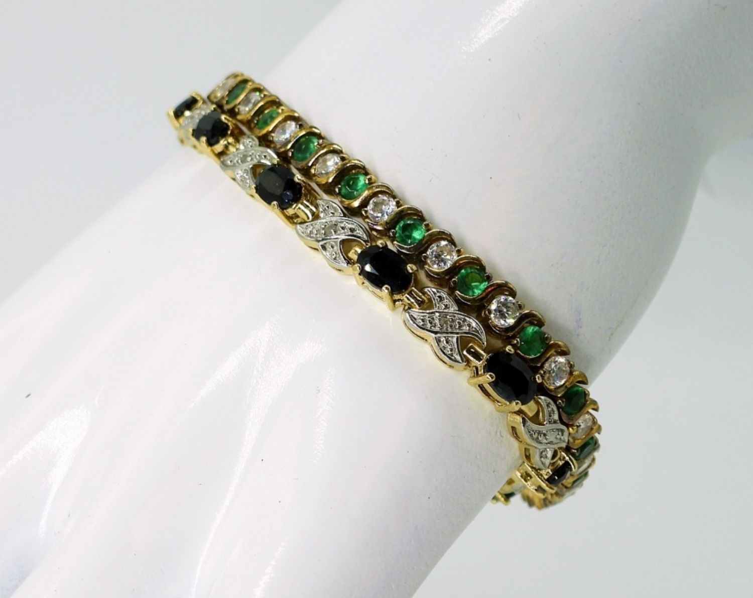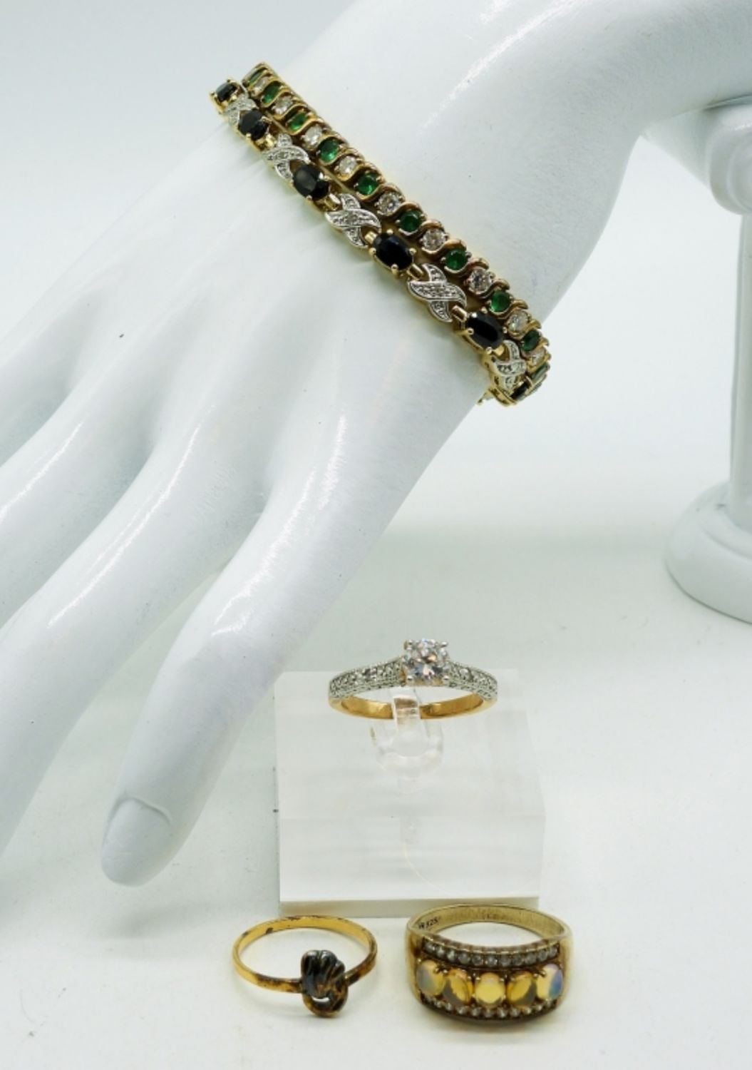 Two Gold Tone Sterling Gemstone Bracelets, 7 inches. Three Gold Tone Sterling Rings with Gemstones. Sizes 7, 8 & 9. 21.4 DWT