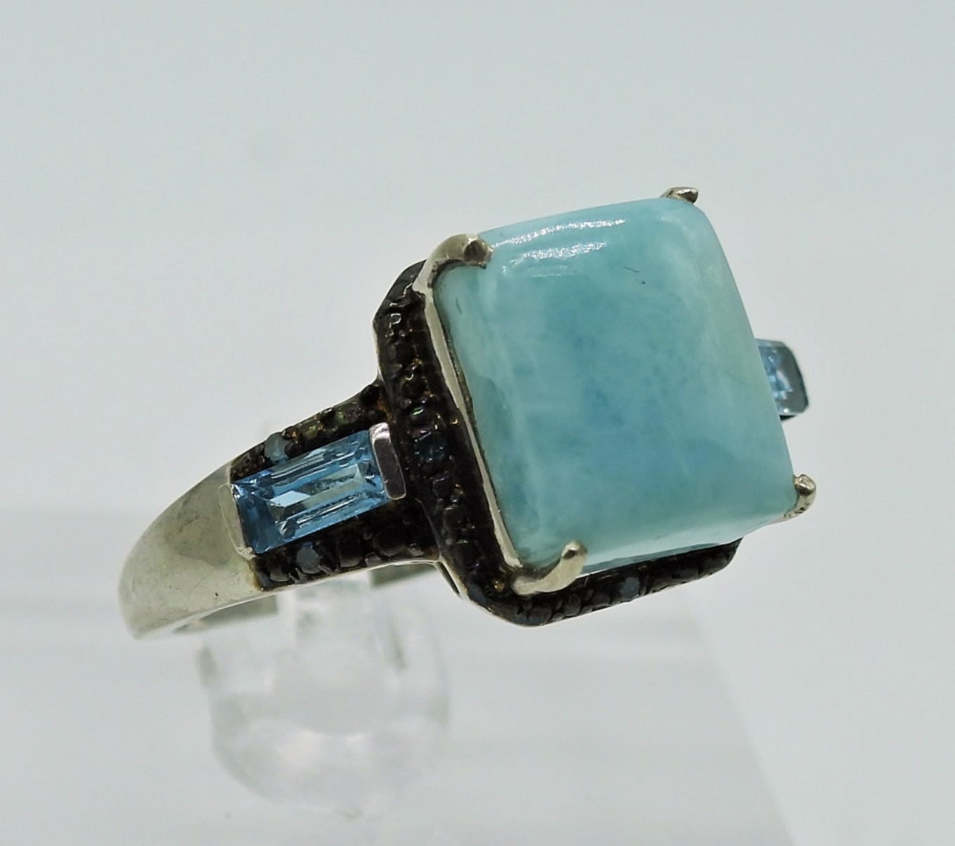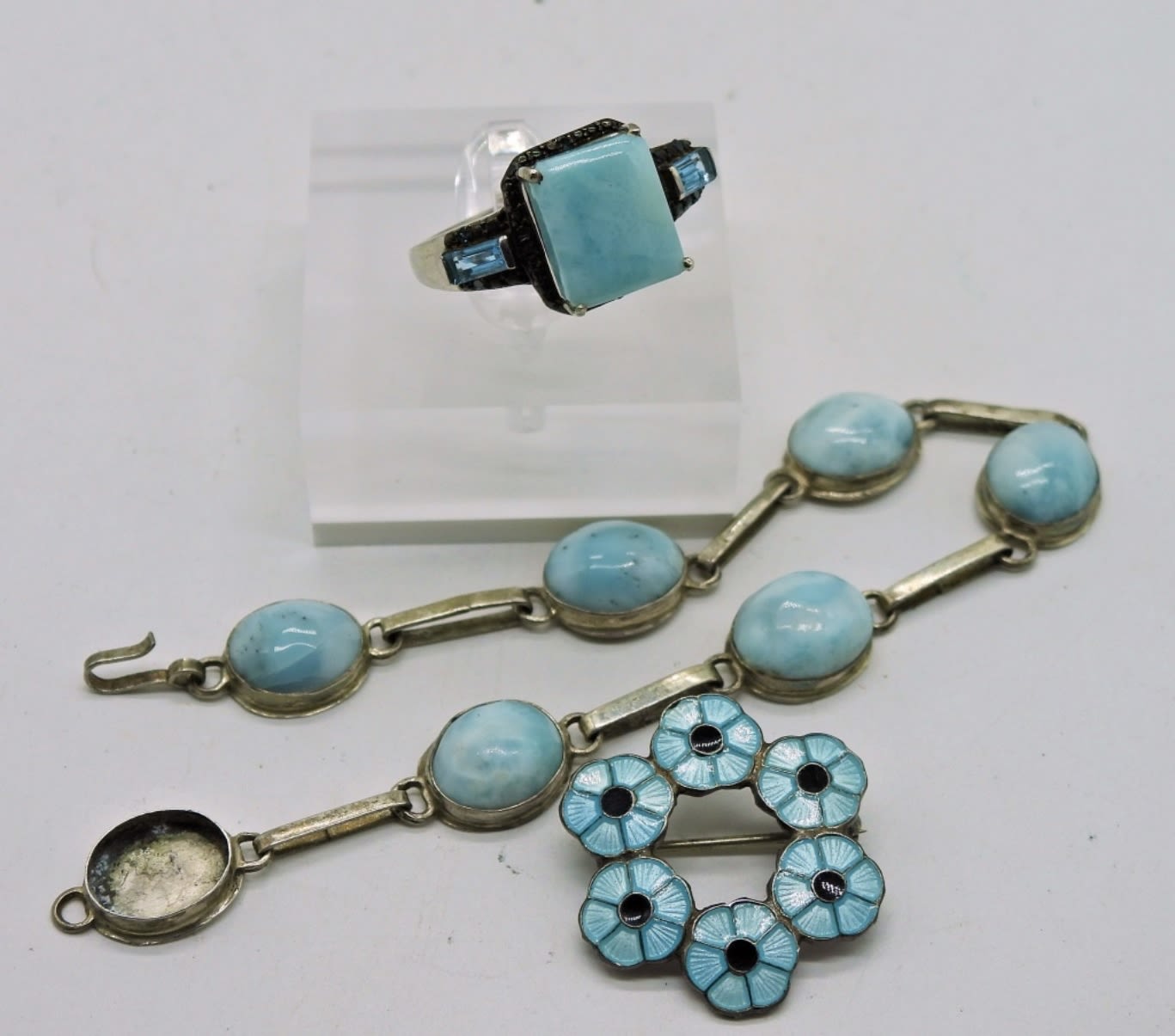 Two Sterling Necklaces, 19 and 29 Inches with Larimar Pendants. Size 9 Sterling Larimar Ring with Aquamarine colored Gemstones. 7 inch Larimar Bracelet (MISSING ONE STONE) and Blue Flower Pin. 24DWT