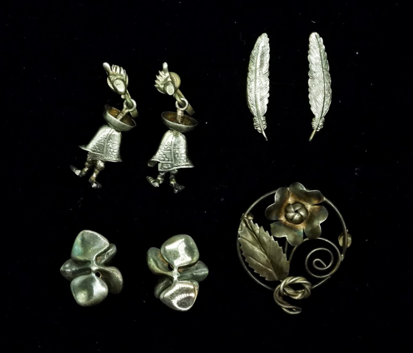 1- Flower Pierced Sterling Earrings. 2- Feather and Guy in a Sombrero Screw Back Sterling Earrings. 3- Sterling Flower Pin (Back is Broken). 16 DWT