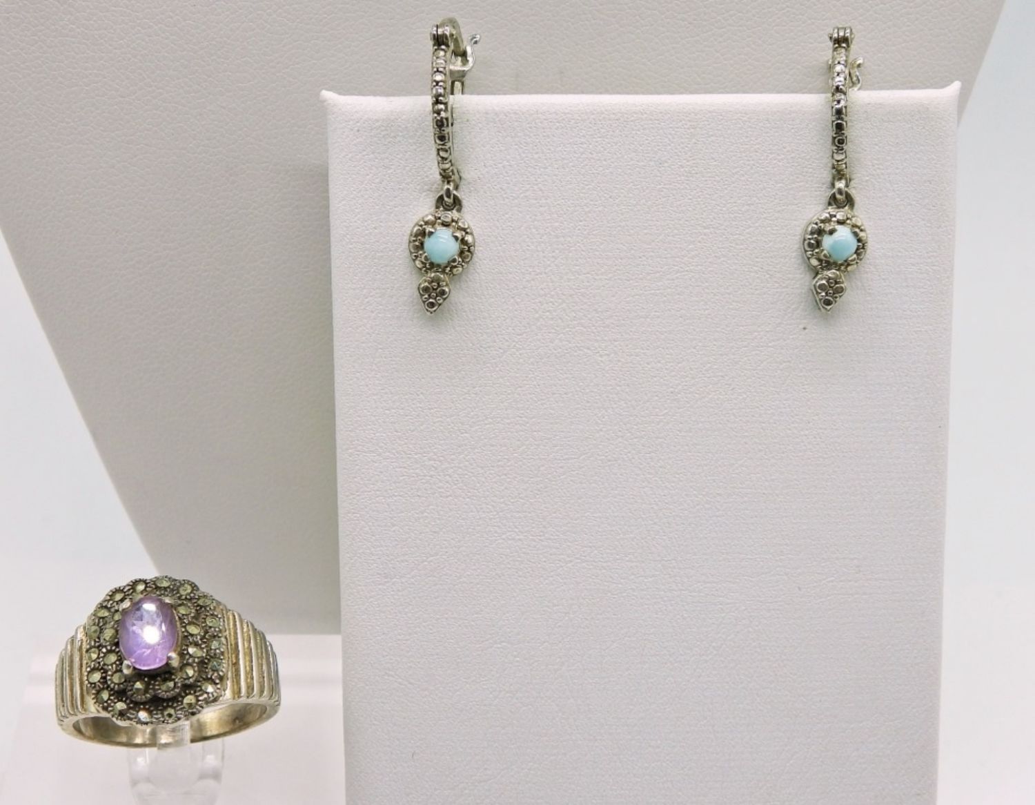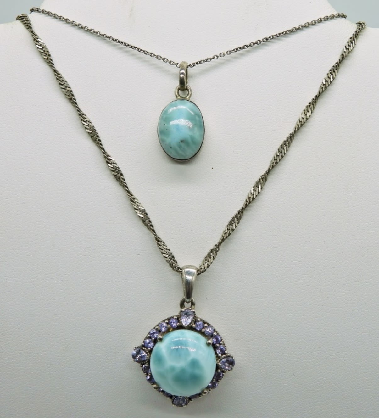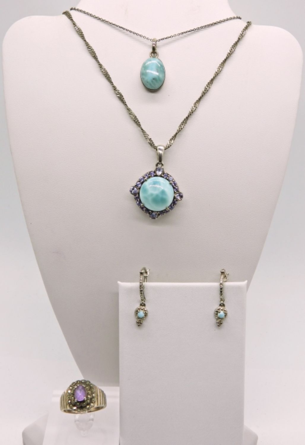 Two Sterling Necklaces, 22 and 15 Inches with Larimar Pendants & Amethyst Colored Gemstone Accents. One Size 8 Sterling Amethyst Colored Gemstone Ring. Small Larimar Pierced Earrings. 16.7DWT