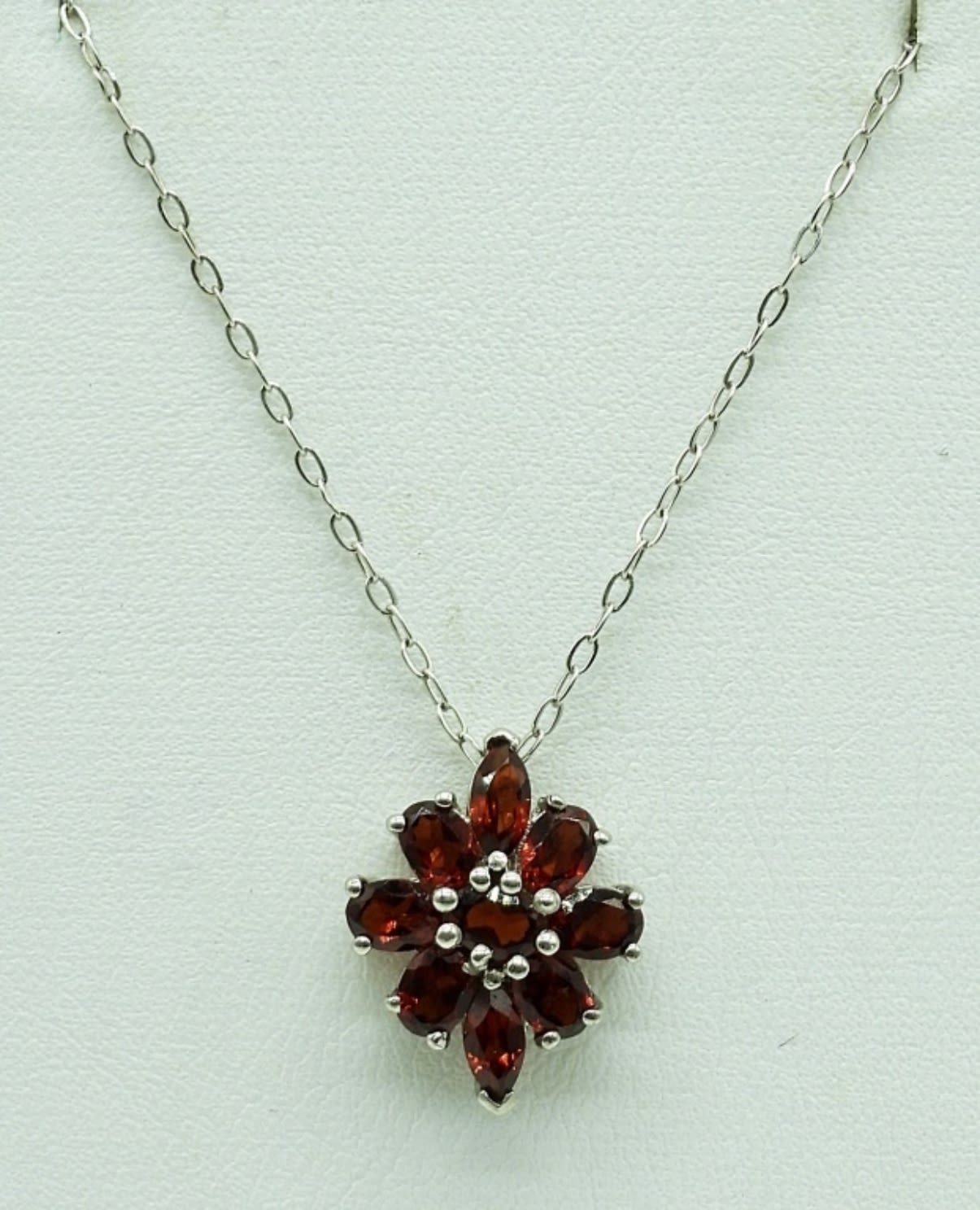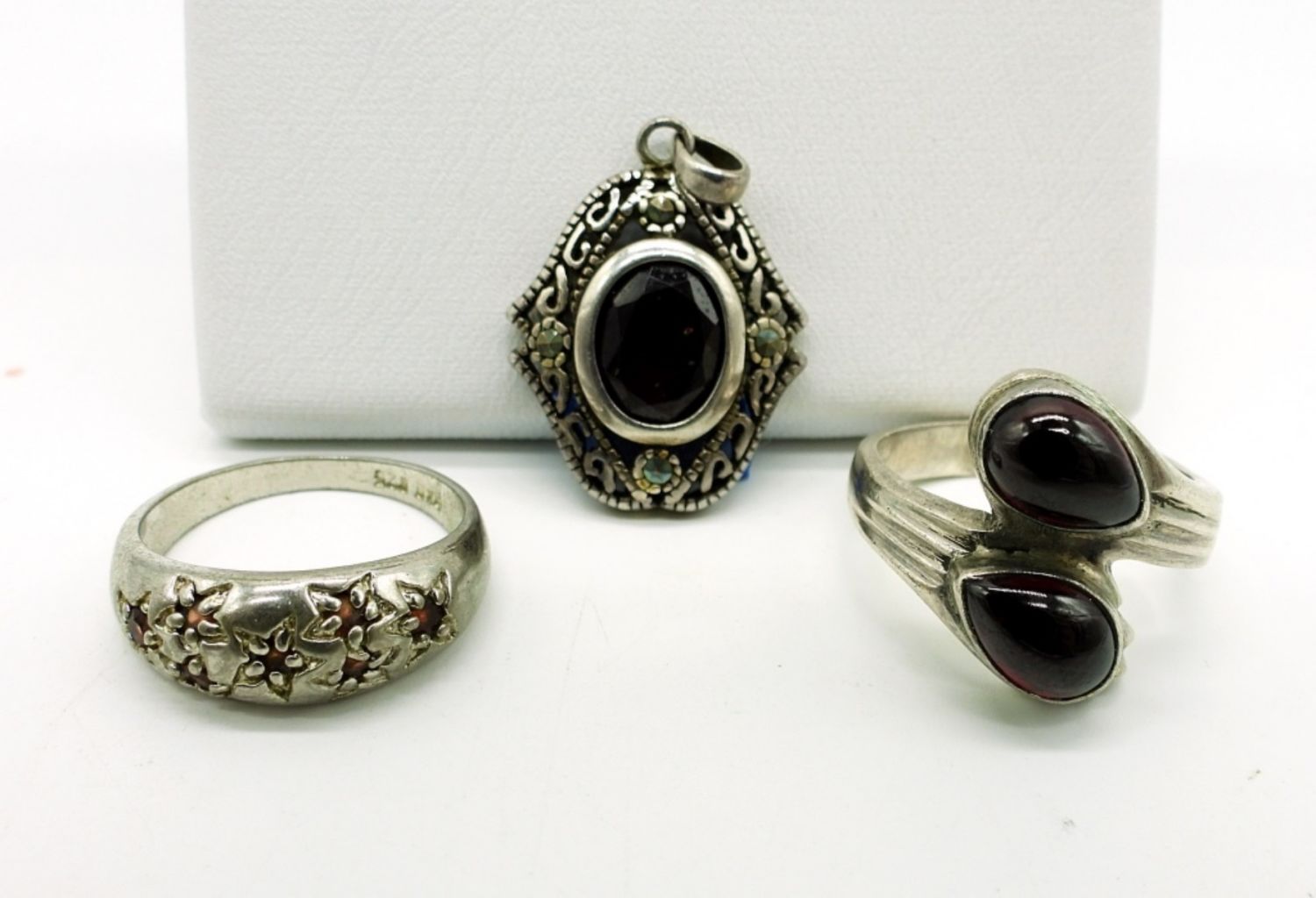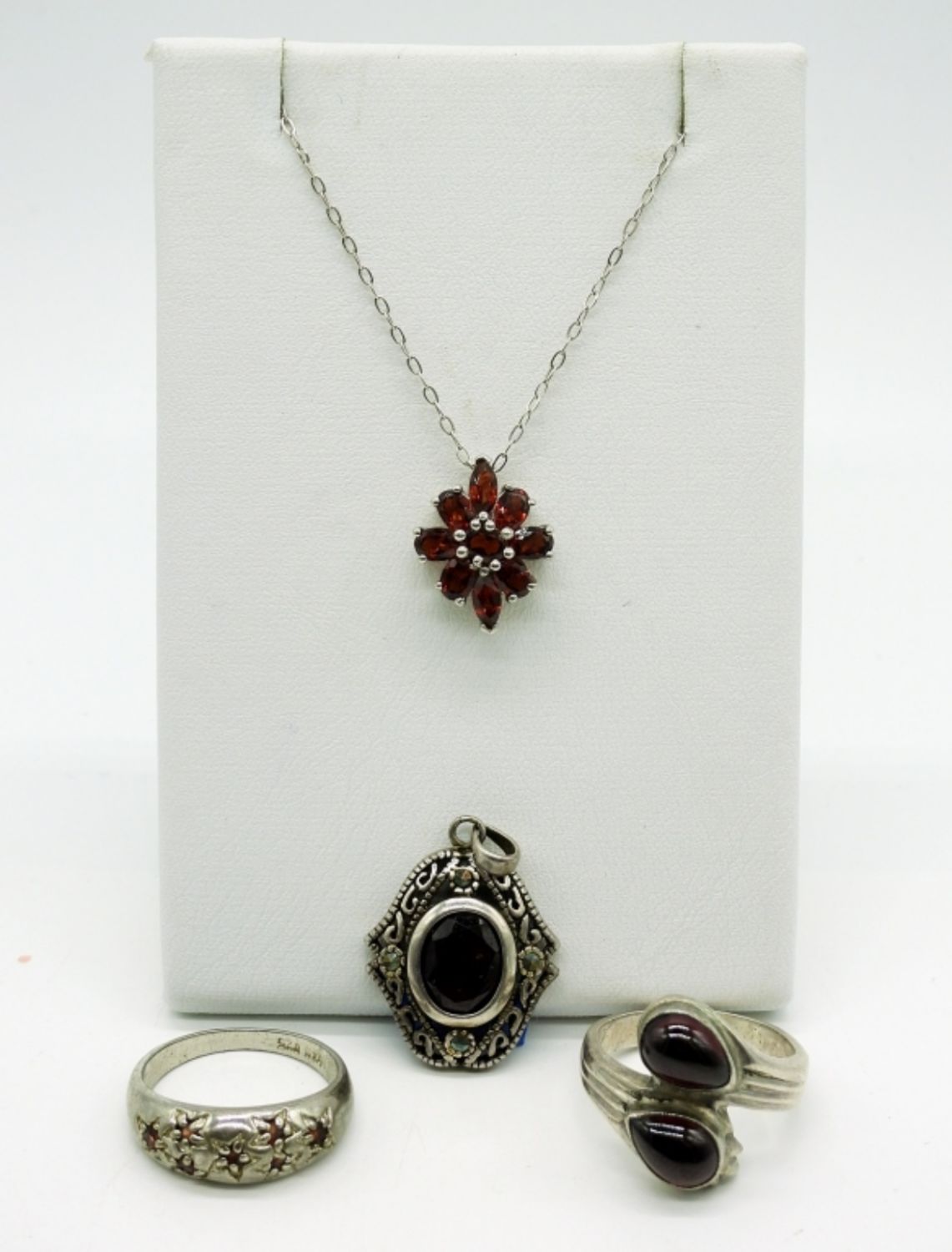 Two Vintage Sterling Rings with Garnet Colored Gemstones, Size 7. Two Sterling Garnet Pendants and a 20 inch Sterling Chain. 10.4 DWT