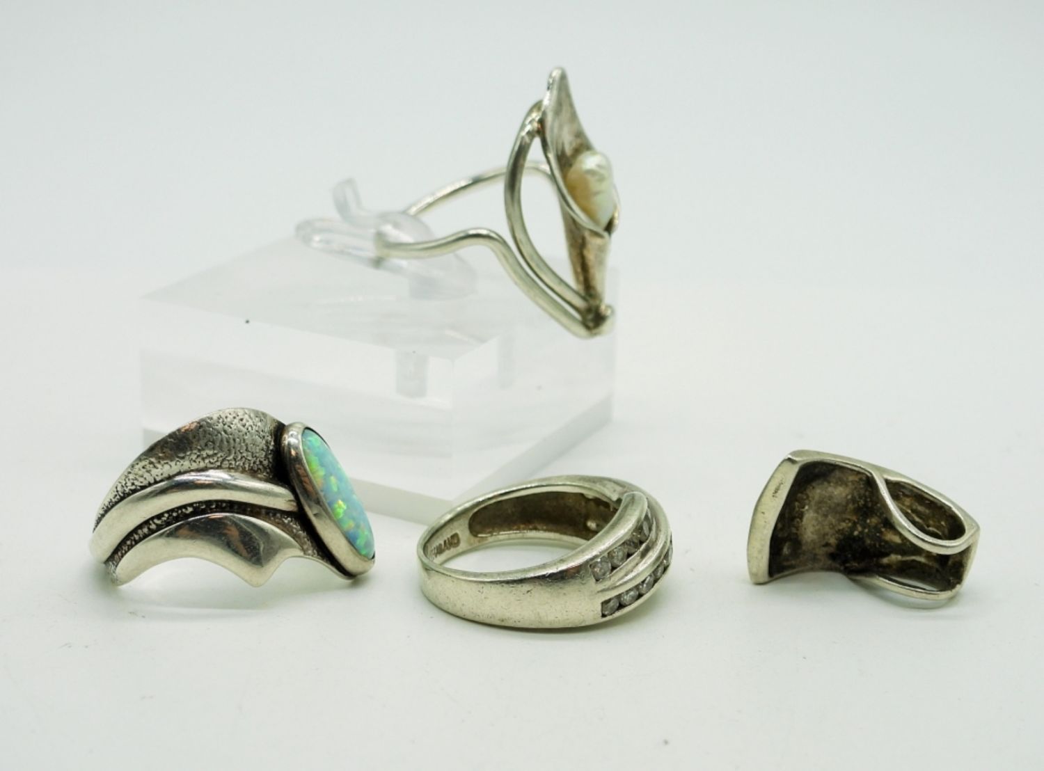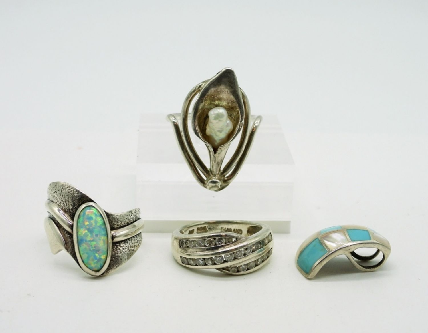 Three Sterling Rings, Opal Triplett, Diamond Looking Gemstones and Vintage Cala Lilly with a Pearl (size 7). Blue and White Mother of Pearl Pendant. 11.4 DWT
