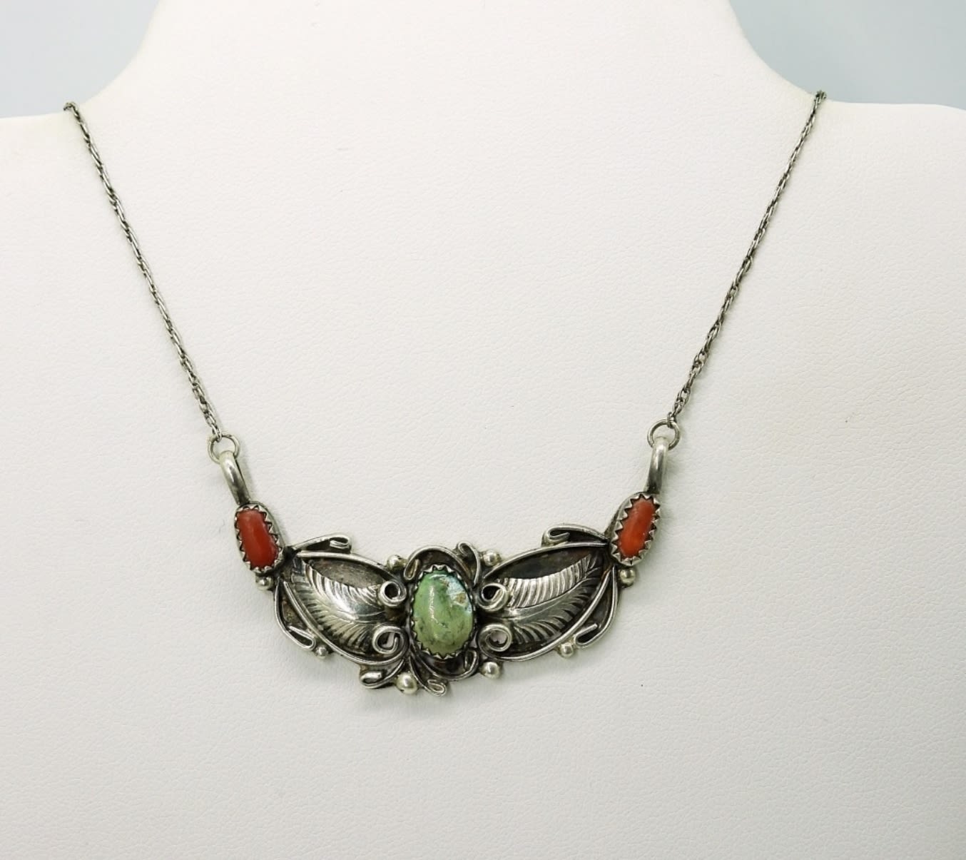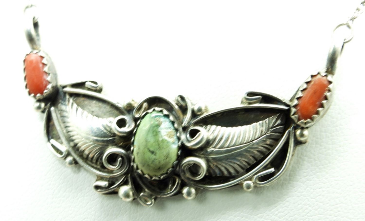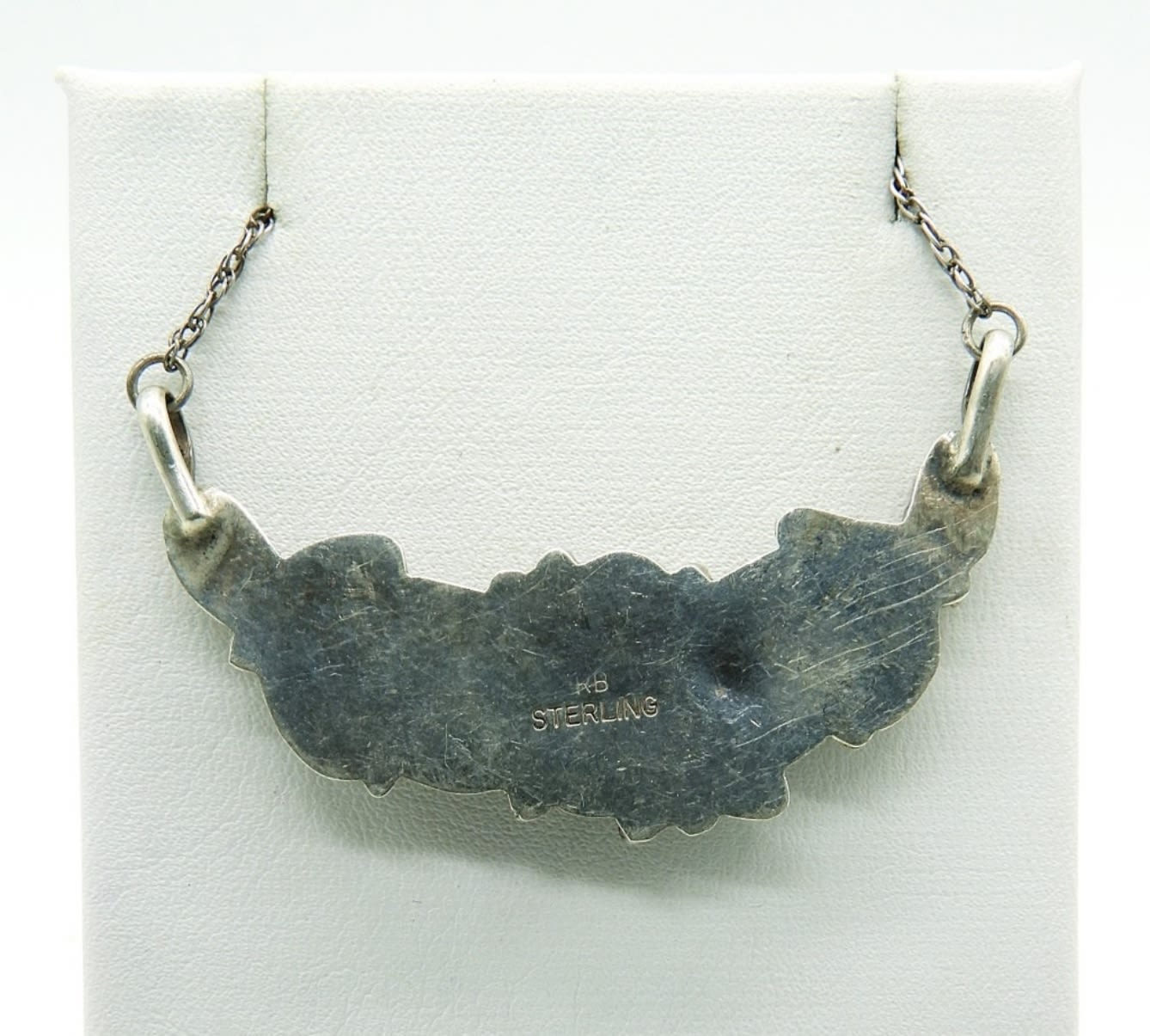 18 inch Sterling Silver Vintage Robert Bencenti Handmade Necklace. Back is stamped “RB Sterling”. Center Gemstone is chipped and faded. 4.7 DWT