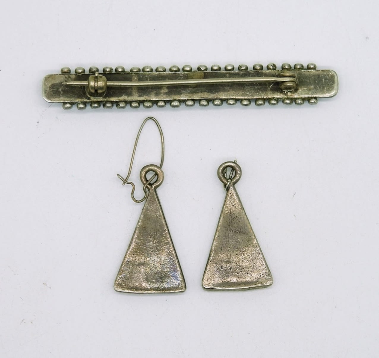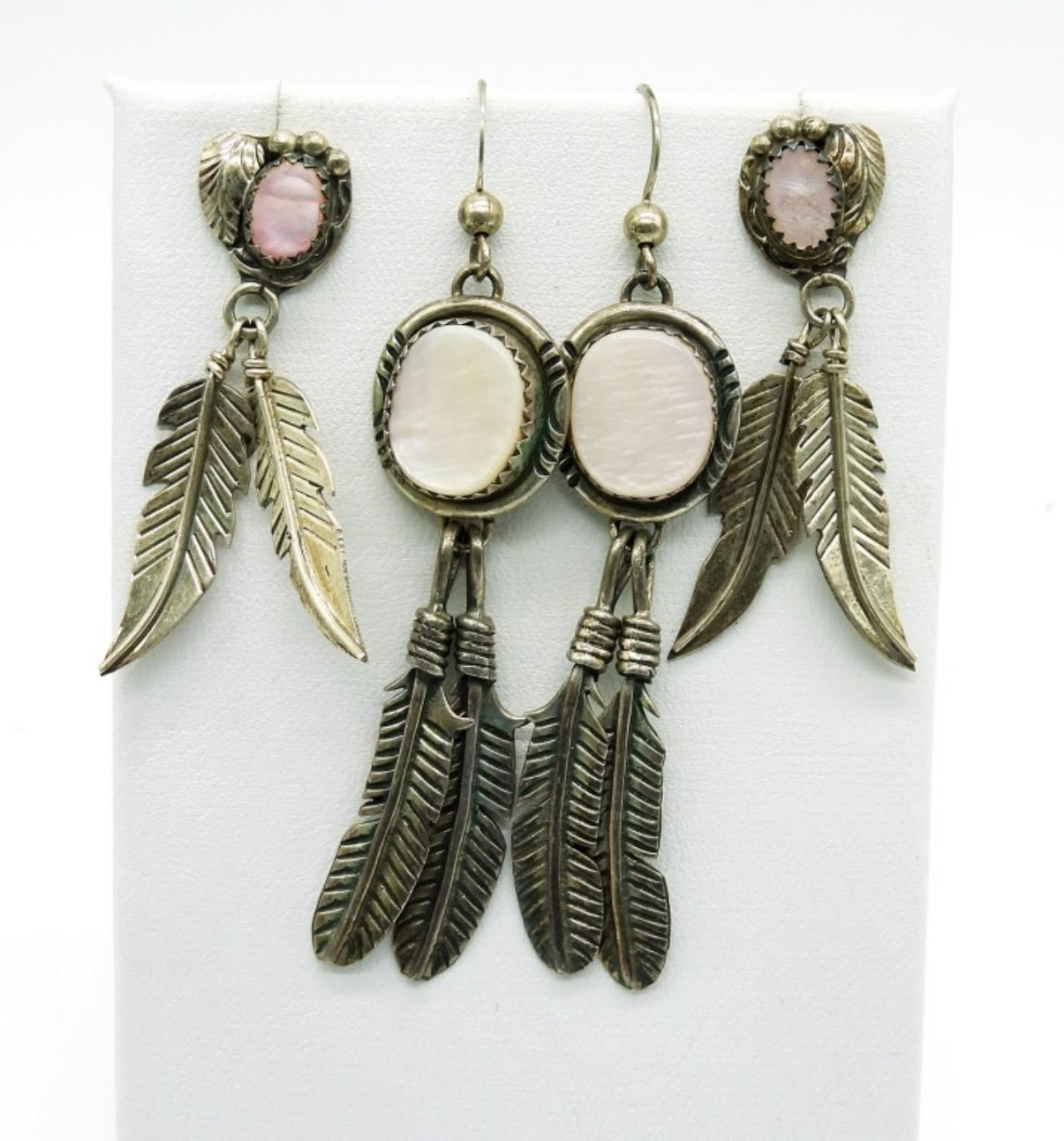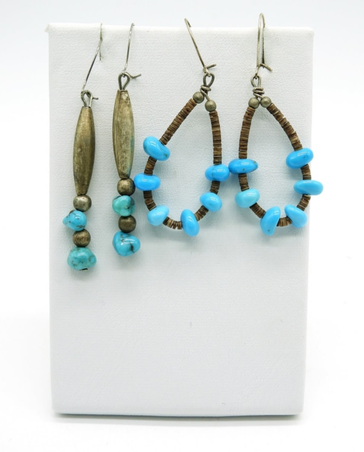 Five Pair of Pierced Southwest Style Earrings with Turquoise and Mother of Pearl Gemstones. One Southwest Sterling Turquoise Brooch. Bear Claw Earring needs new wire. 19.3 DWT