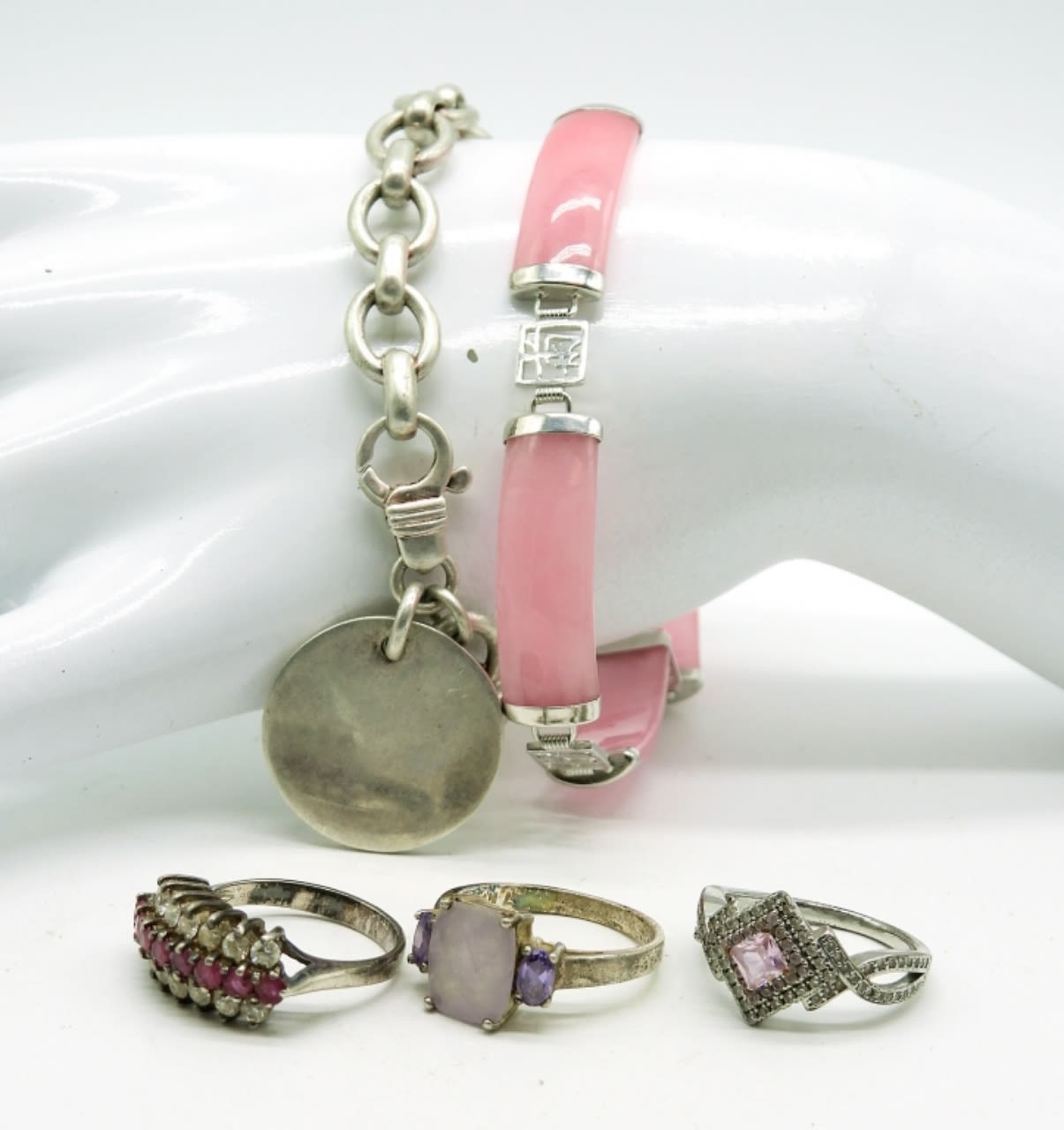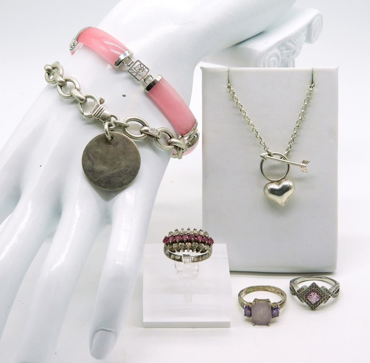 8 inch Pink Jade and Sterling Bracelet. Three Sterling Rings with Pink & Purple Gemstones (Sizes 6 & 7). Sterling Chain Bracelet, 7 inches with engravable charm. Heart and Arrow Toggle Necklace, 16 inches. 30.5 DWT