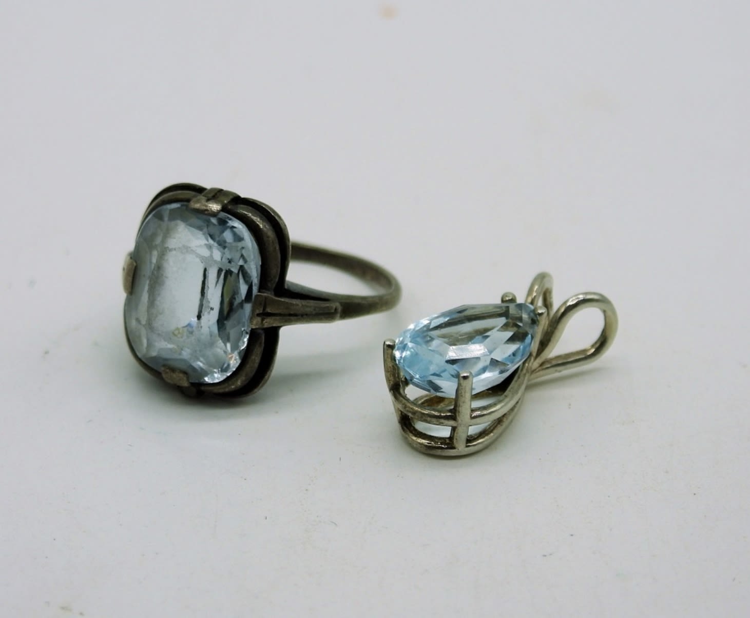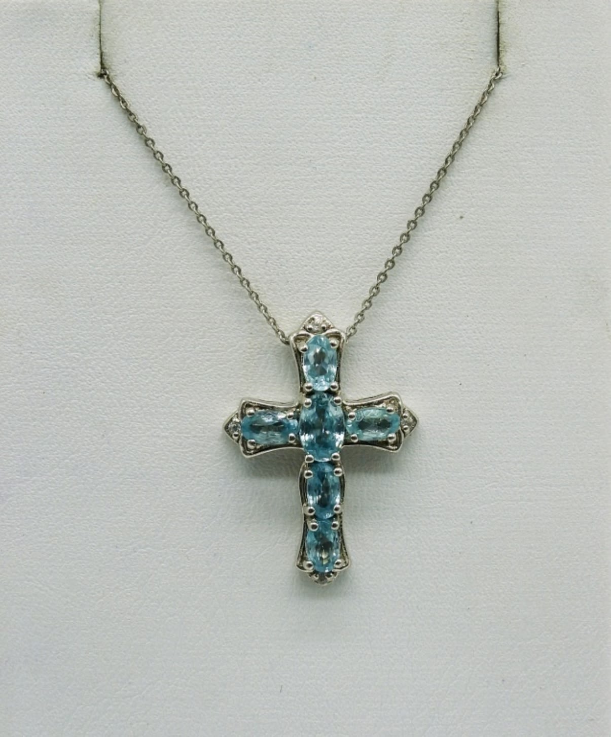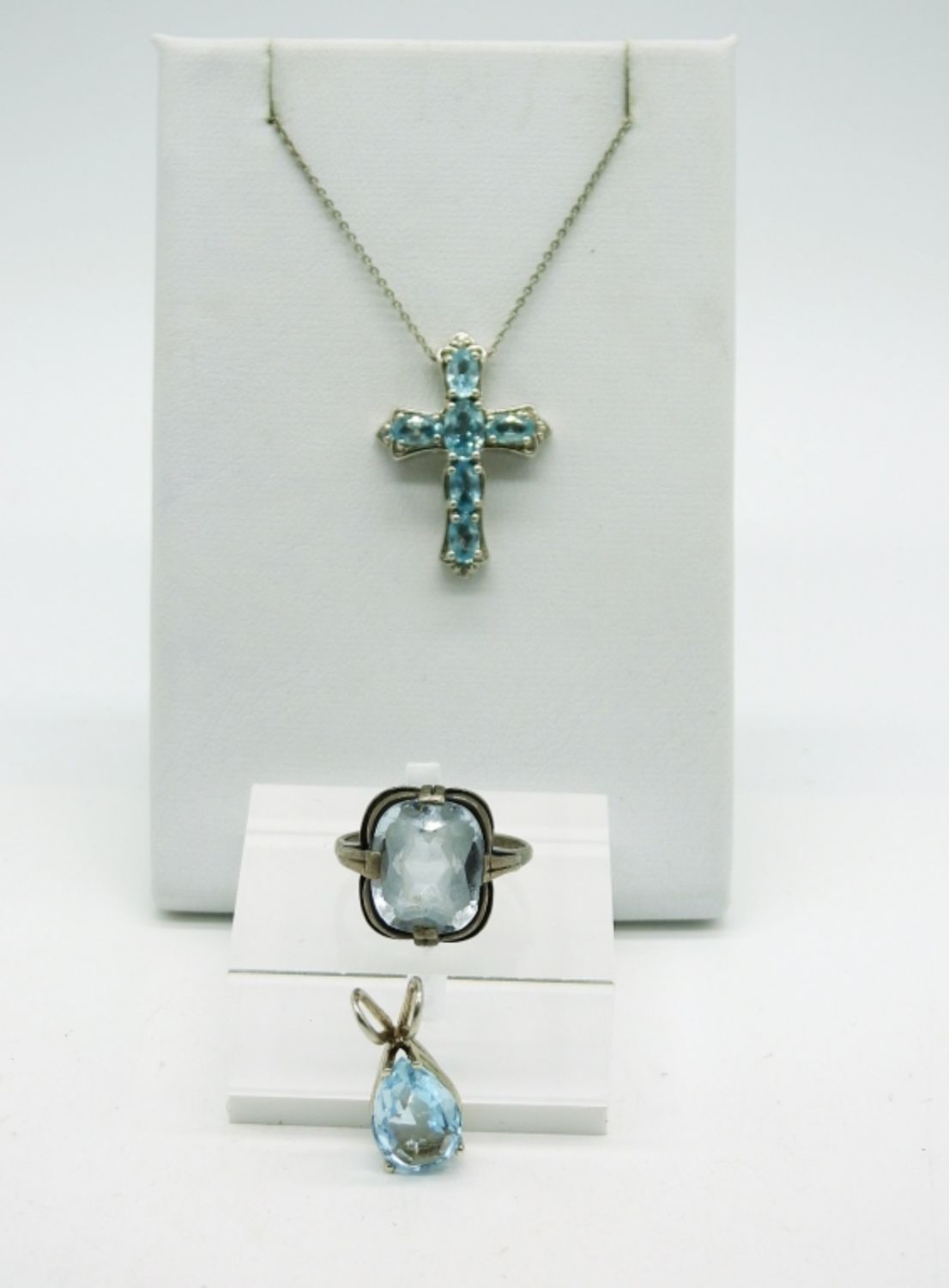 Aquamarine Colored Gemstones in a Vintage Sterling Ring Size 4 3/4, Aquamarine Colored Gemstone Cross Pendant on a 20 inch Sterling Chain. Teardrop Shaped Aquamarine Colored Gemstone Pendant. 6.6 DWT