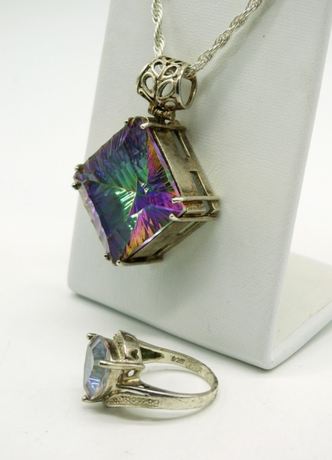Large Sterling Mystic Quartz pendant on a Sterling 20 inch chain. Mystic Quartz Sterling Ring Size 7 with hearts cut out of the silver on the side. 17.7 DWT
