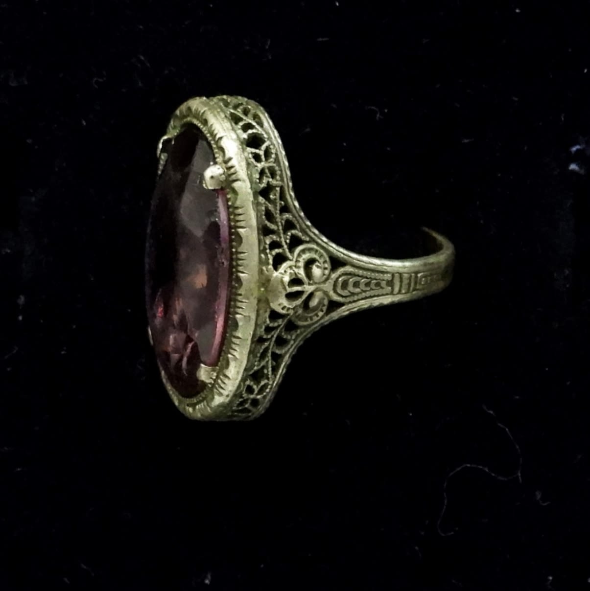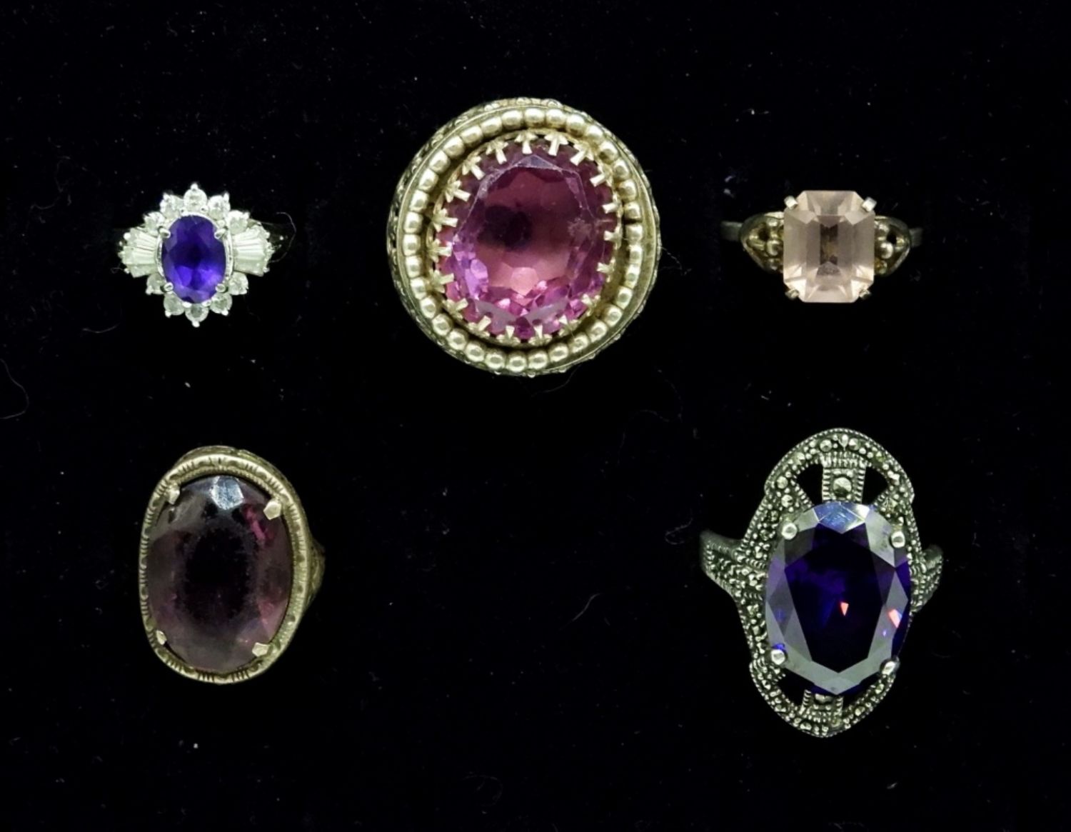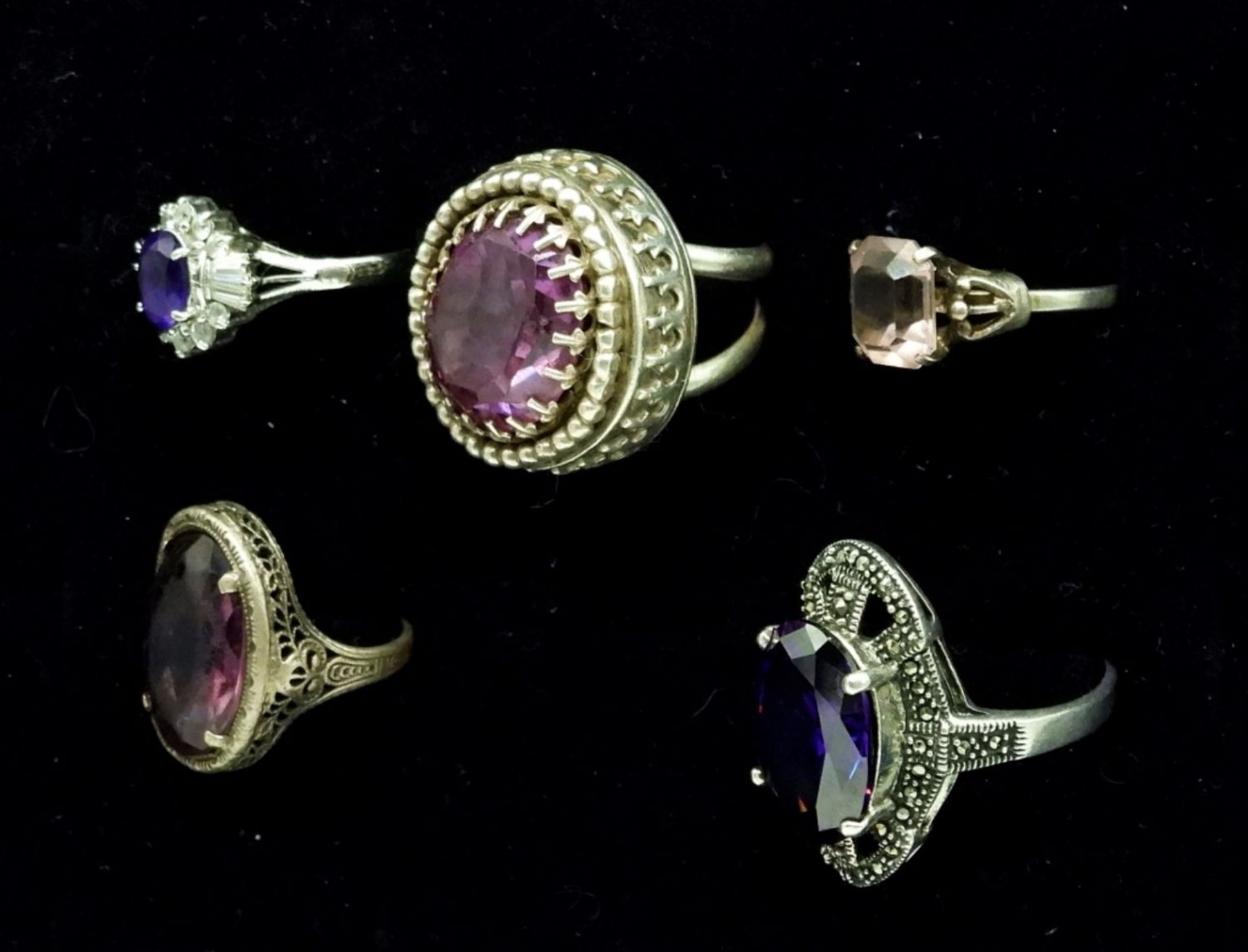 Five Vintage Sterling Silver Rings with Amethyst Colored Gemstones. The vintage oval scrollwork ring has a gemstone that is a little beaten up. 25.3 DWT