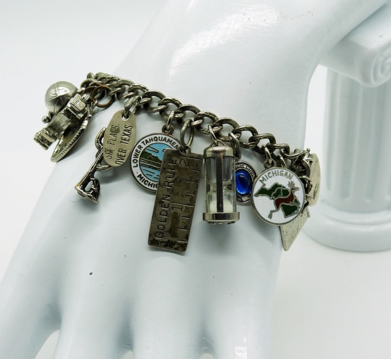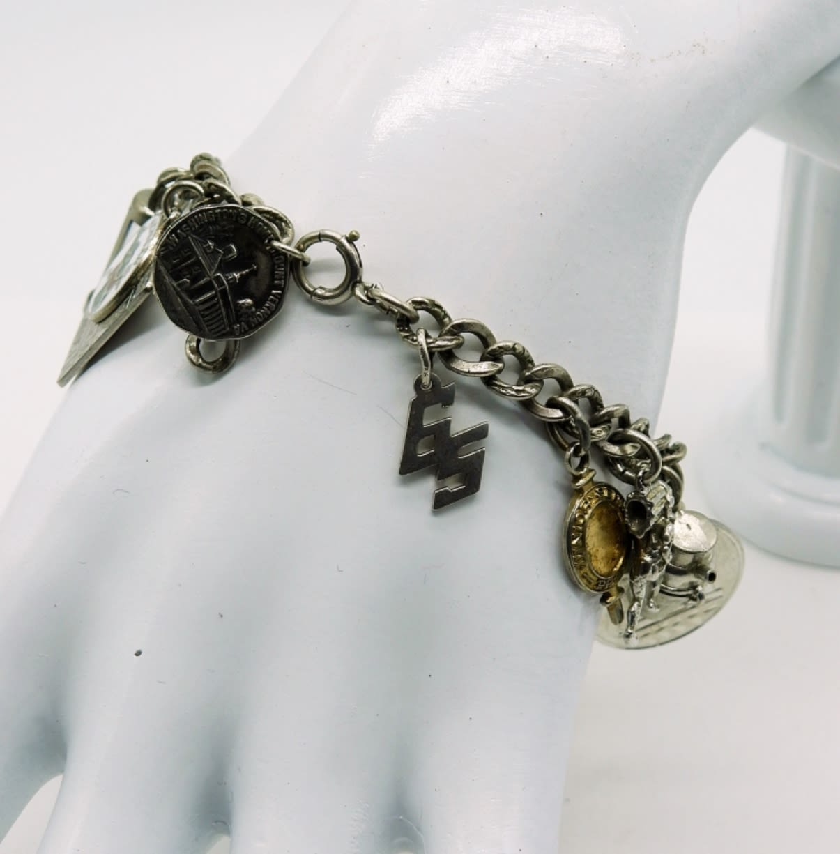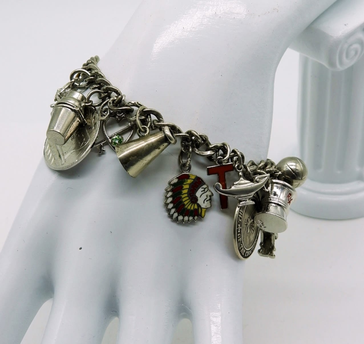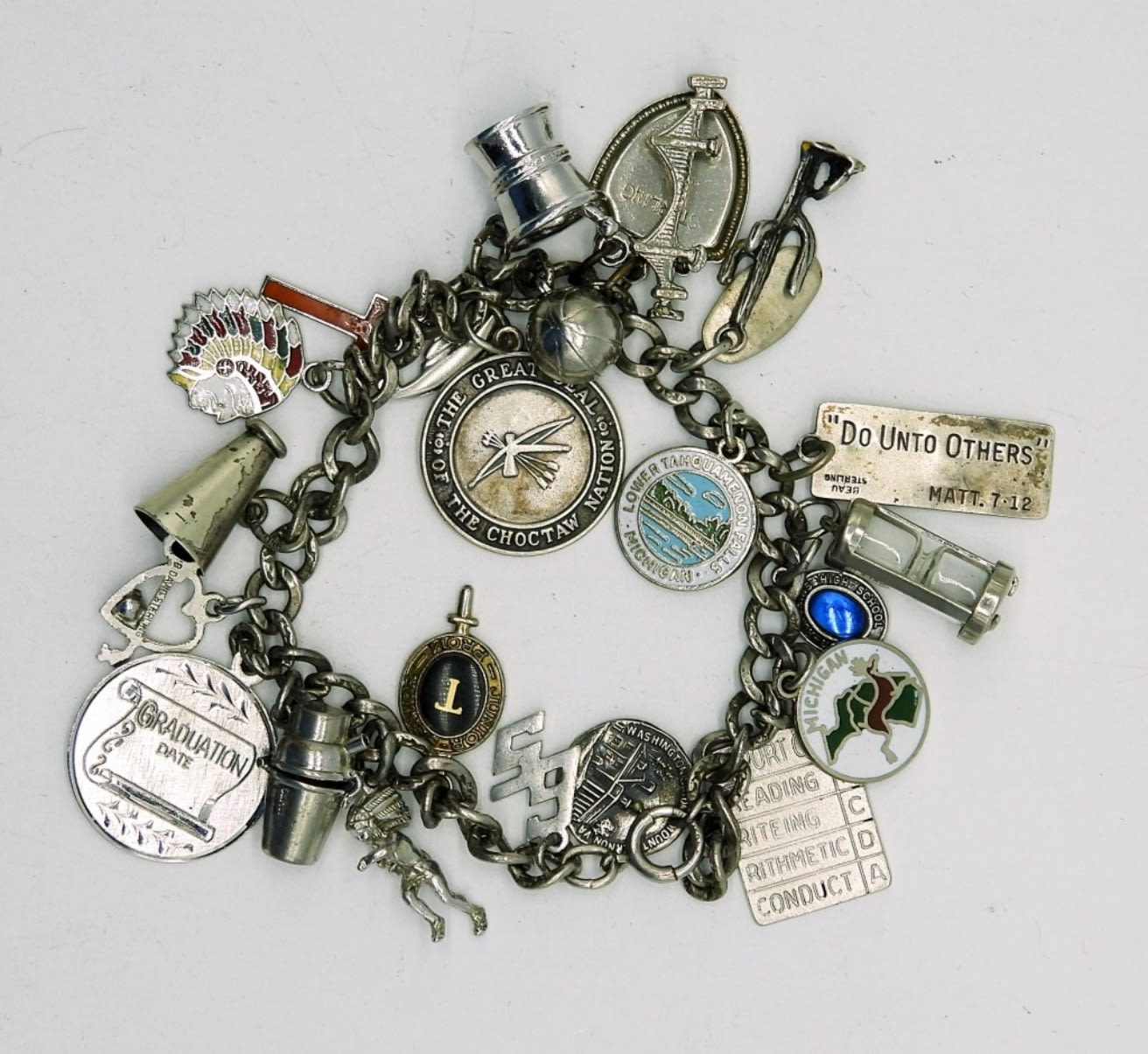 Sterling Charm Bracelet with 23 Charms. Circa 1964-1965 Wilmer-Hutchins H.S., Lots of High School related charms. 31.5 DWT