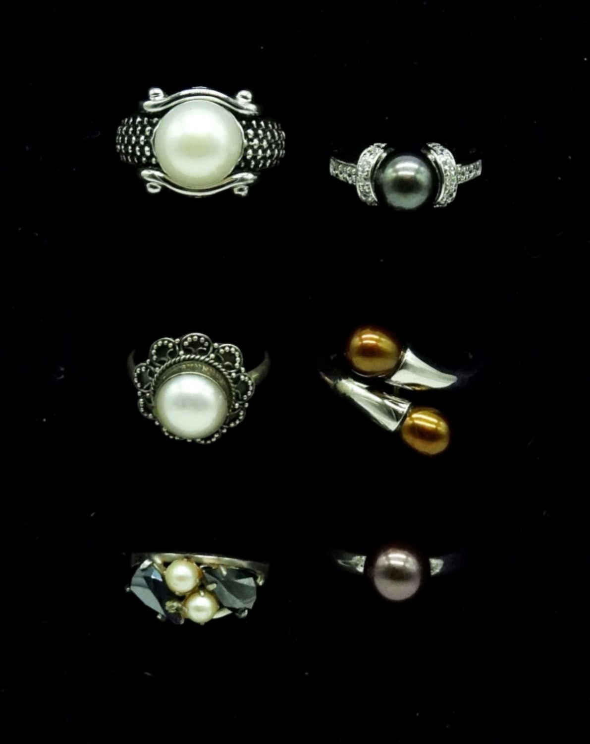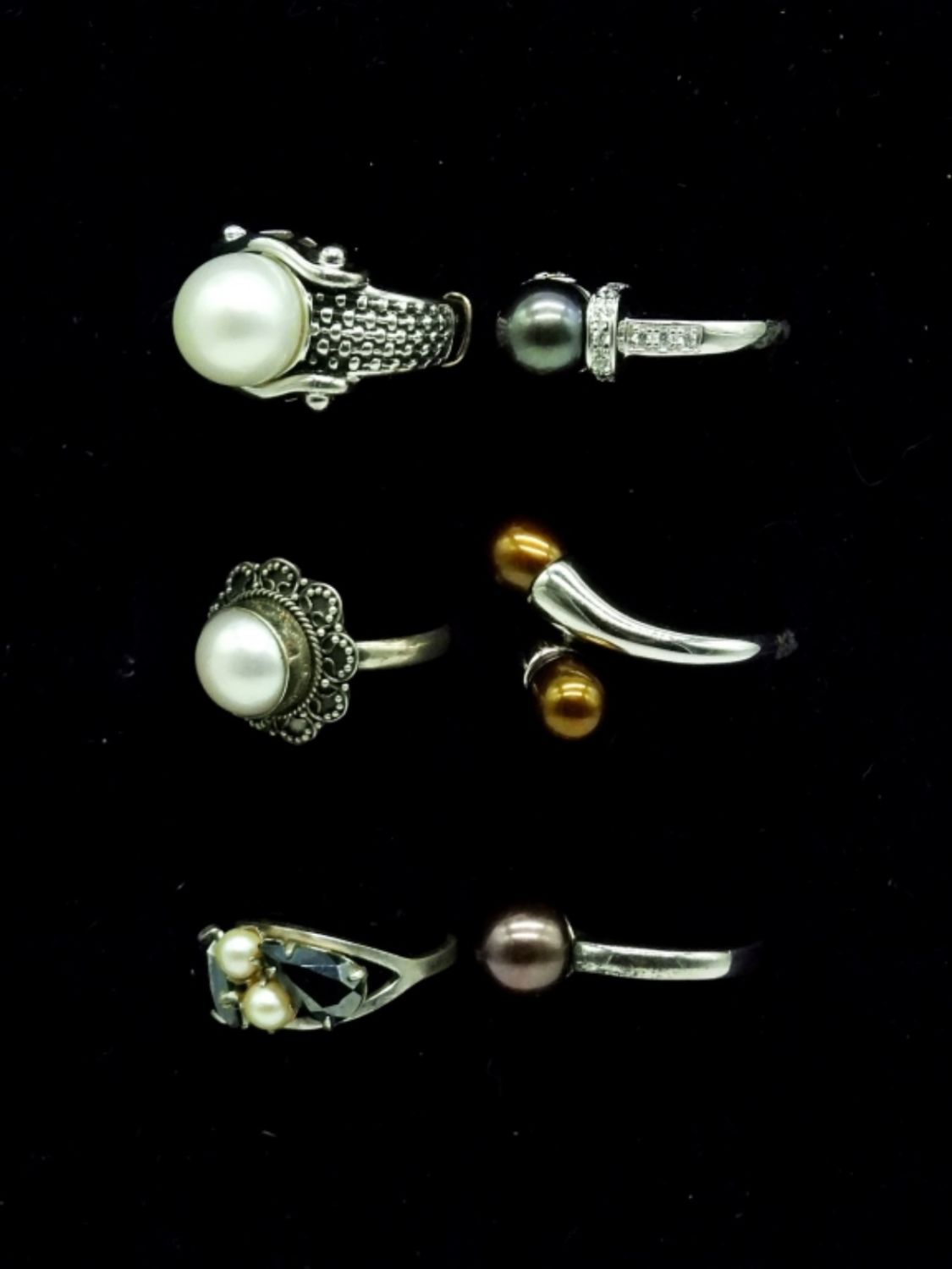 Six Sterling Silver Vintage Rings with various colors of Pearl & Gemstones. Sizes 6-10 20.8 DWT