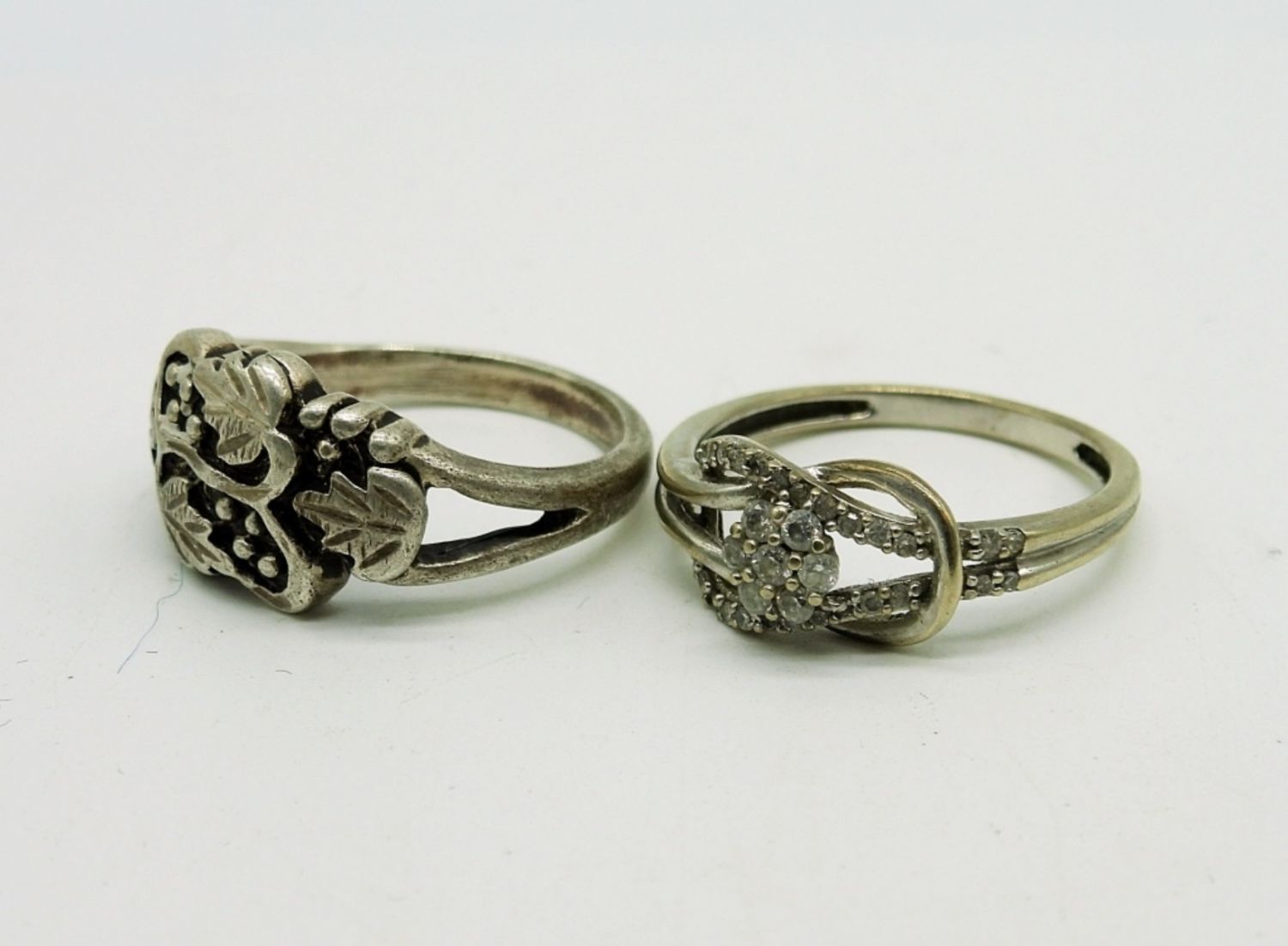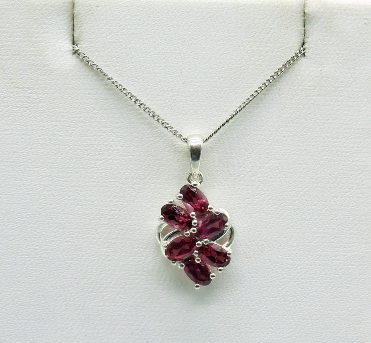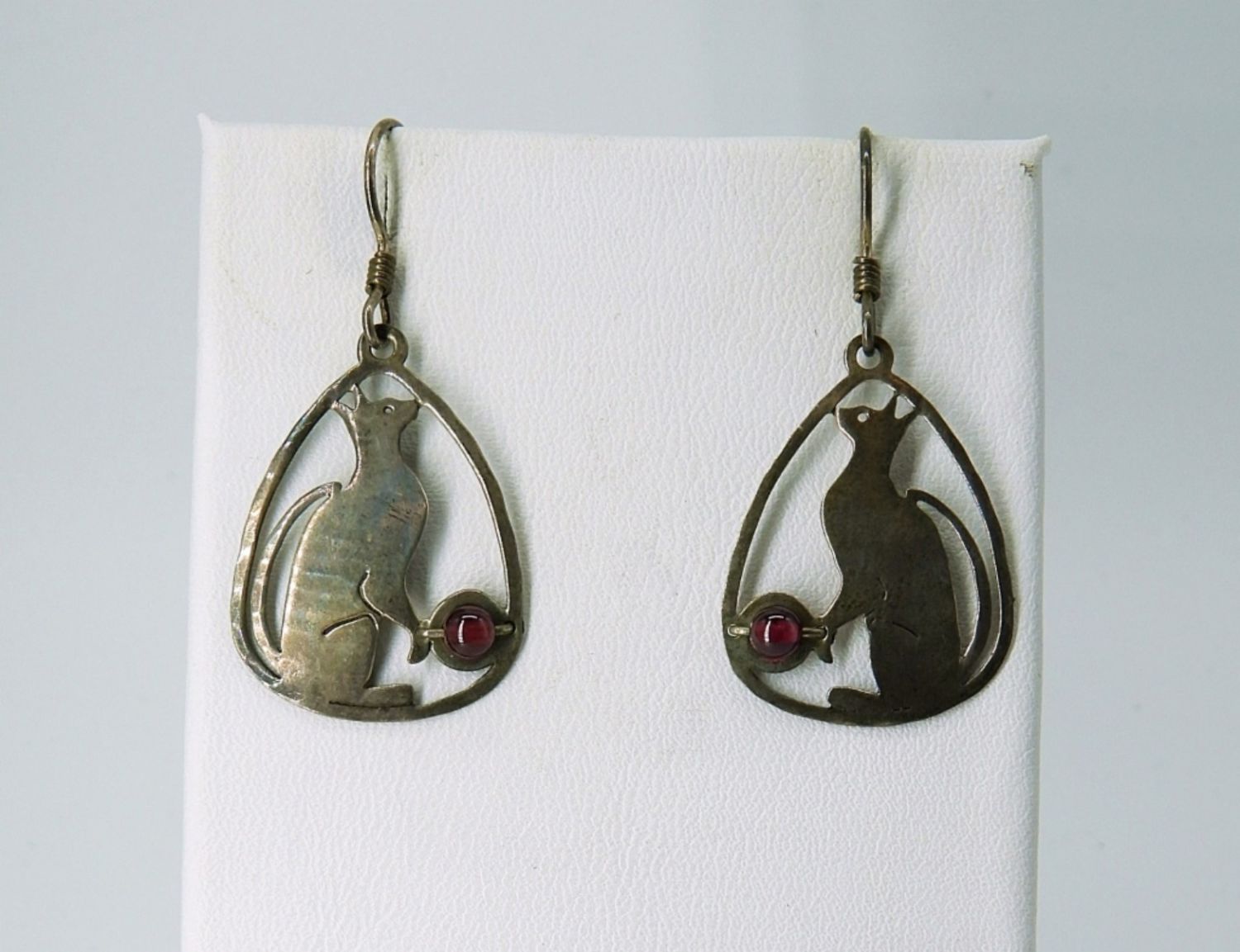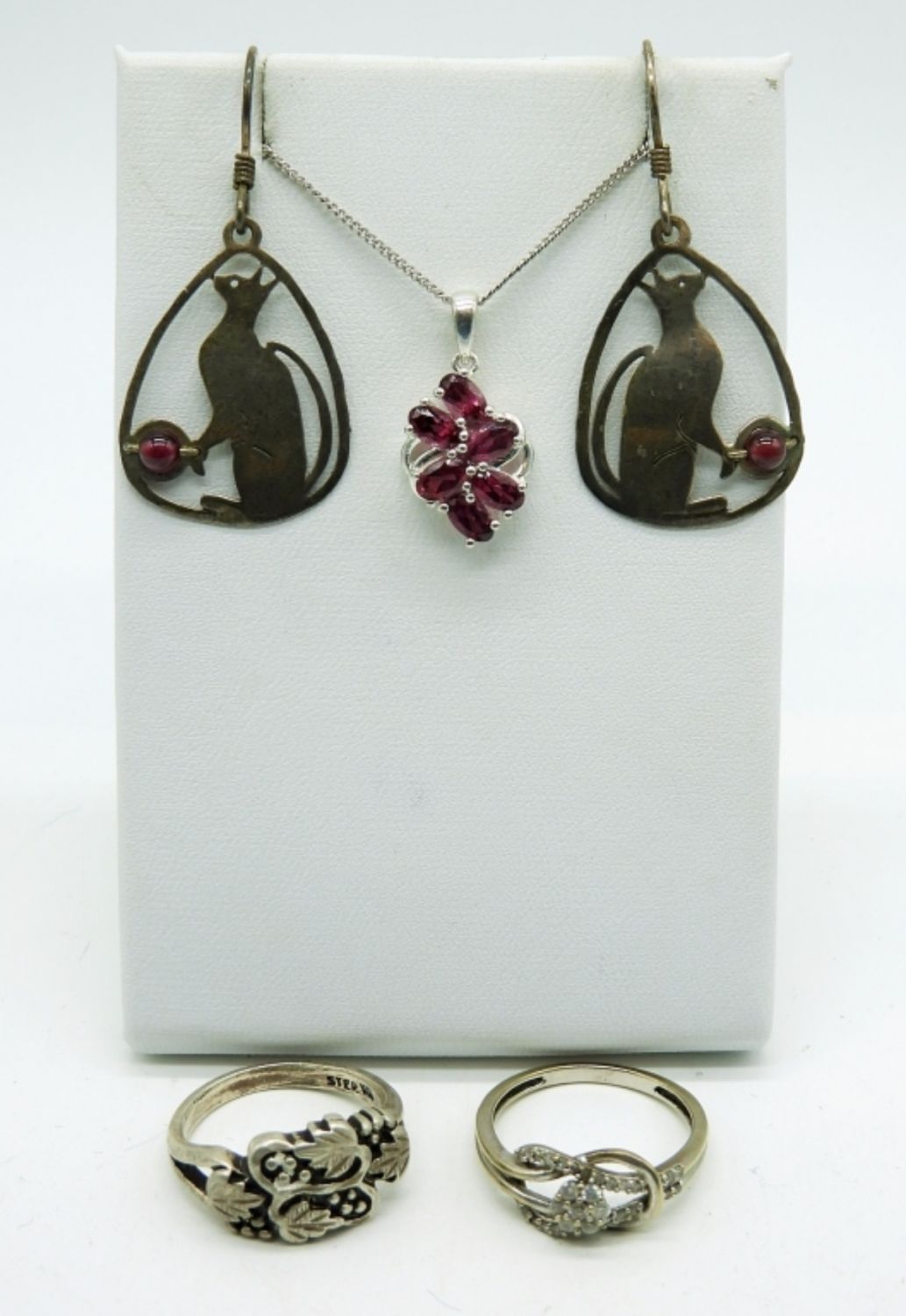 Two Sterling Rings, One with Diamond Colored Gemstones, Sizes 7. Pierced Sterling Dangle Cat Earrings with Ruby Colored Gemstones. Six Stone Ruby Colored Gemstone Pendant on a 19 inch chain. 7.8 DWT