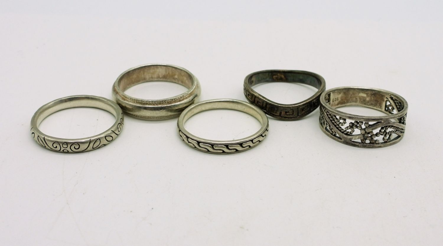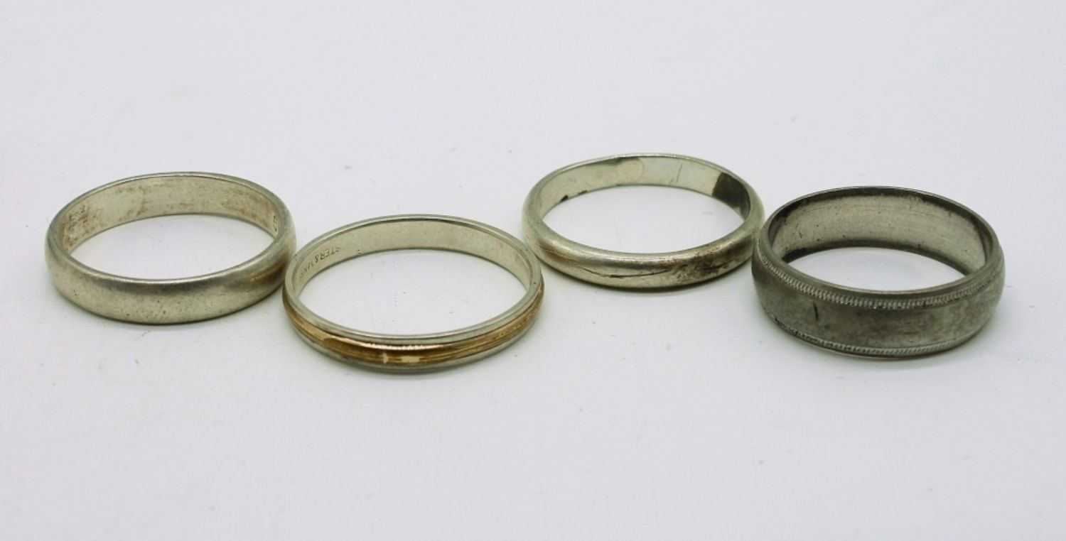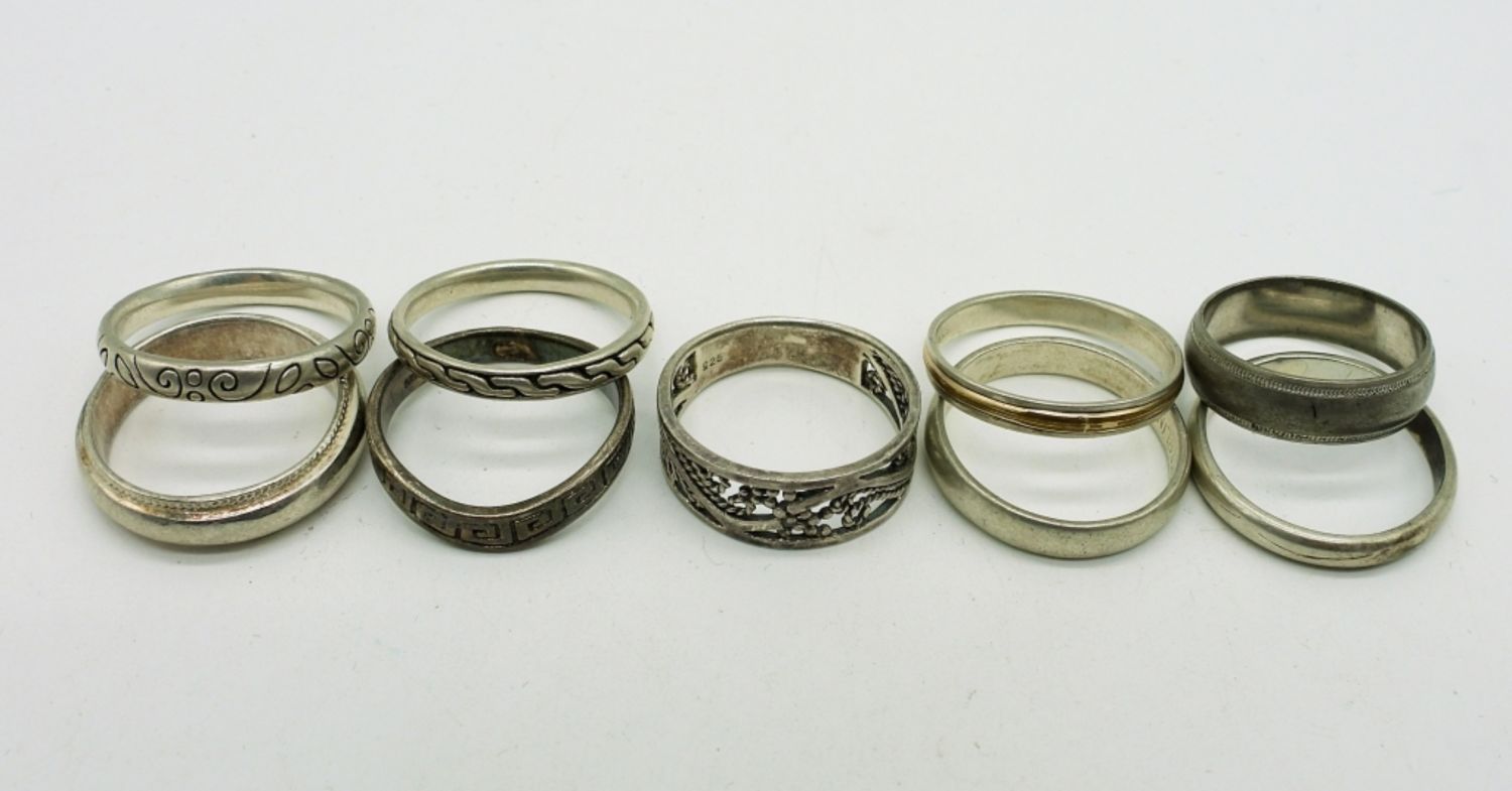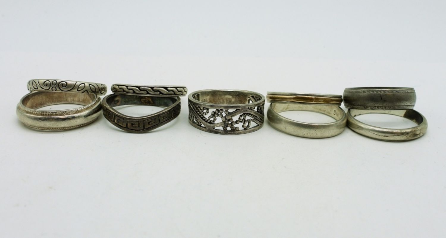 Nine Sterling Silver Bands of various designs, sizes 7 & 8. 15.7 DWT