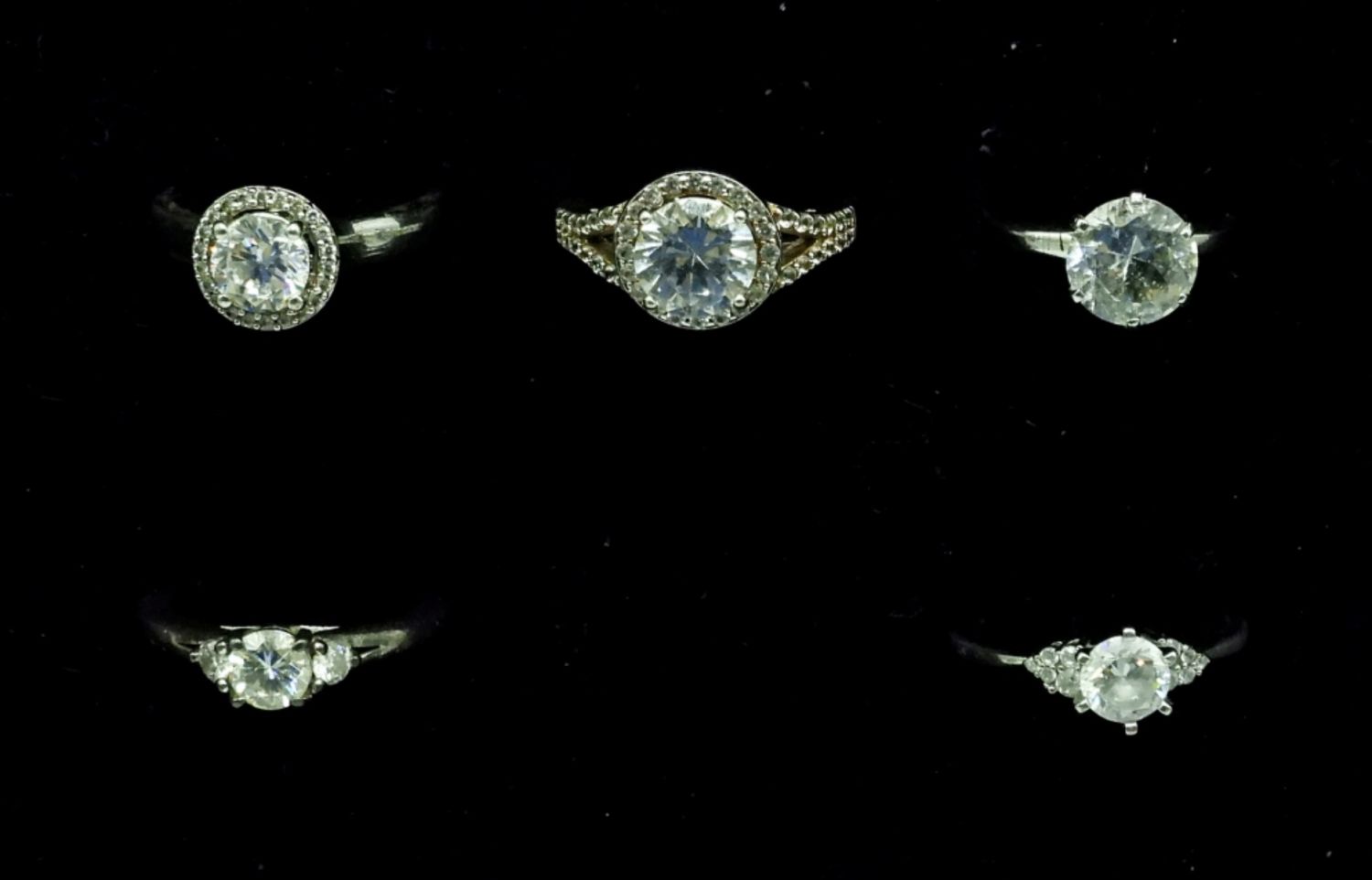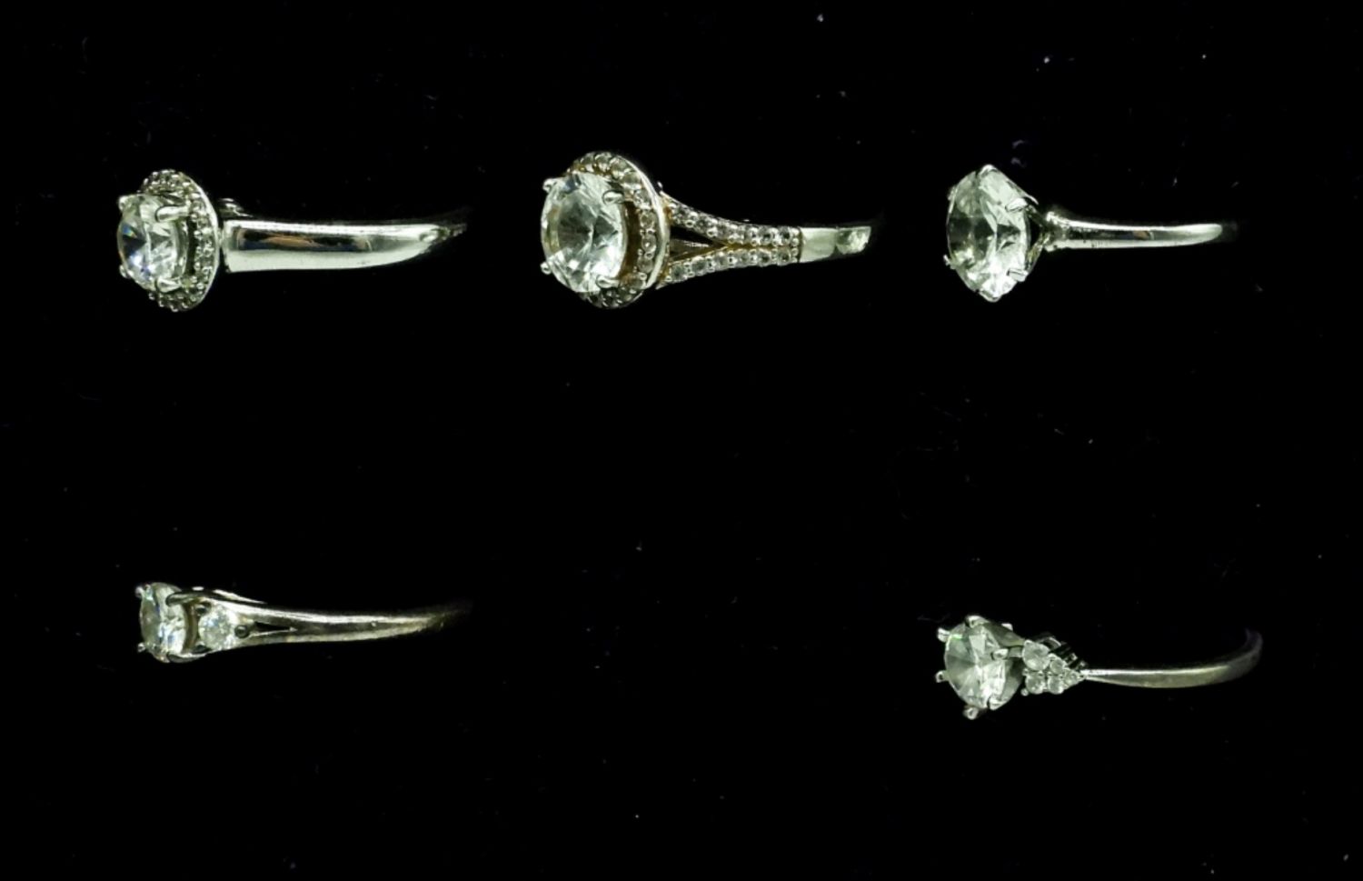Five Sterling Silver, Solitaire Engagement Style Rings. Diamond Colored Gemstones. Sizes 5-8 9.5 DWT