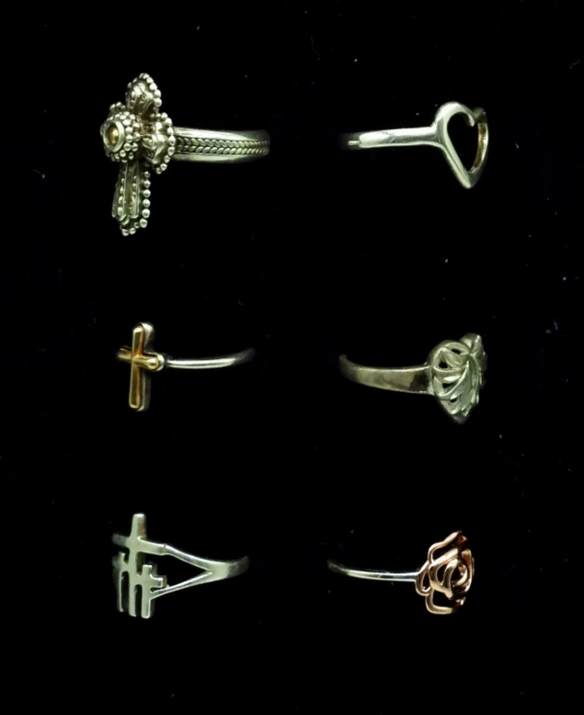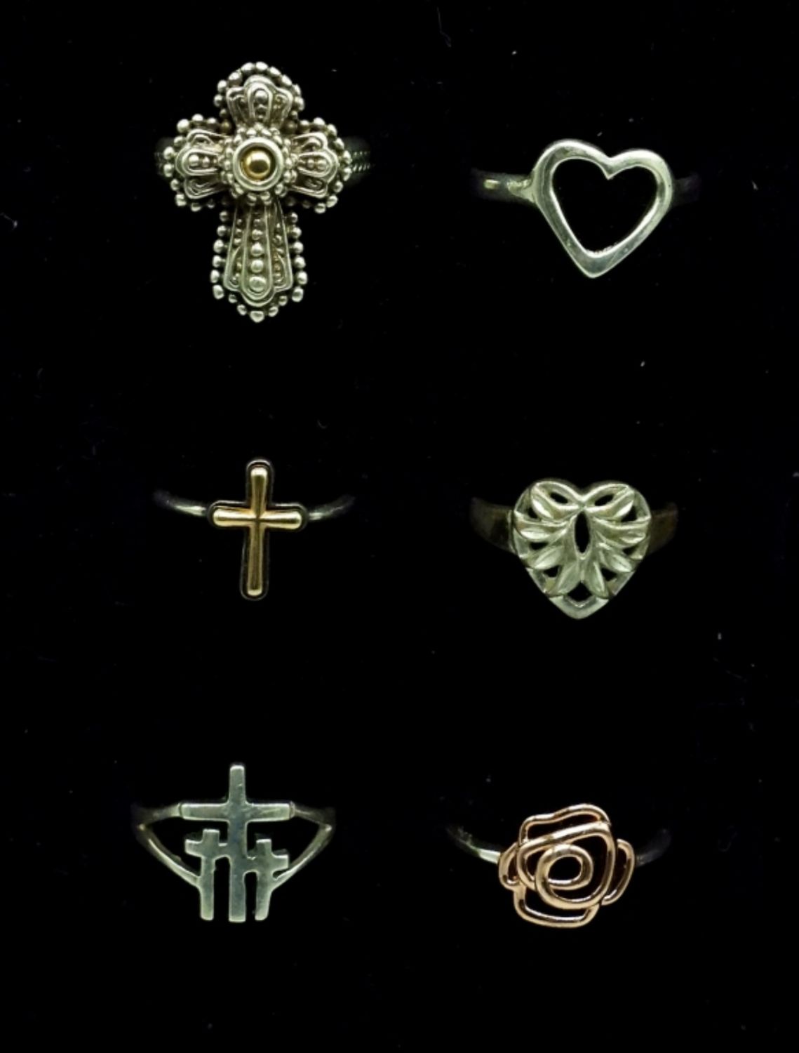Three Sterling Cross Rings, Gold/Silver Tone. Two Sterling Heart Rings & One Sterling Rose Ring-Two Tone. Sizes 4.5-8. 10.2 DWT