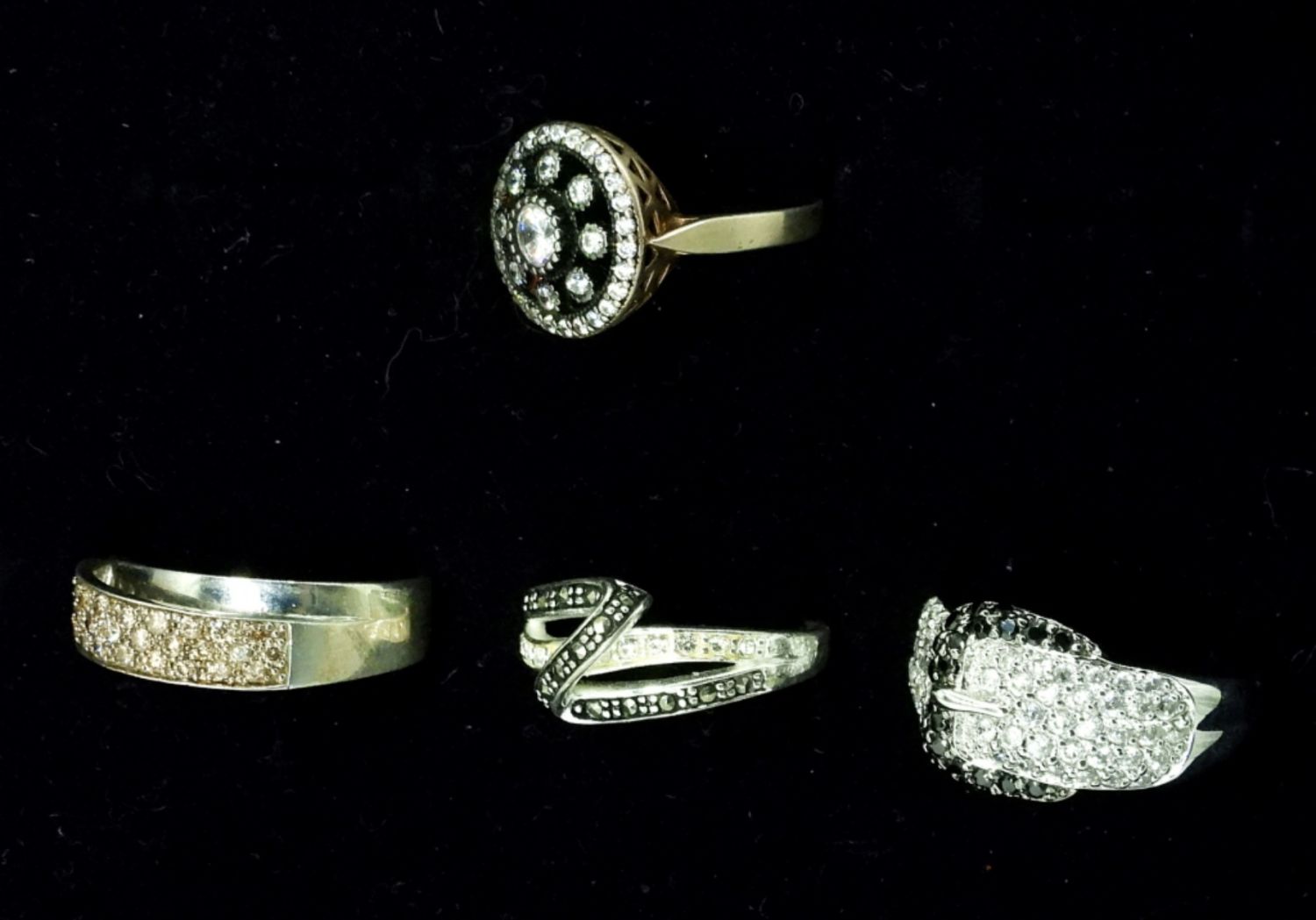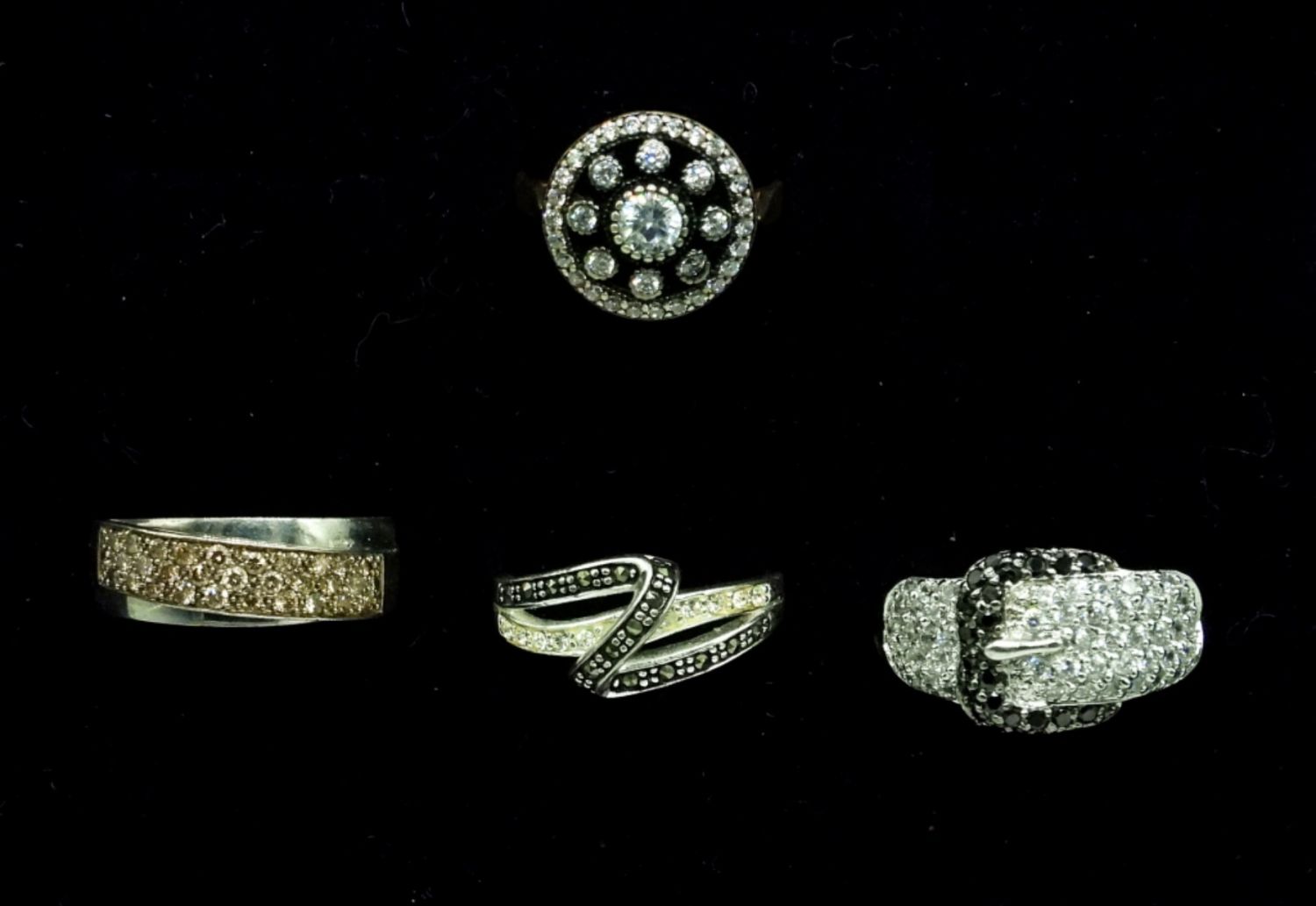 Four Sterling Silver Rings with Black and White Diamond Colored Gemstones. Sizes 6.5-10 11.8 DWT