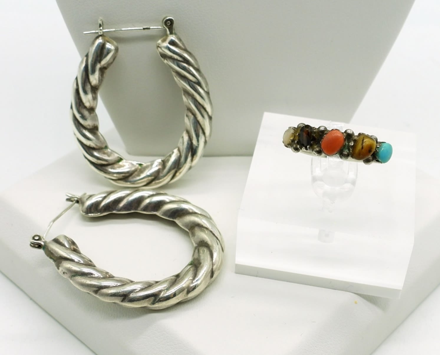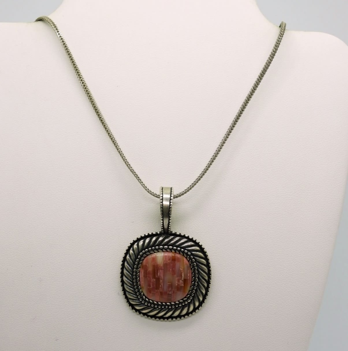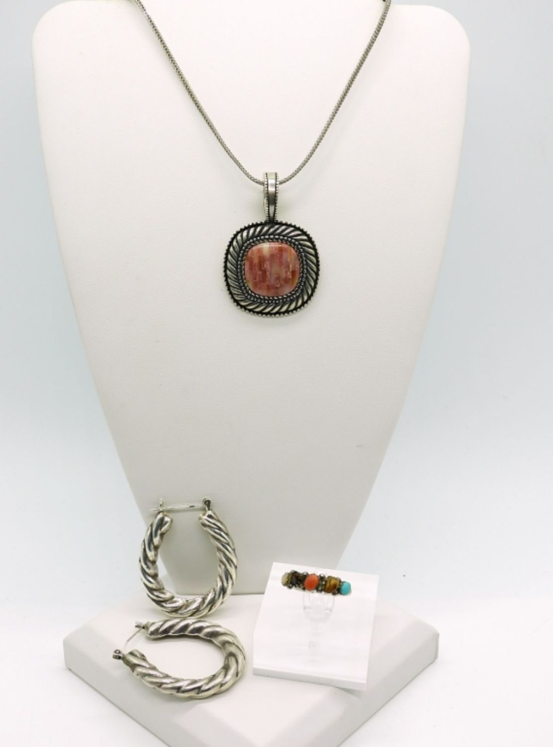 Carolyn Pollack Pink Mother of Pearl Shell Inlay Sterling Necklace 16 inches. Large Sterling Pierced Hoop Earrings and size 8 Ring with several gemstones. 18.4DWT