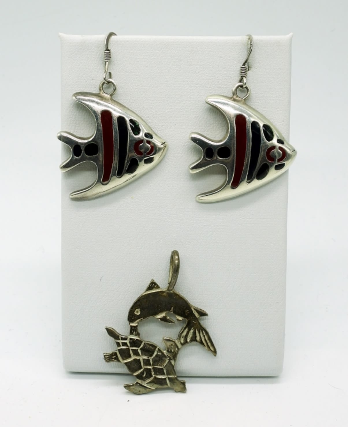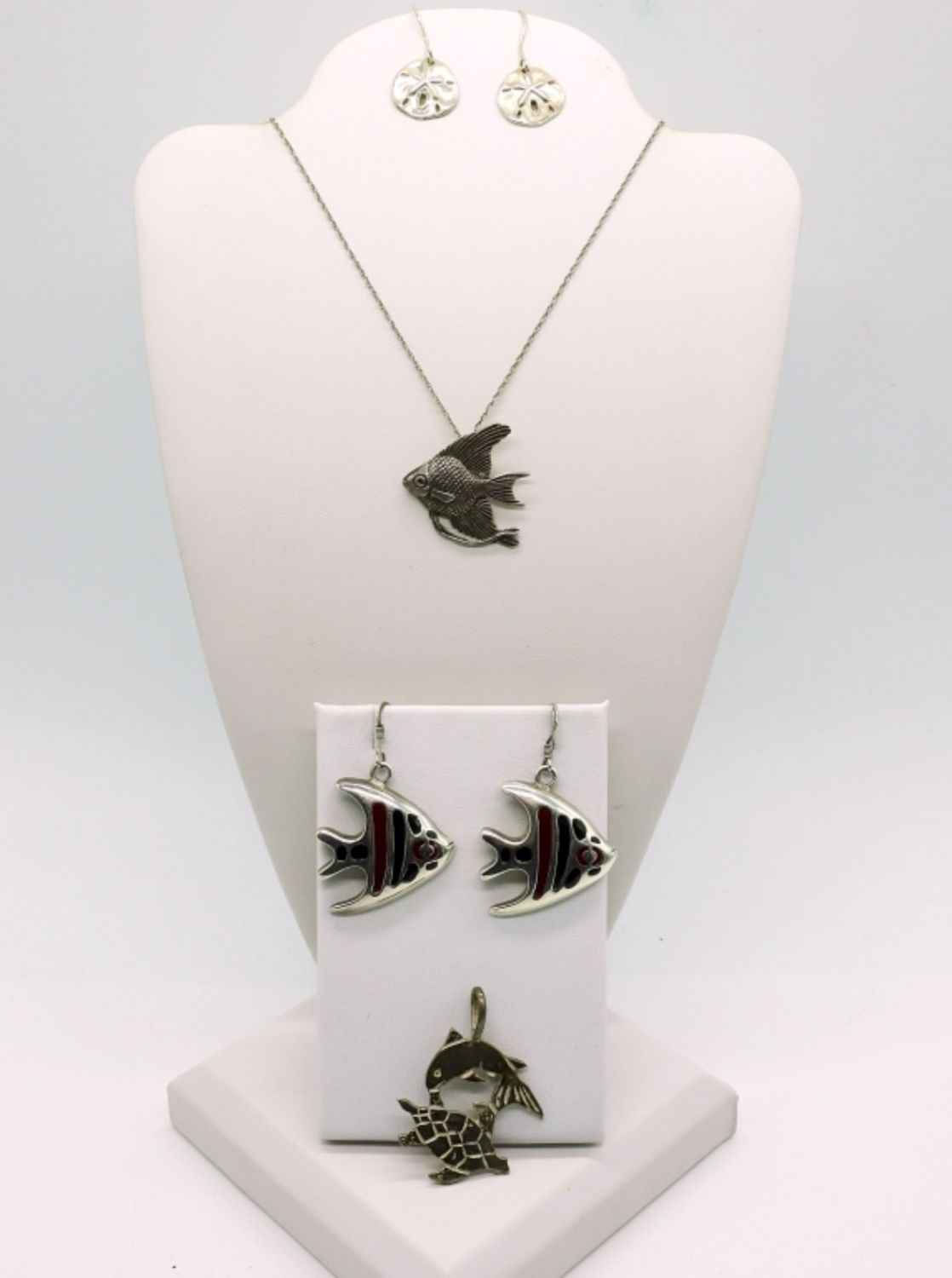 Sterling Fish Pendant on 20 inch Chain, Sterling Fish Earrings with Black & Red Enamel. Turtle & Fish Pendant. Sand Dollar Sterling Pierced Drop Earrings. 15.5DWT