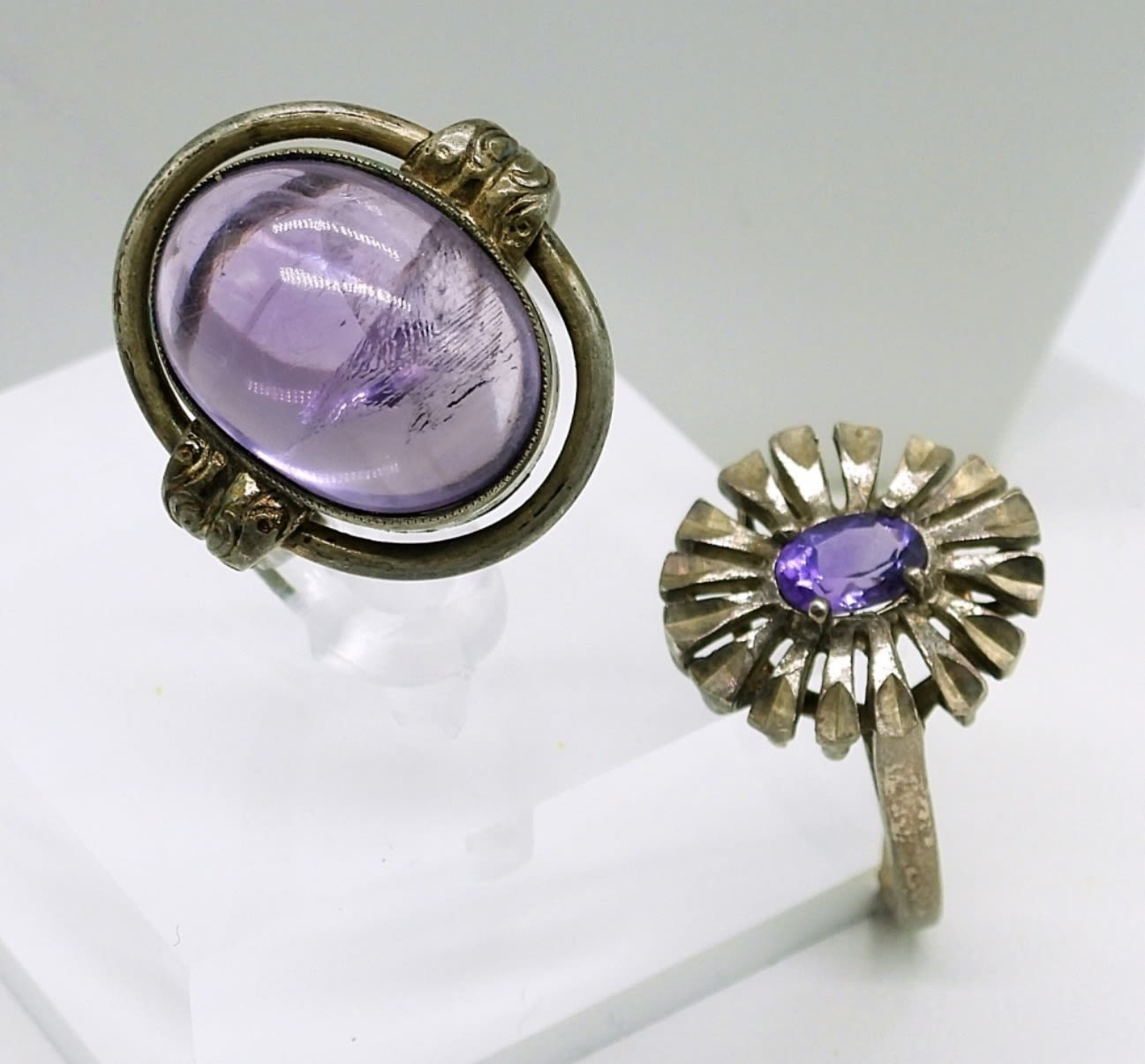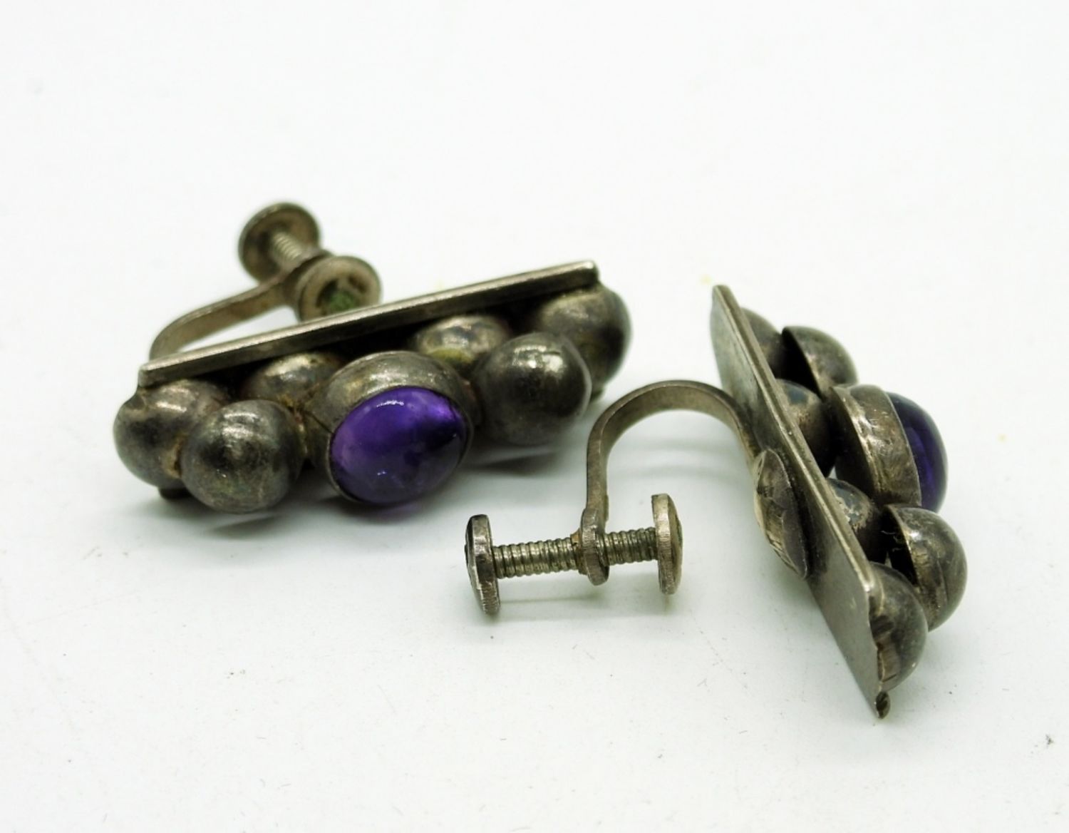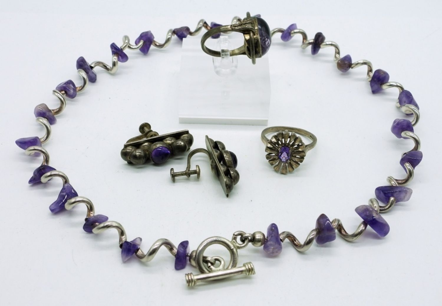 Sterling Amethyst Necklace, 17 inches. Two Sterling Rings with Amethyst Colored Gemstones (Sizes 6 3/4 & 8) and One pair of Vintage Clip On Earrings. 30.8DWT
