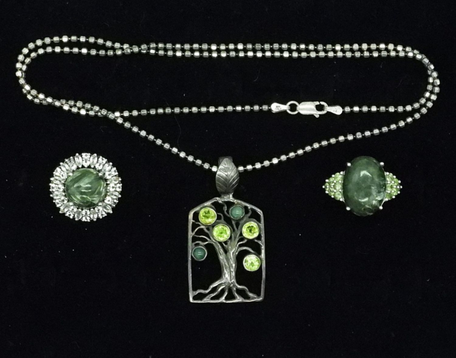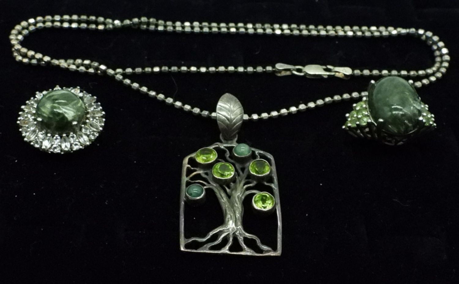 Sterling 21 inch Necklace, Tree Pendant with Peridot & Jade Like Gemstones. Two Size 8 Fashion Rings with Large Green Gemstones & White Accent Stones. 17.8DWT