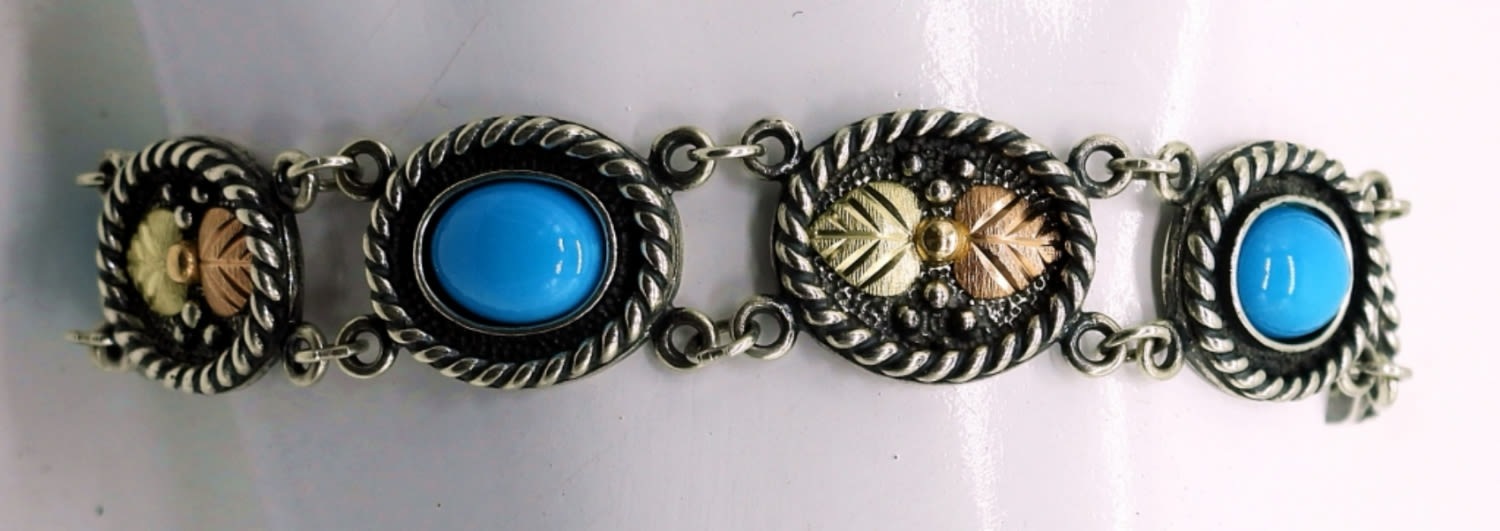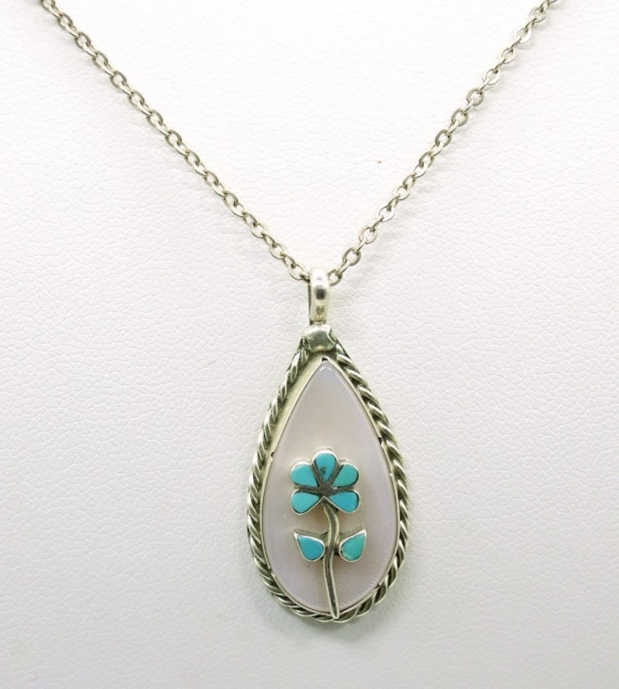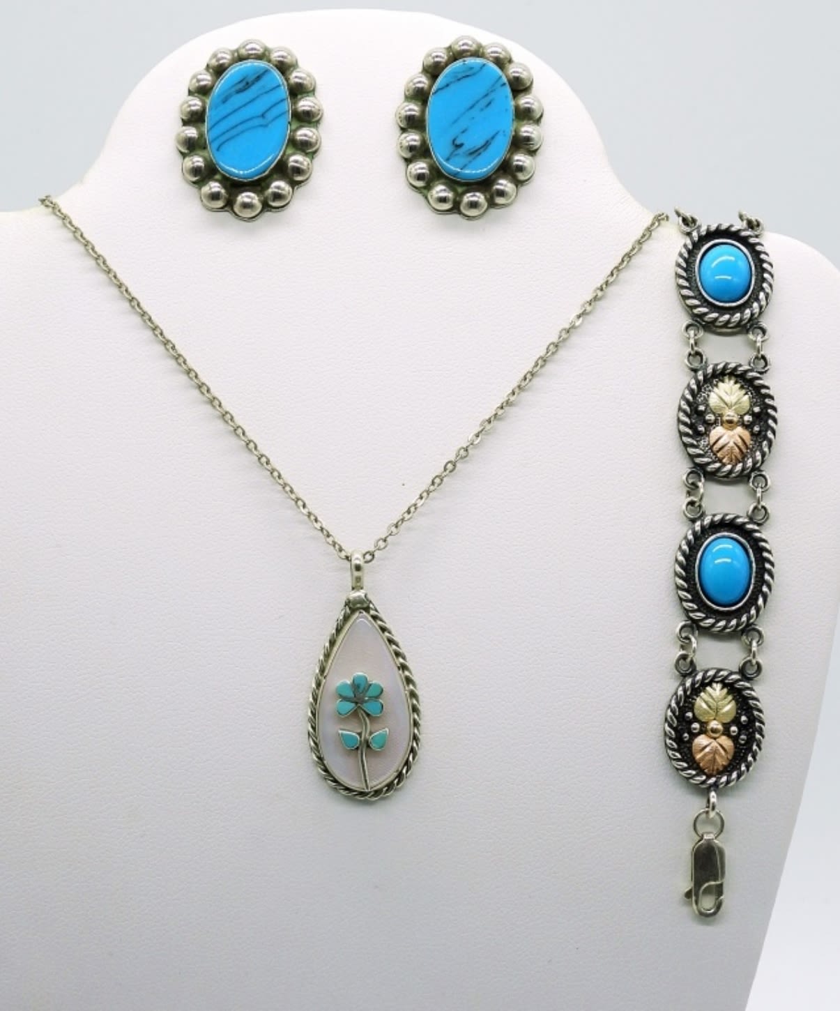Sterling & 10K Bracelet with Turquoise Colored Stones, Matching Pierced Earrings and 17 inch Mother of Pearl Necklace with Turquoise Colored Flower. 28.4DWT