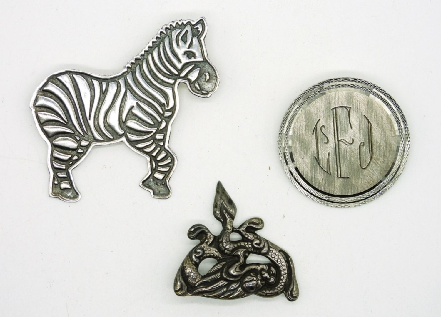 Vintage Sterling Silver Zebra Pin, Kraken Pin & Personalized “LEJ” pin. 14.9DWT