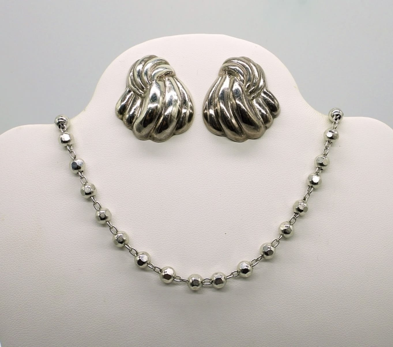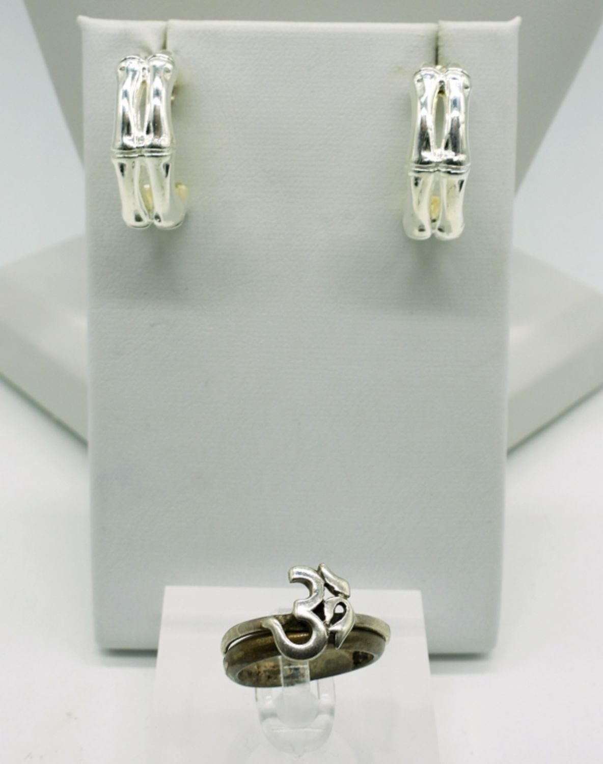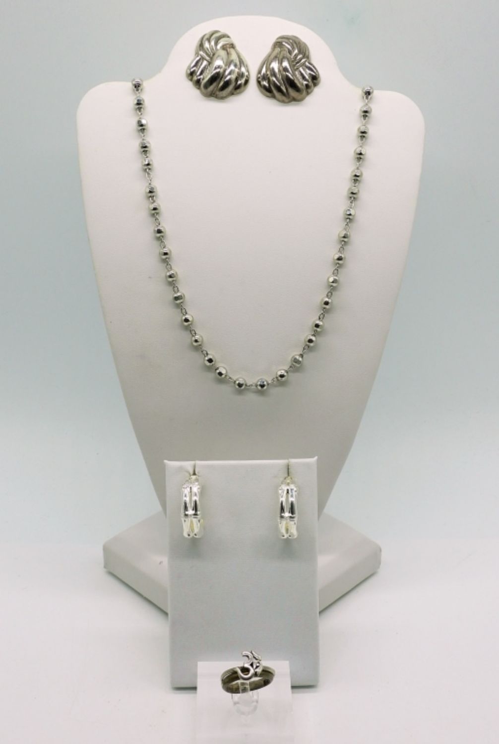 Sterling Size 8 OM Ring, Size 5 Sterling Band, Two Pair of Pierced Earrings in Sterling and a 16 inch Sterling Beaded Necklace. 24.3DWT