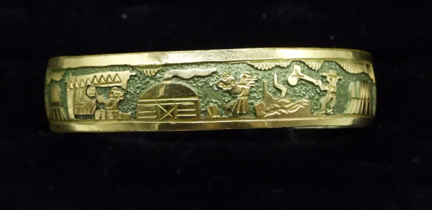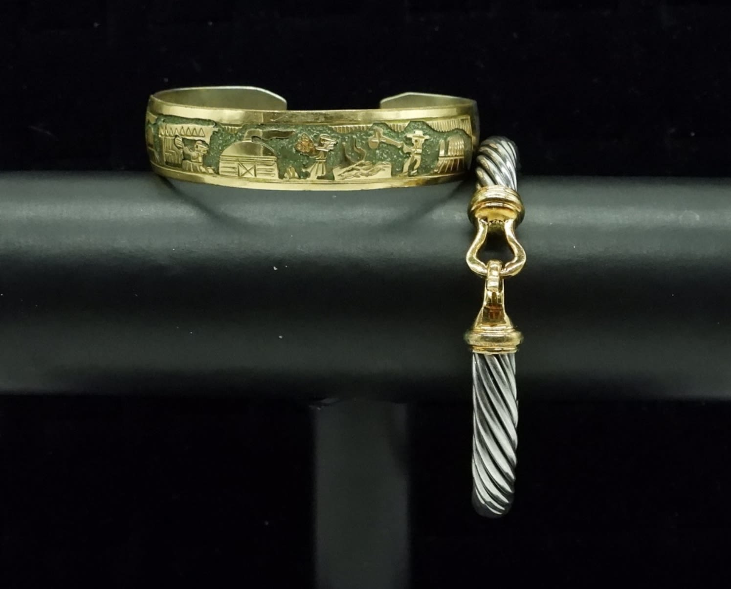 Sterling Cuff Style Bracelet with an etched farm scene, stamped inside with 1/20 12KGF TSK. Sterling Thick Bangle with Gold Tone Clasp. 37.5DWT