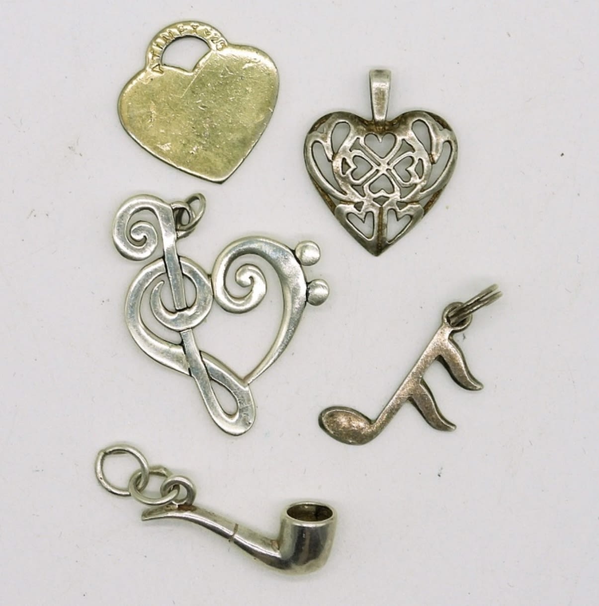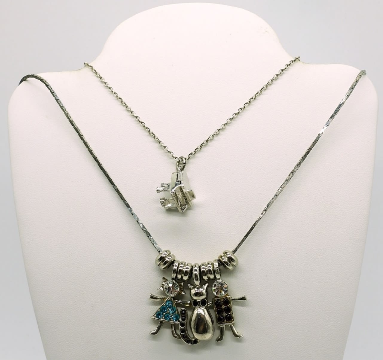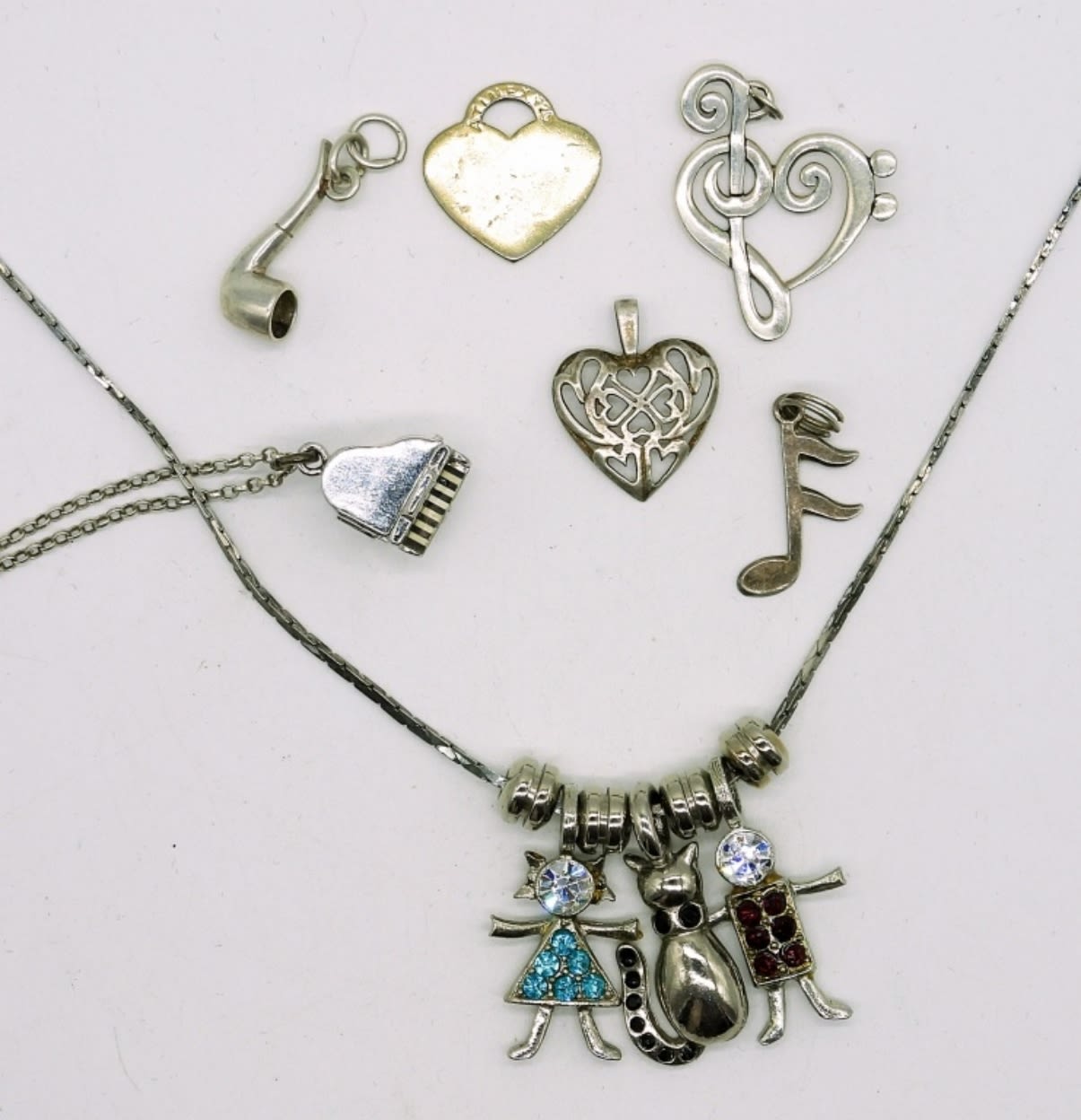 5 Sterling Gold and Silver Tone Pendants. Sterling Piano Charm on a Sterling 18 inch chain. Sterling Family Necklace with 3 characters on a Sterling 24 inch chain. 22.5DWT