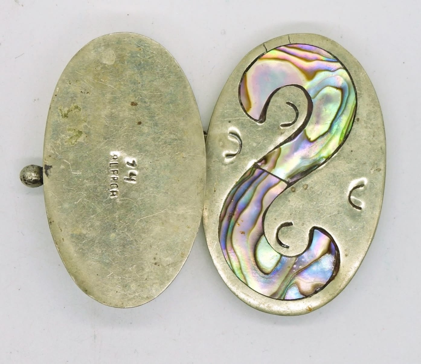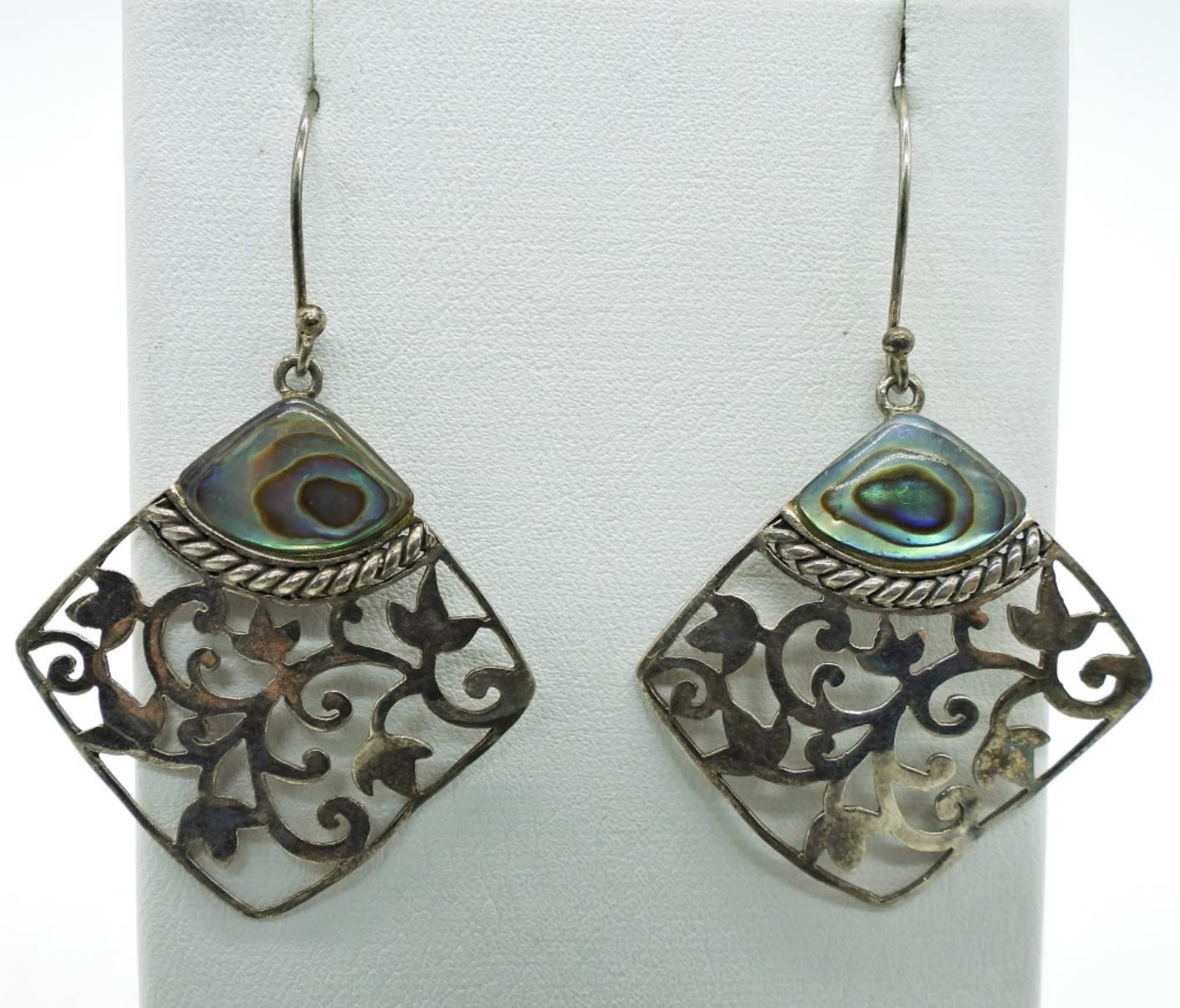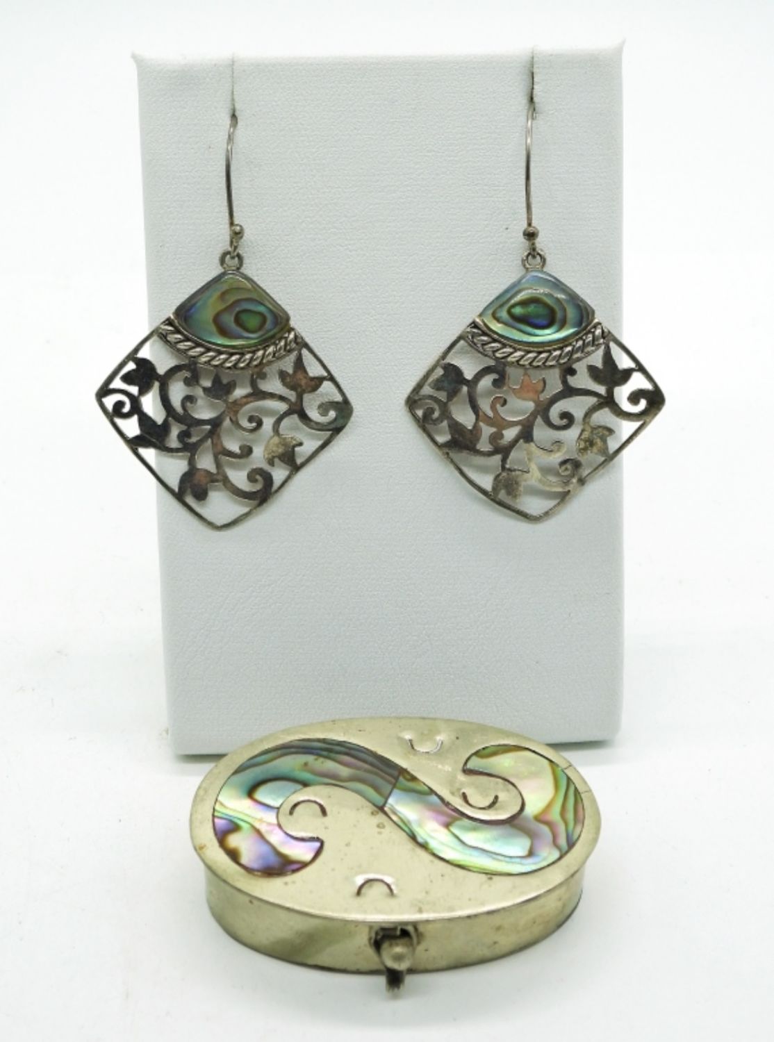 Vintage Sterling Abalone Drop Earrings and Abalone Inlay Trinket Box. 13.4DWT