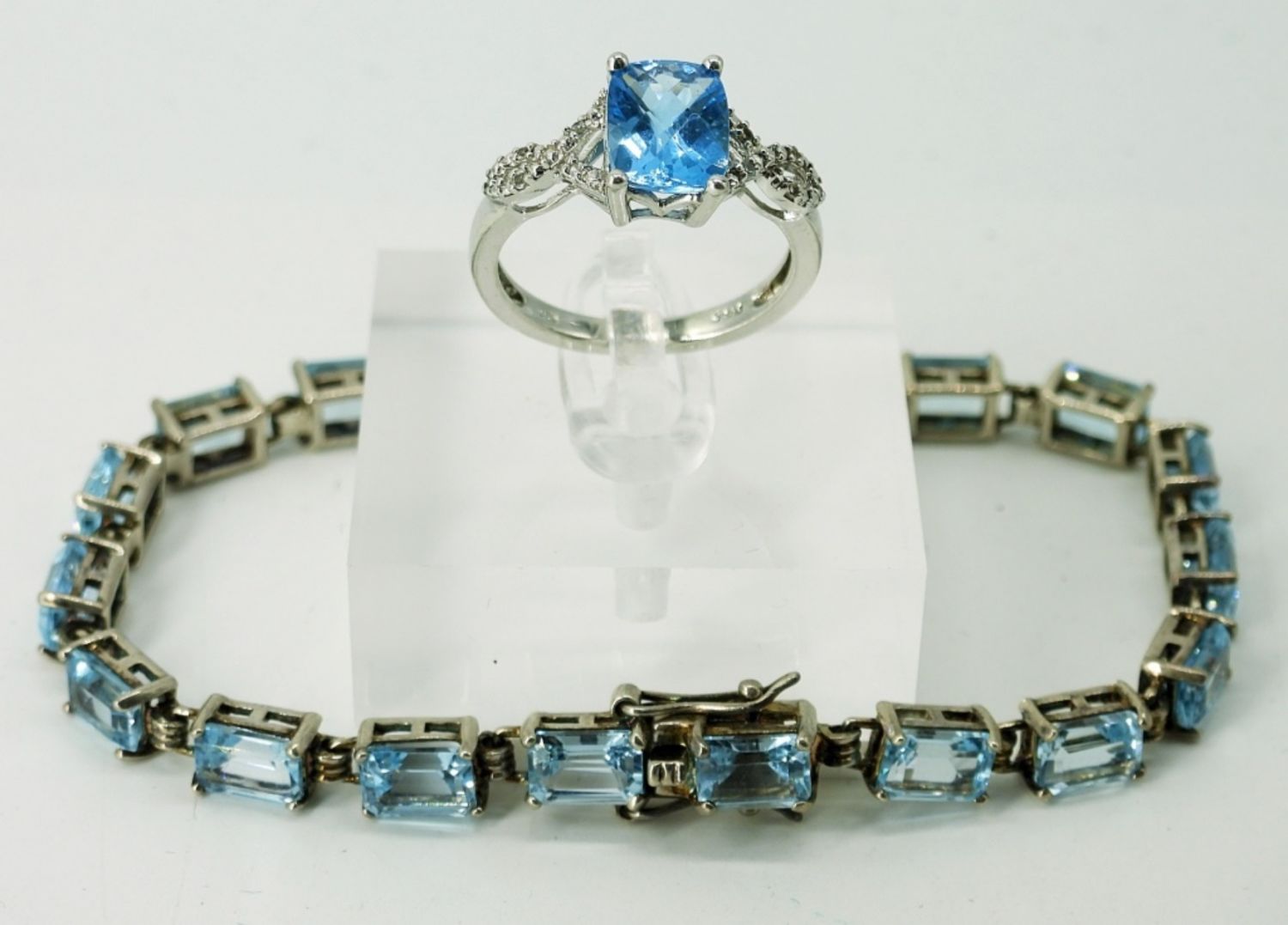 Square Cut Blue Topaz Colored Stones in Sterling Silver. Ring size 7.5 Necklace is 18 inches. Bracelet has Aquamarine Colored Gemstones, 7 Inches Length. Matching Earrings. 14DWT
