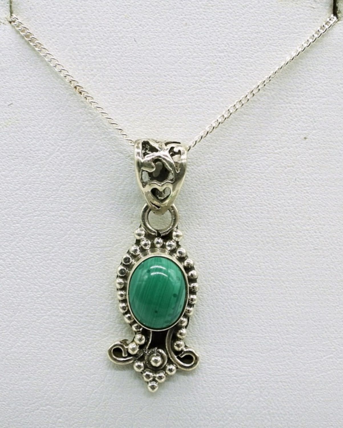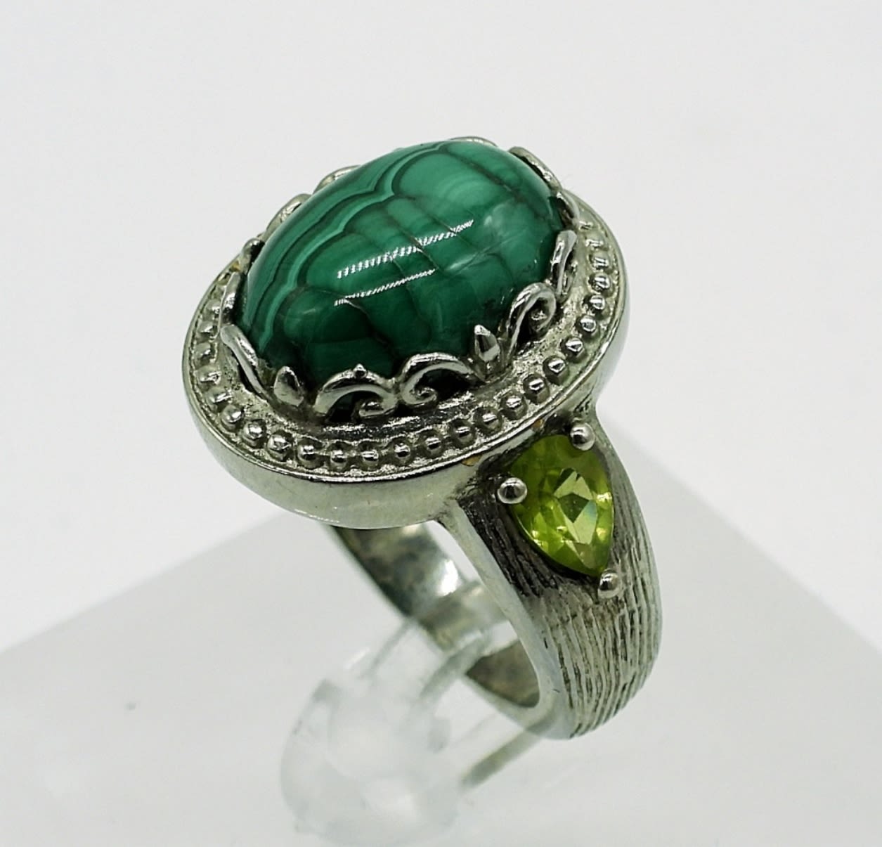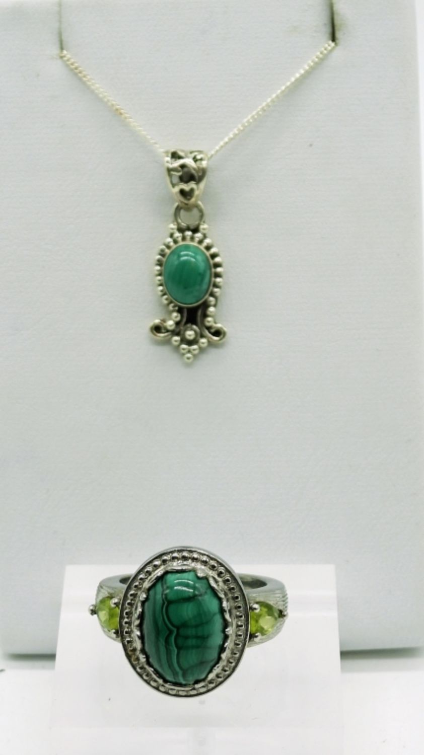 Sterling Malachite Set. Ring Size 8 with small Peridot Colored Stone Accents. Small Sterling Malachite Pendant on a 20 inch Sterling Chain. 7.9DWT