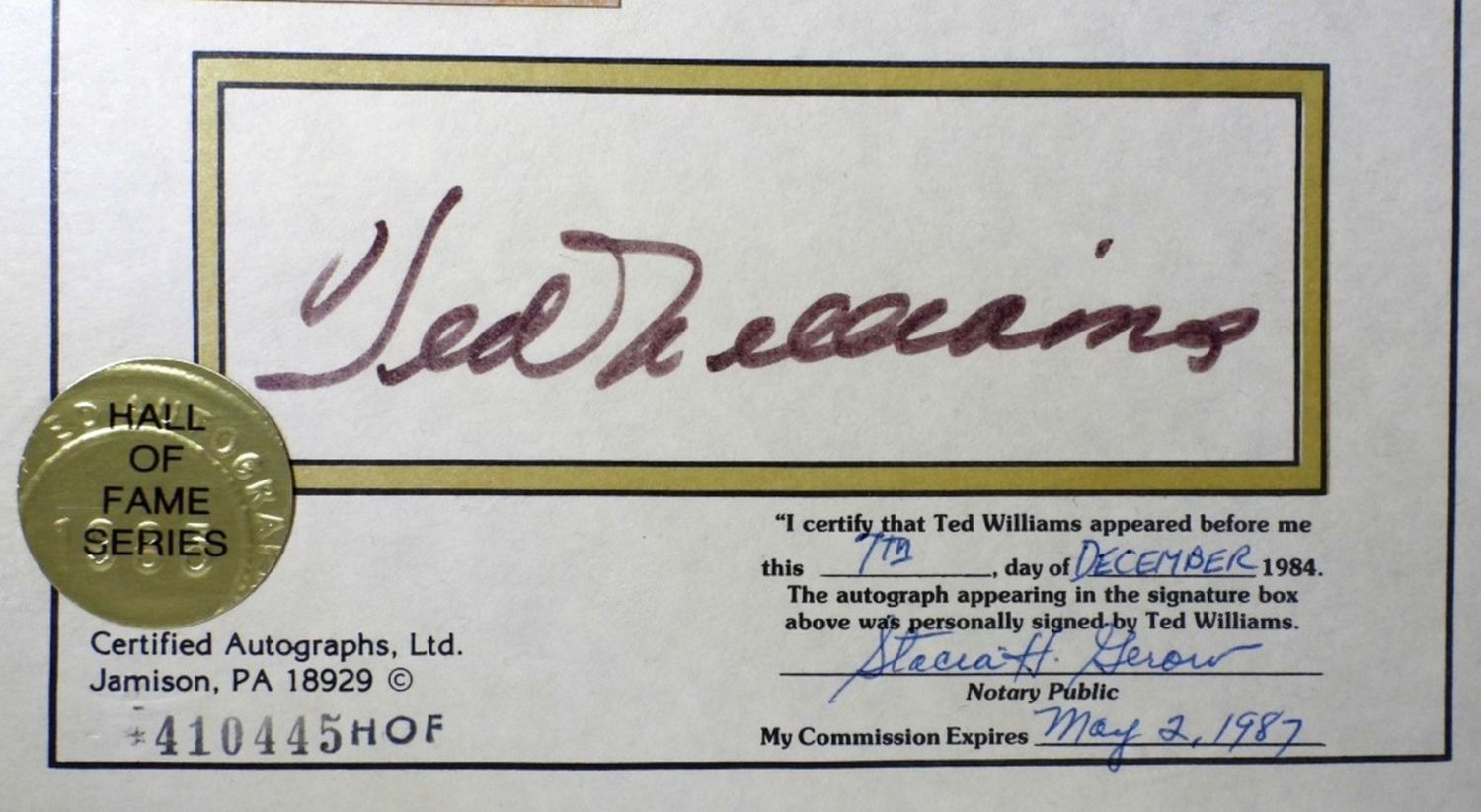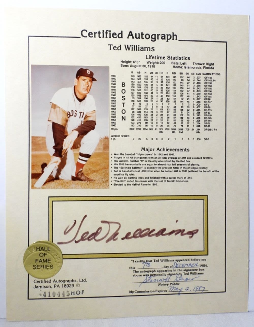 HALL OF FAME SERIES, SIGNED AND NOTARIZED ON DECEMBER 7TH 1984
