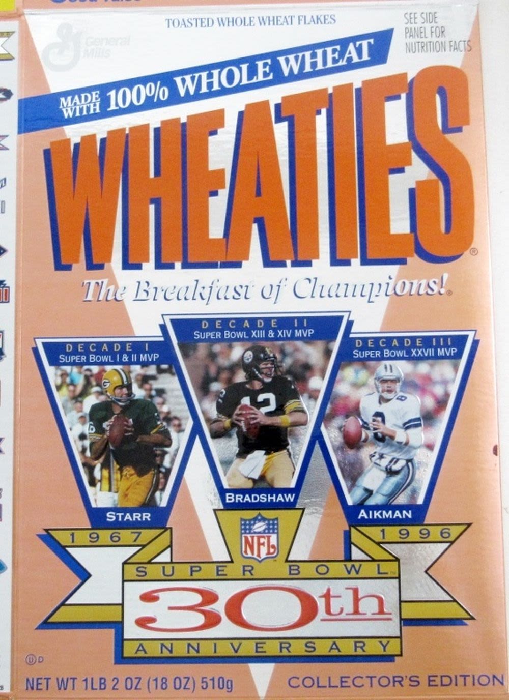 (3) WHEATIES NFL 75th ANNIV (1) WHEATIES 30th ANNIV SUPER BOWL & (1) VINTAGE KELLOGGS 1995