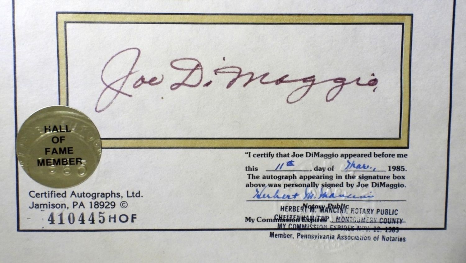 HALL OF FAME MEMBER, SIGNED AND NOTARIZED ON MARCH 11TH 1985