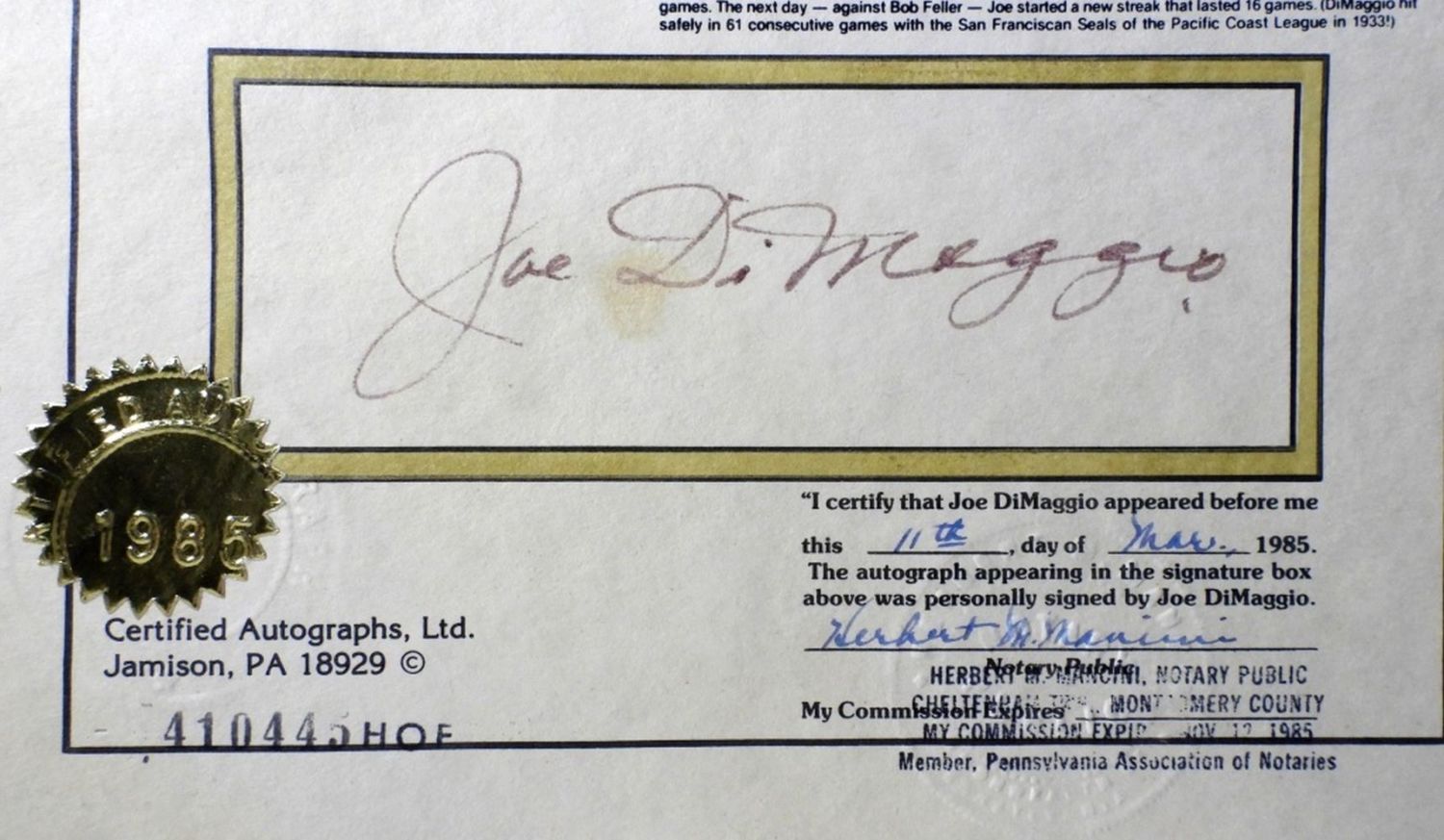 COMMEMORATING HIS 1941 56-GAME HITTING STREAK, SIGNED AND NOTARIZED ON MARCH 11TH 1985