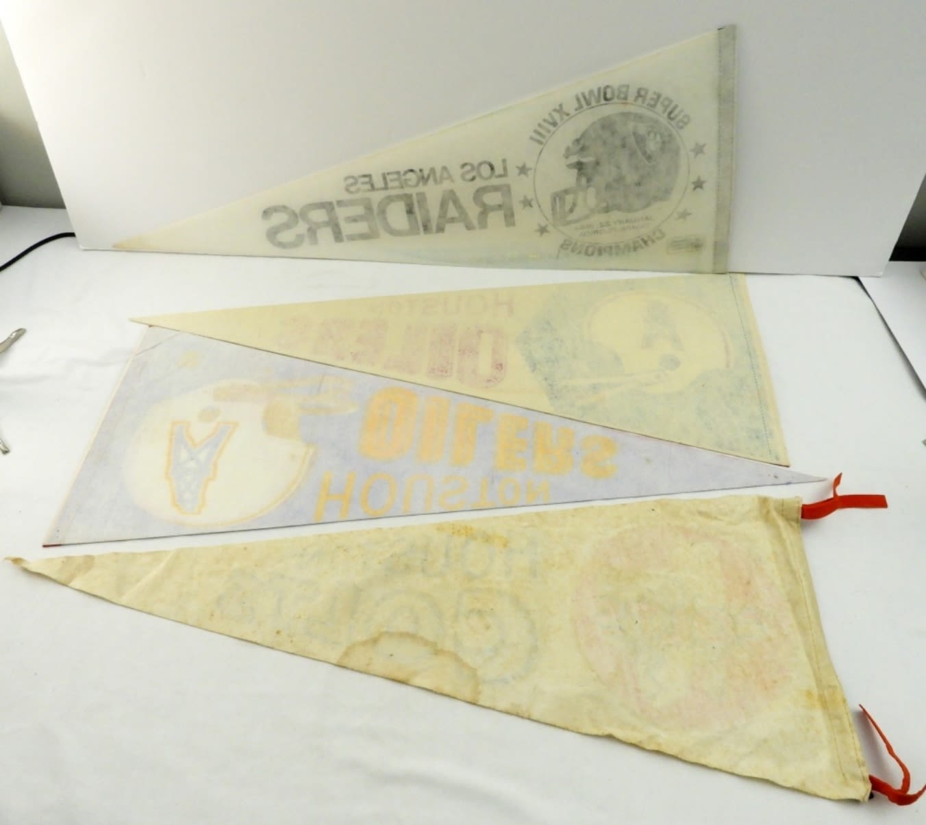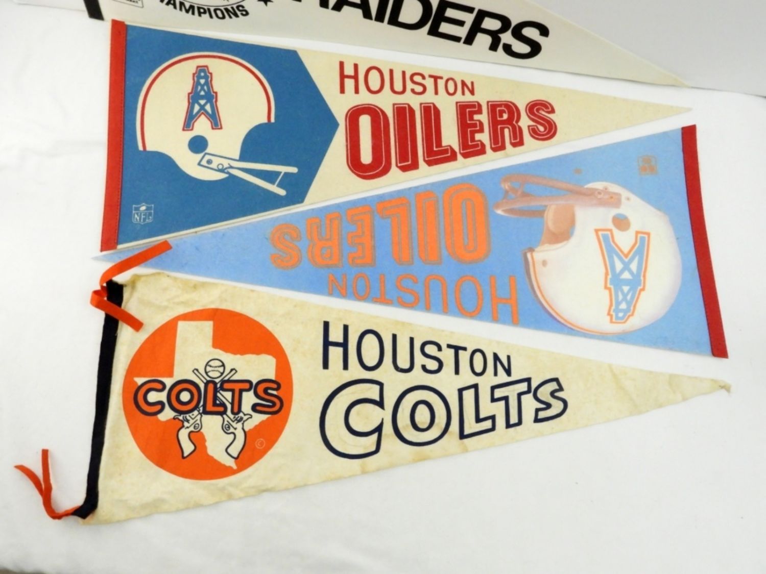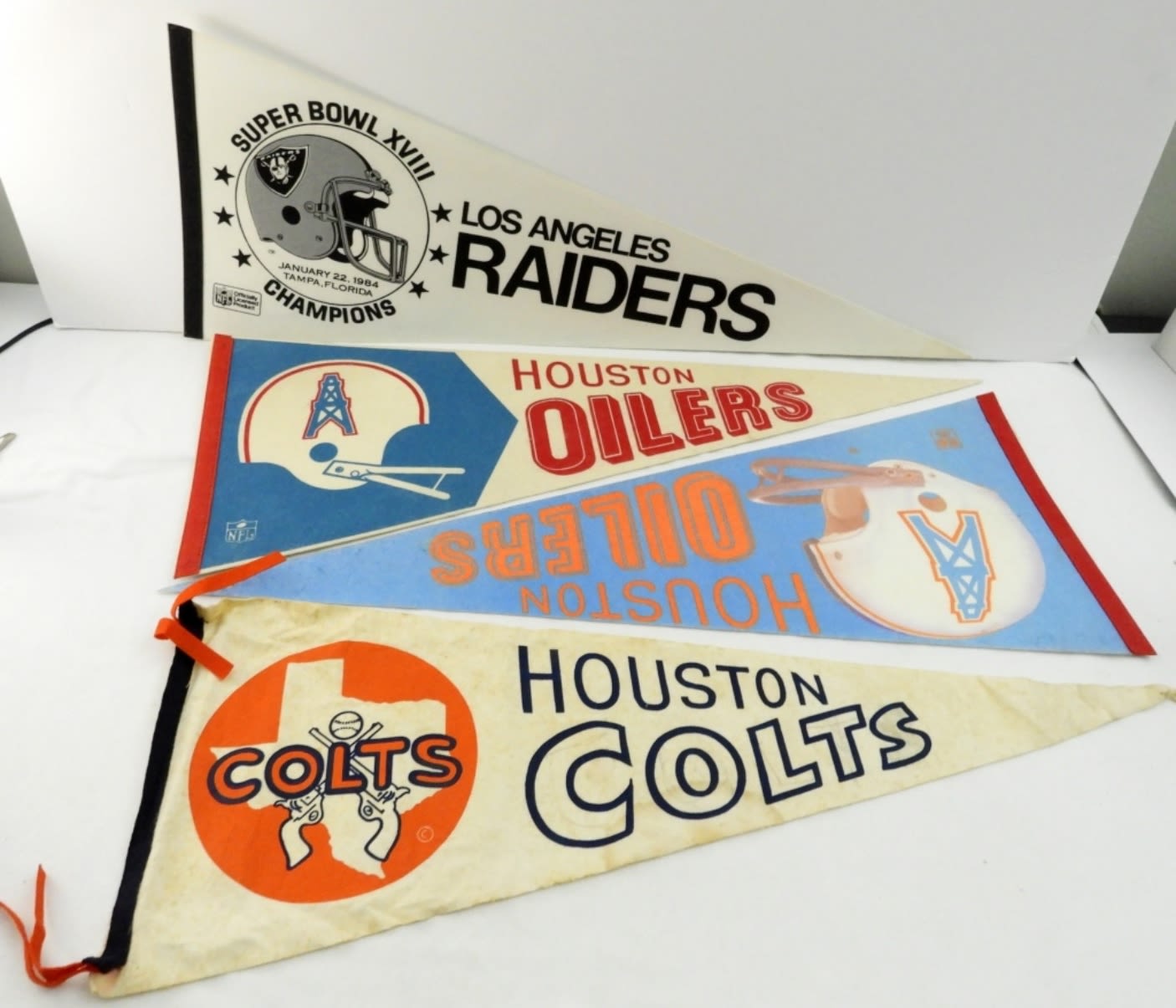 30X12, BOTH IN SLEEVES, NORMAL FADING FROM THE YEARS WITH SOME PIN HOLES FROM BEING HUNG UP, FROM THE NFL, PLUS A LOS ANGELES RAIDERS SUPER BOWL XVIII CHAMPIONS JANUARY 22 1984 NORAMAL WEAR FROM THE YEARS, HOUSTON COLTS IS MARKED UP AND WEAR FROM THE YEARS.