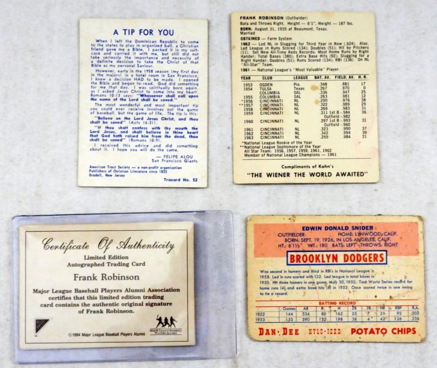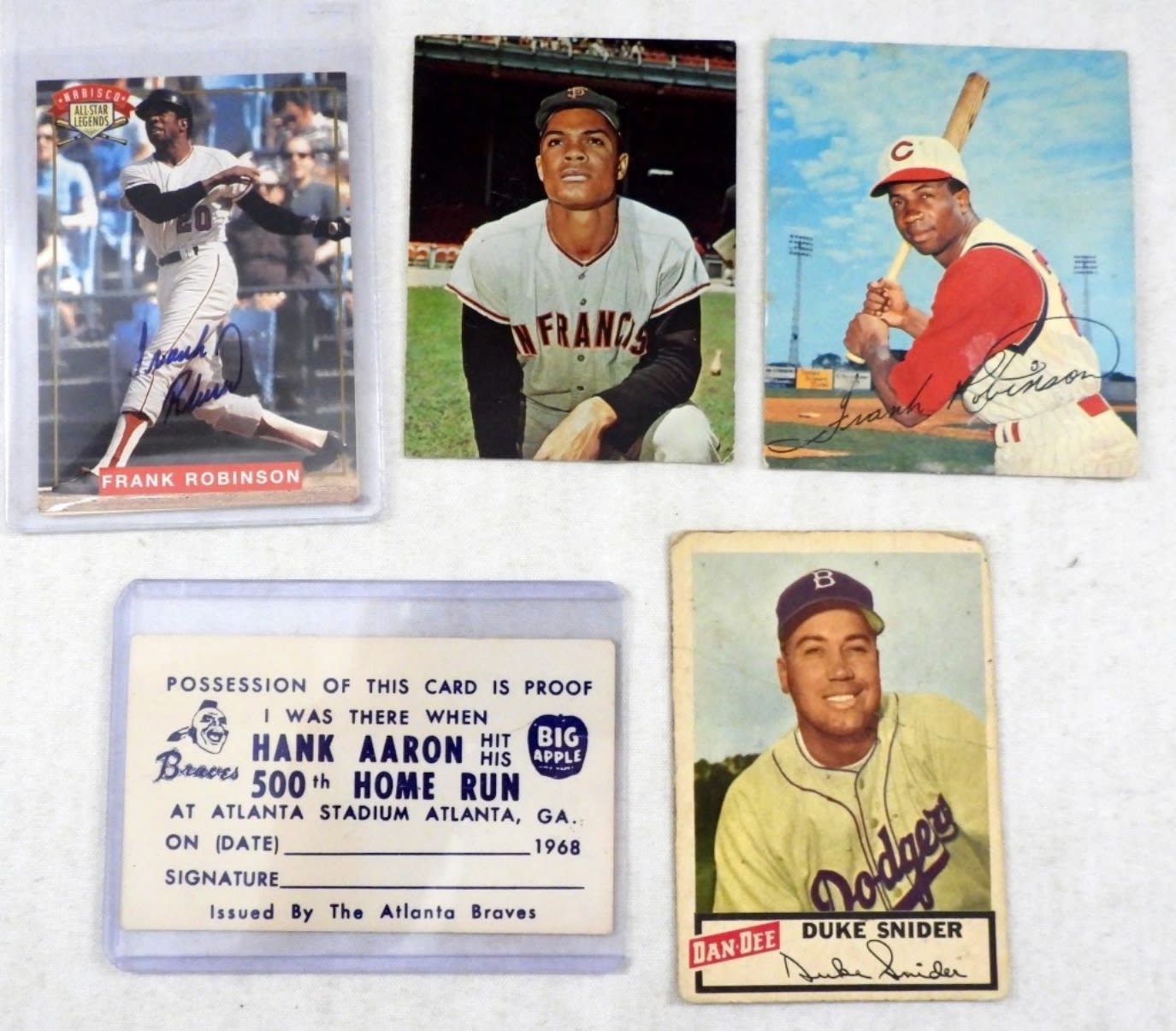 DUKE SNIDER FAIR, BIG APPLE HANK AARON 500th HOME RUN CARD, FELIPE ALOU CARD, FRANK ROBINSON AUTO CARD, KAHNS F. ROBINSON CARD