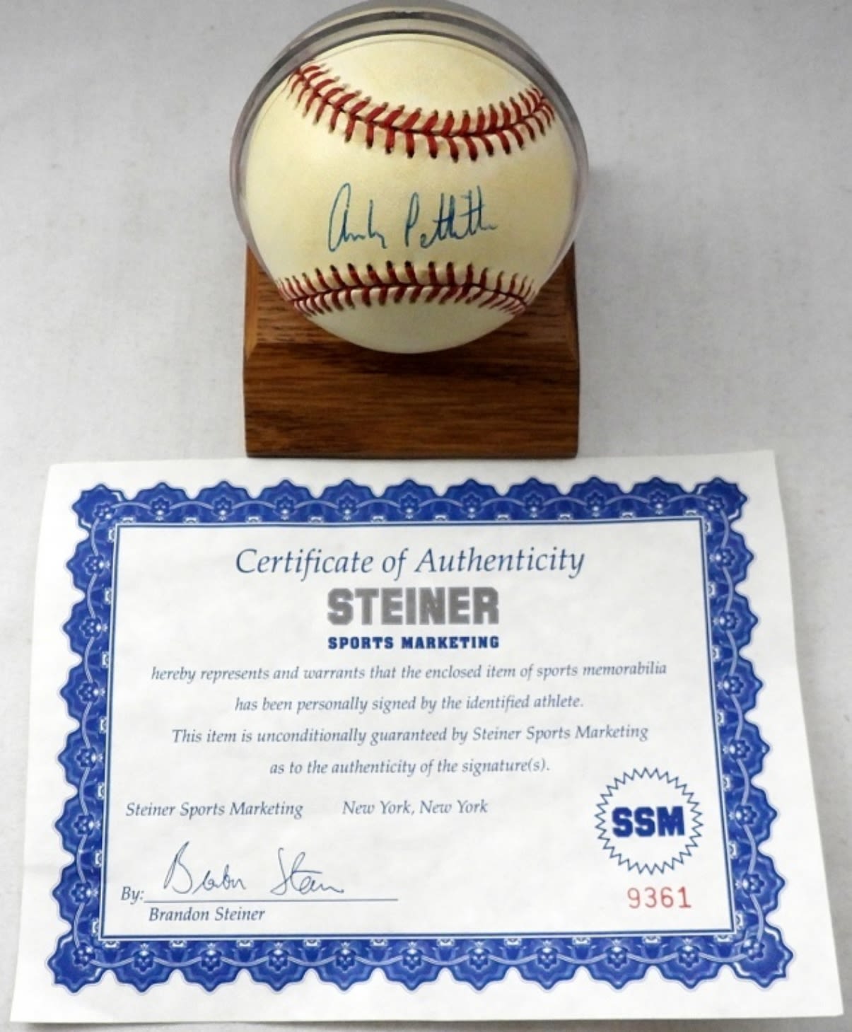 ANDY PETTITTE AUTOGRAPHED BASEBALL WITH COA BY STEINER SPORTS MARKETING – OFFICIAL AMERICAN LEAGUE BALL IN DISPLAY HOLDER
