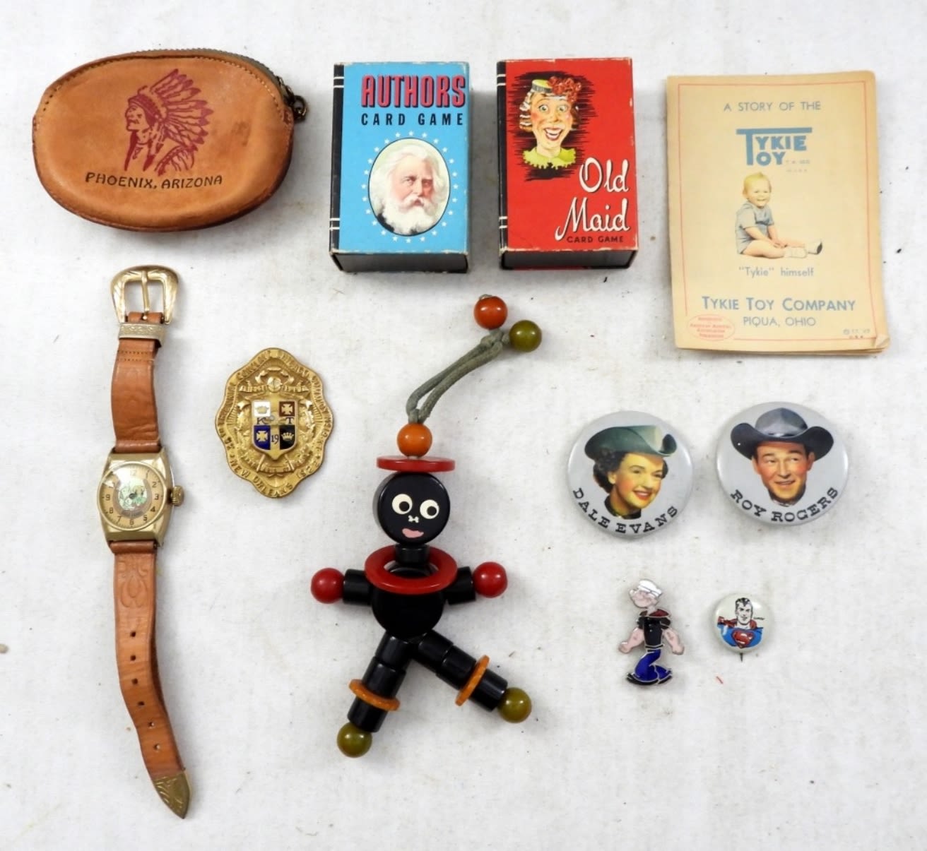 (2) VINTAGE CARD GAMES, 1922 BADGE, ARIZONA COIN PURSE, TYKIE TOY & MORE