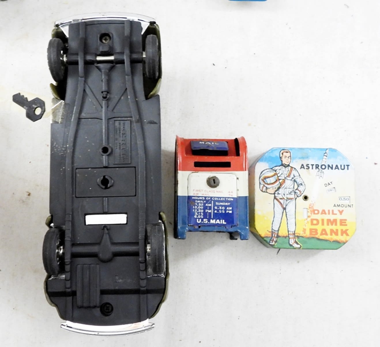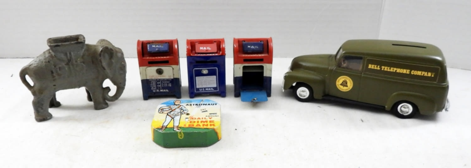 (3) POST OFFICE DROP BOXES, ASTRONAUT DAIL DIME BANK & BELL TELEPHONE COMPANY CAR BANK new in box